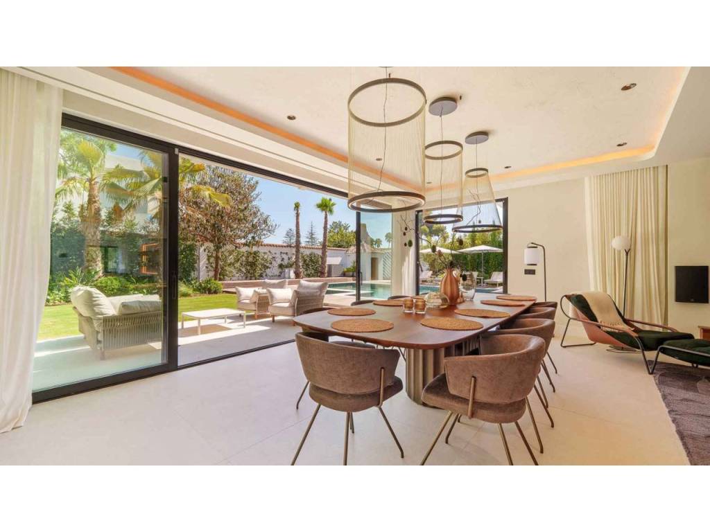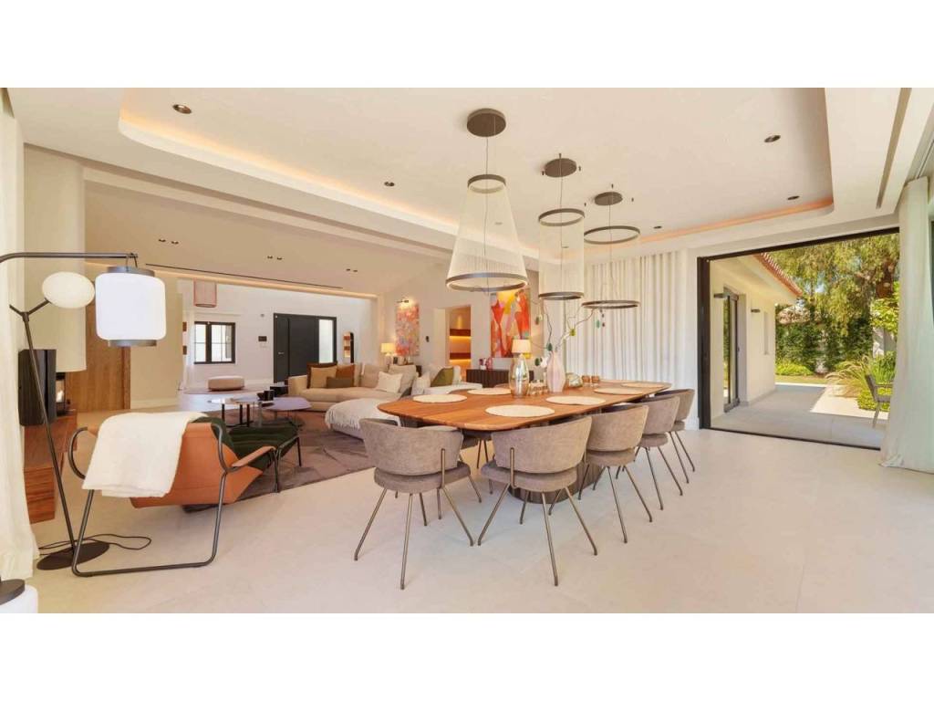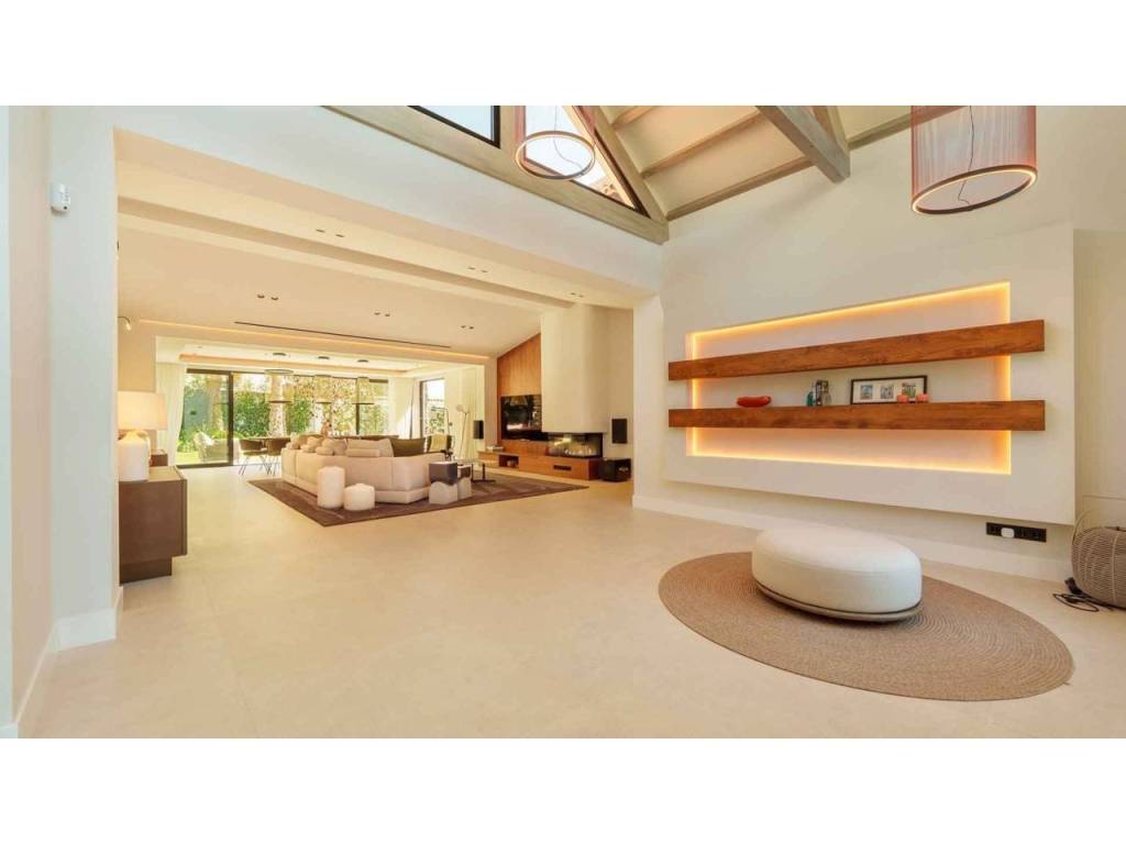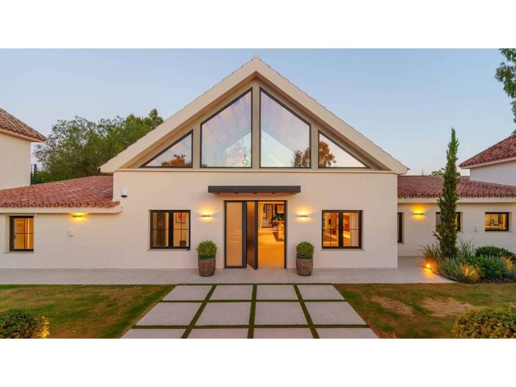 Villa cerca de Puerto Banús en una sola planta en venta. Ubicada a escasos minutos de la playa, esta villa de una sola planta combina privacidad, diseño moderno y funcionalidad en un entorno exclusivo. Situada sobre una amplia parcela rodeada de vegetación, la propiedad cuentaa con detalles arquitectónicos llamativos como su hall de entrada de doble altura con un techo geométrico distintivo. Las líneas modernas, los materiales de alta gama y la luminosidad natural en todos los espacios crean una atmósfera acogedora.