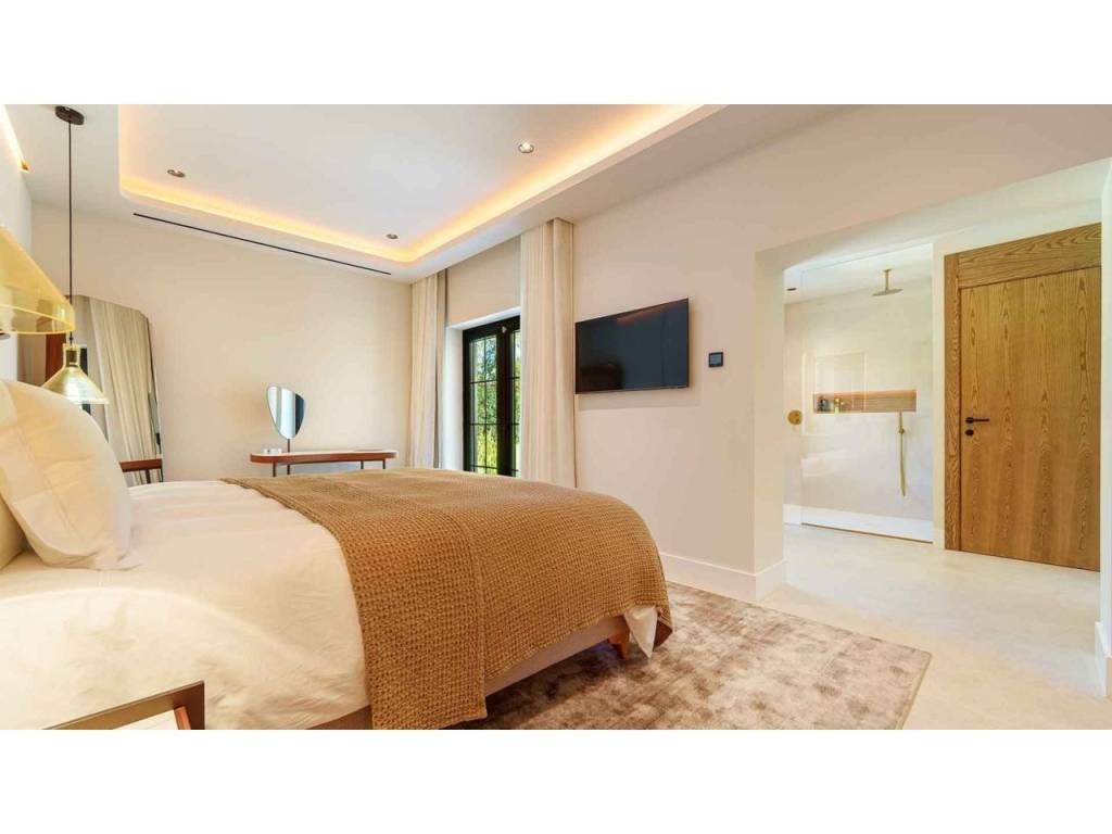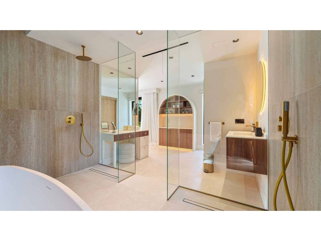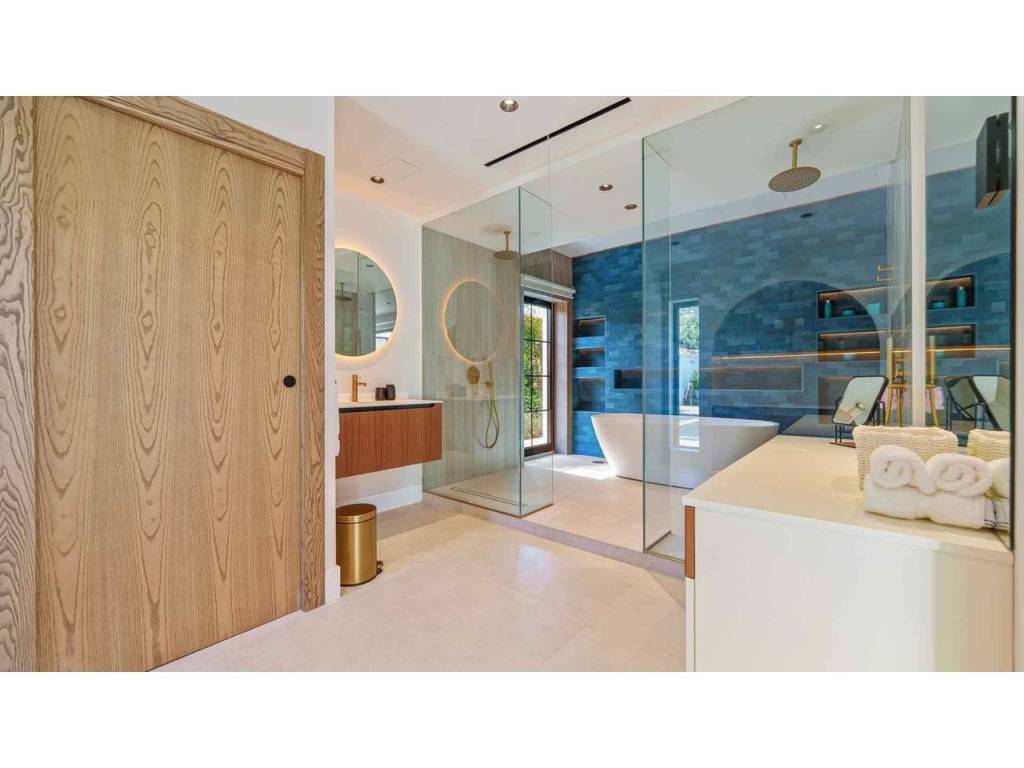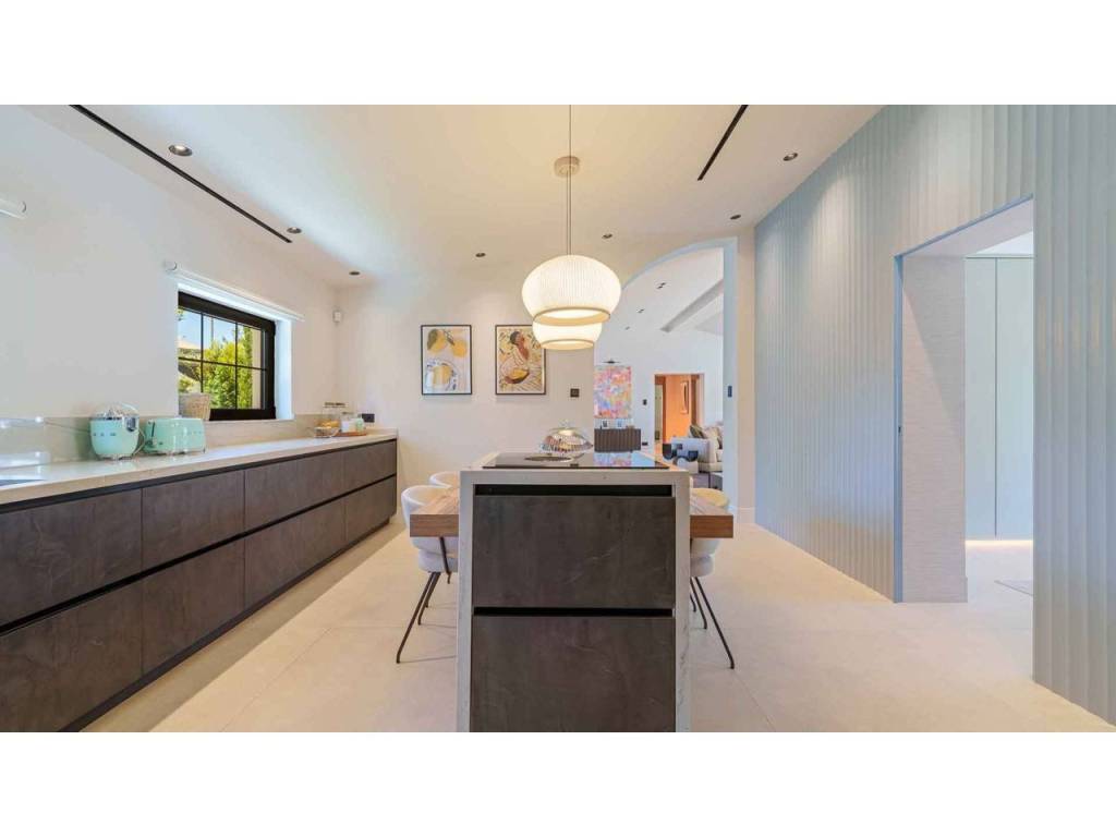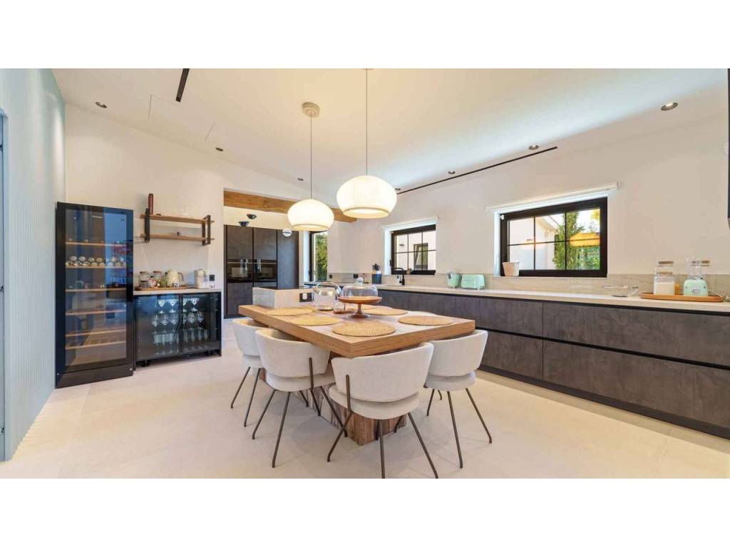 En el interior, el diseño de planta abierta incluye una cocina completamente equipada con isla central, un comedor amplio y un salón principal con chimenea, ideal para reuniones familiares. Cada una de las cinco habitaciones ha sido diseñada con amplitud y confort, destacando especialmente la suite principal, que se abre directamente a la terraza de la piscina y dispone de un baño en suite con acabados de lujo, incluyendo una bañera independiente.