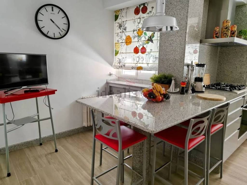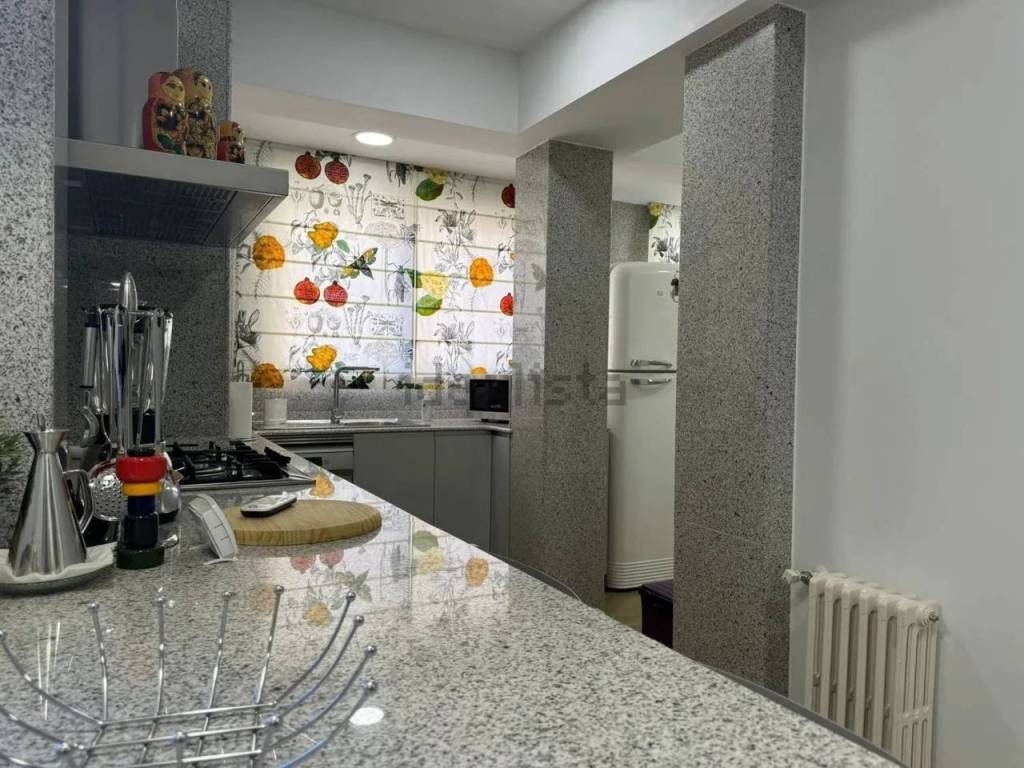 Cocina toda recubierta de granito cristal con mueble dispensa luminosa, con tres grandes ventanales