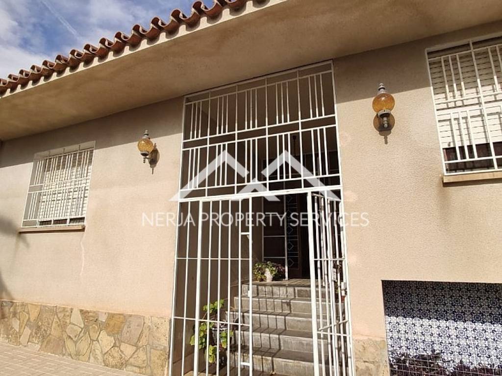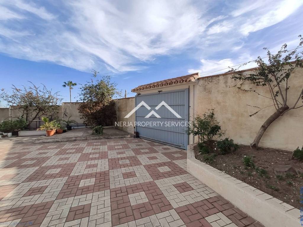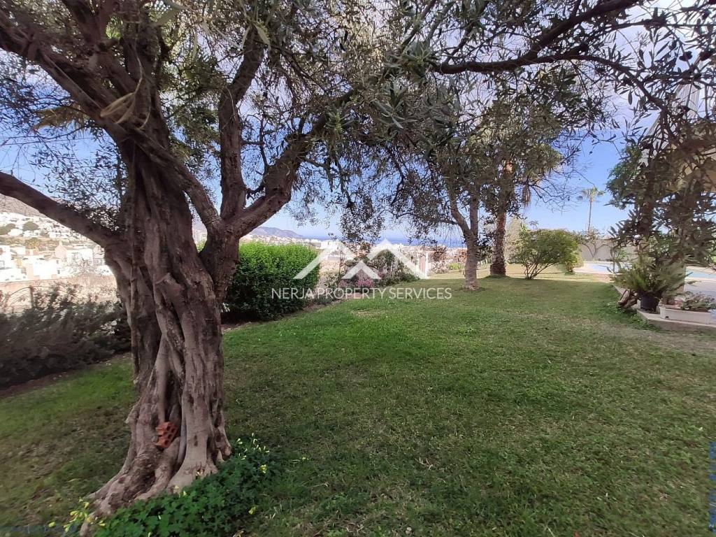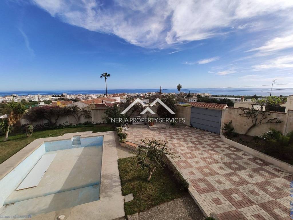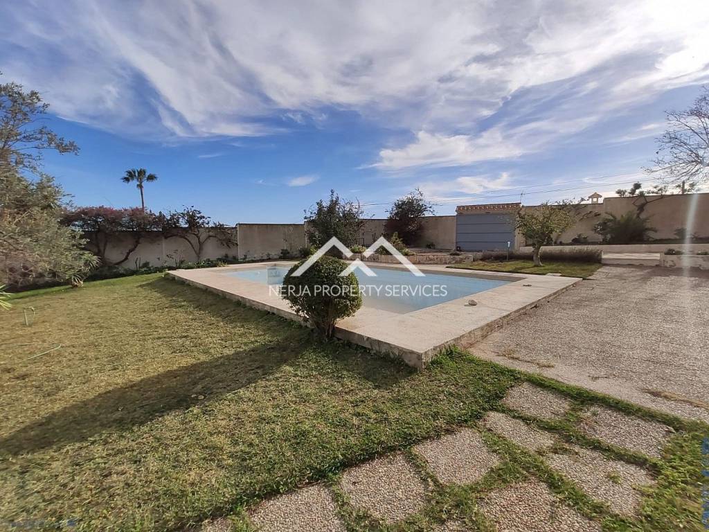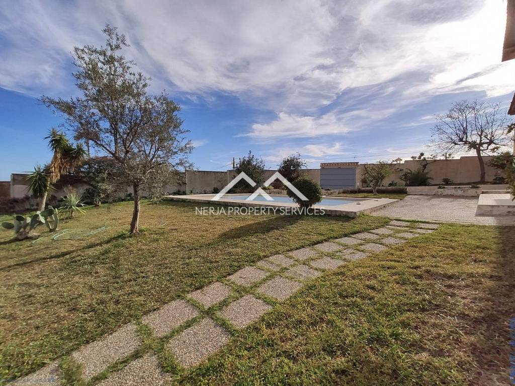 Magnifica casa situada a las afueras de Nerja en vía Castillo Alto, en una de las zonas más privilegiadas de Nerja, sobre una loma, con el mar a 1,5 kms y con la sierra a sus espaldas. Excelentes y relajantes vistas, que no se ven perturbadas por ninguna otra construcción. Se trata de una vivienda con más de 30 años de antigüedad, fue construida por sus propietarios que la han usado siempre como primera vivienda. La casa principal dispone de hall, 4 habitaciones, tres baños completos, salón comedor, cocina de unos 20m2, tres terrazas una de ellas acristalada con vistas al mar, deposito receptor de agua de lluvias, trastero. En la planta baja dispone de un amplio estudio con aseo, y apartamento para invitados, con concina, baño, y dormitorio independiente, porche y un amplio jardin de hierba natural. La casa dispone de jardines, piscina privada y dos plaza de garaje cubiertas. El propietario además era un arquitecto constructor de éxito en America, y este proyecto fue su vivienda donde disfrutar de su retiro. Las calidades de construcción son inmejorables, impensables para nuevas construcciones actuales, como demuestra entre otras cosas, el que la casa no tenga ni una mínima grieta, ni ningún otro desperfecto. En su interior se encuentran los mejores materiales disponibles en la época, como por ejemplo los mármoles de su amplio salón de más de 50m2, así como toda la cerámica e instalaciones de suministros. Evidentemente sus sanitarios, moquetas, carpinterías, no son nada actuales, pero con una pequeña inversión a nivel de decoración, se pueden obtener resultados fantásticos....