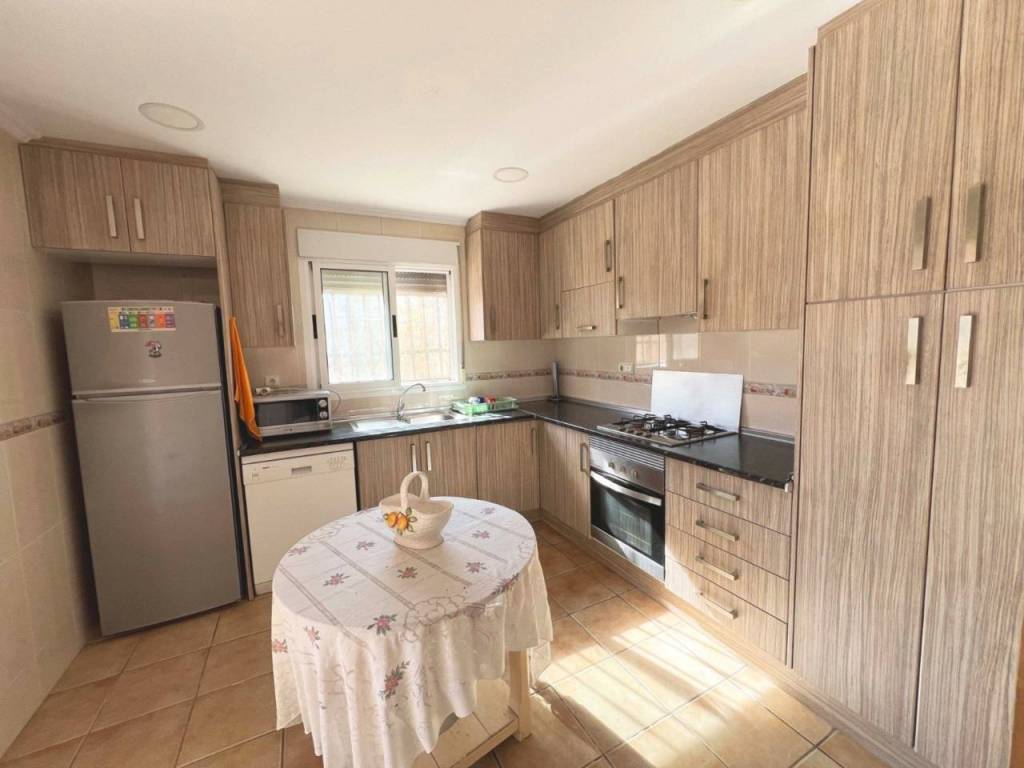 Todo en planta baja, con un amplio salón-comedor con chimenea de leña, ideal para reuniones familiares o momentos de descanso. La cocina ha sido renovada, y la casa dispone de 4 dormitorios y 2 baños. Además, cuenta con patio y trastero, calentador eléctrico, agua potable y electricidad, así como depósitos de agua de respaldo.