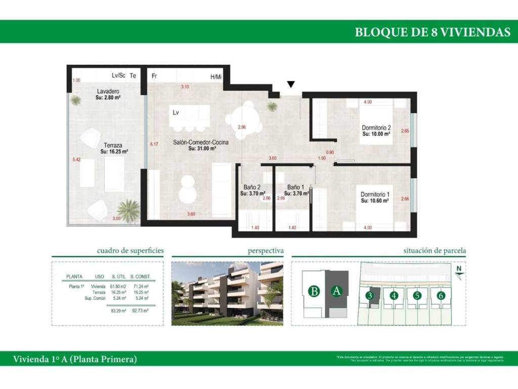 Los apartamentos tienen una superficie entre 73.88m2 y 75.22m2 repartidos en 2 dormitorios, 2 baños, un salón-cocina-comedor abierto de 26.80m2, 17m2 de terraza.