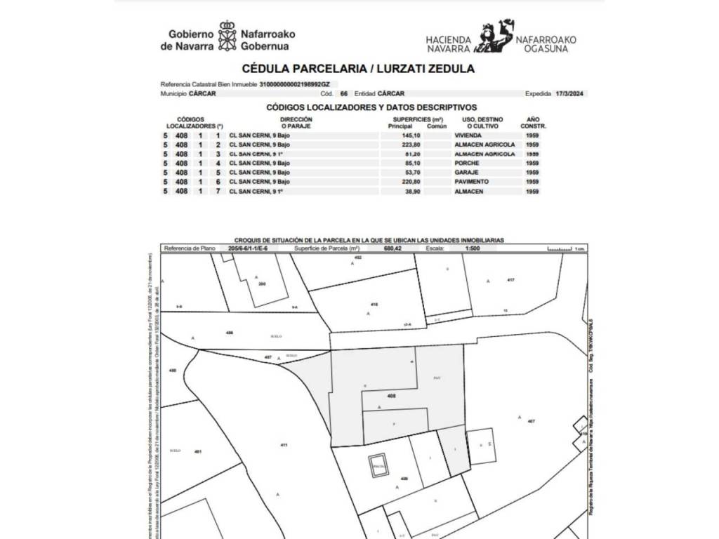 TU HOGAR EN CARCAR. UNIFAMILIAR INDEPENDIENTE CON GARAJE Y LOCALES PARA TUS HOBBIES Y MASCOTAS.Cárcar es un bonito pueblo de la Comunidad Foral de Navarra, situado en la Merindad de Estella, población de la que dista 37 km y a su vez se encuentra a 65 km de Pamplona.En una zona tranquila y residencial de la localidad de Cárcar se encuentra esta impresionante casa independiente en venta, construida en una respetable parcela de 680 m2 y con una superficie construida de 550 metros ésta propiedad ofrece un amplio espacio para disfrutar de la familia y de tus hobbies y aficiones.Con un total de 5 habitaciones y dos baños, ésta casa es ideal para aquellos que buscan confort y privacidad en un entorno tranquilo y acogedor. Además, cuenta con varios garajes y trasteros para la comodidad y almacenamiento. La vivienda dispone de dos entradas, una en la parte frontal por escaleras y otra en la parte trasera por rampa , con lo que se han suprimido en parte las barreras arquitectónicas.Pasamos a describir todas las unidades de la finca:1- Vivienda de 145 metros construidos, distribuida en 5 dormitorios, dos baños y una gran cocina comedor.2 y 3- Dos almacenes agrícolas que suman 300m2.4- Porche de 85 m2 donde podrás tener tus vehículos y maquinaria resguardados.5- Garaje de 53m2 .6- Pavimento alrededor de la casa y patio interior de 220m2.7- Almacén de 38m2.La cubierta se encuentra en buen estado y la carpintería exterior es variada, con ventanas de pvc en la cocina/comedor y contraventanas aluminio y ventanas de madera en el resto de las estancias.Ubicada en una zona residencial, esta propiedad destaca por su amplitud y luminosidad, creando un ambiente cálido y acogedor en cada rincón. Con una distribución inteligente y espacios bien aprovechados, esta casa independiente es perfecta para familias que buscan un lugar donde sentirse realmente en casa. Además, su ubicación en Cárcar ofrece la tranquilidad de un pueblo navarro y la comodidad de contar con todos los servicios necesarios a pocos minutos de distancia.Desde el primer momento en que pongas un pie en esta propiedad, te enamorarás de sus detalles cuidados y su diseño único. Cada habitación ha sido pensada para ofrecer el máximo confort y funcionalidad, creando un ambiente armonioso y acogedor en cada espacio.No pierdas la oportunidad de visitar esta casa independiente en Cárcar a UN PRECIO MÁS QUE COMPETITIVO y descubre todo lo que tiene para ofrecerte. ¡Llámanos hoy mismo para concertar una visita y comienza a hacer realidad tu sueño de tener la casa perfecta para ti y tu familia!Informamos a nuestros clientes compradores que el precio de venta no incluye lo siguiente: honorarios de la agencia al comprador, impuestos (I.T.P., I.V.A. o A.J.D. en su caso) ni otros gastos de compraventa (Registro de la Propiedad, Notaría, Gestoría ni de posible Financiación).