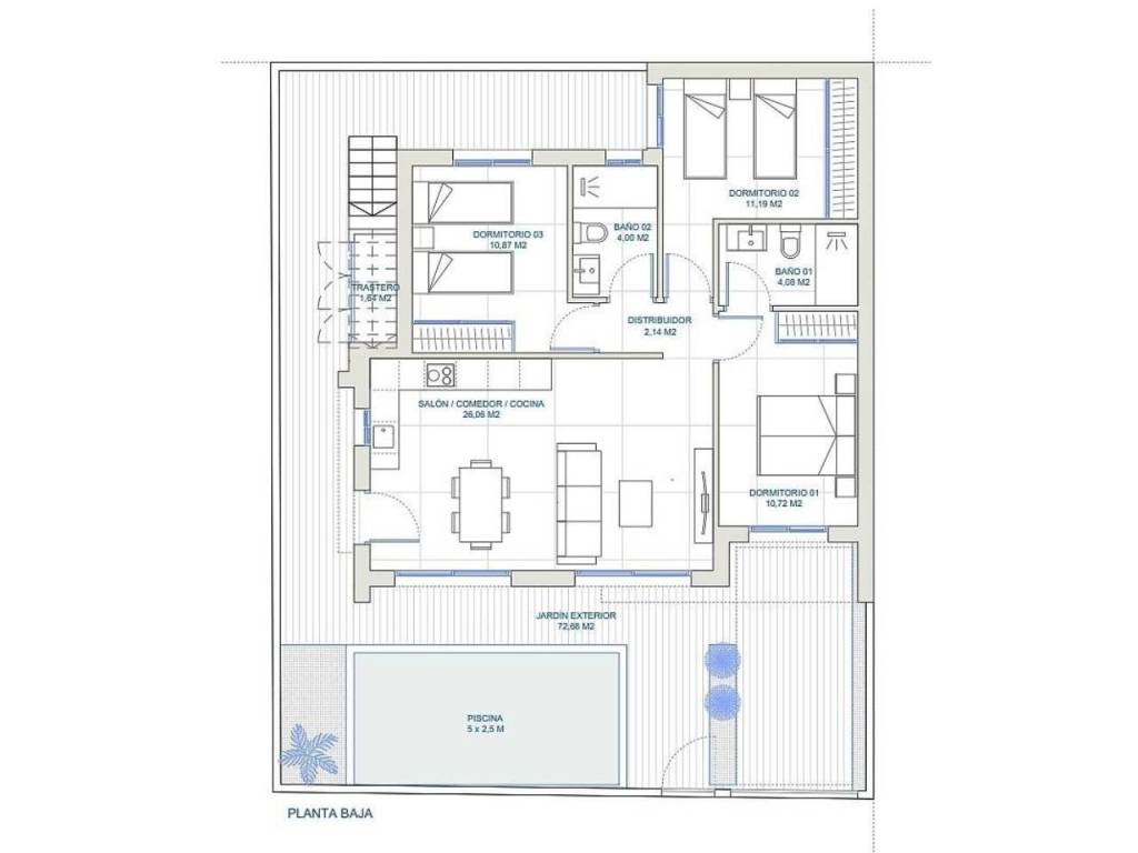 La vivienda con estilo en una planta con terraza en planta baja y amplio solárium en planta primera que permiten disfrutar de todas las horas de sol, todos los días de año. Aislamiento térmico de alta eficacia energética para viviendas con bajo consumo de energía, Carpintería exterior en Aluminio color blanco y vidrios dobles con protección solar óptima y laminados en las ventanas hasta el suelo. Correderas en comedor y abatibles oscilo batientes en dormitorios. Piscina individual con luz y con ducha, garaje y trastero.