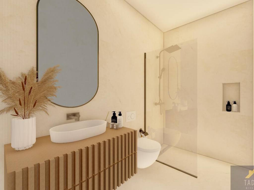 Baños con muebles, espejos, luz, mamparas y columna de ducha tipo Rain