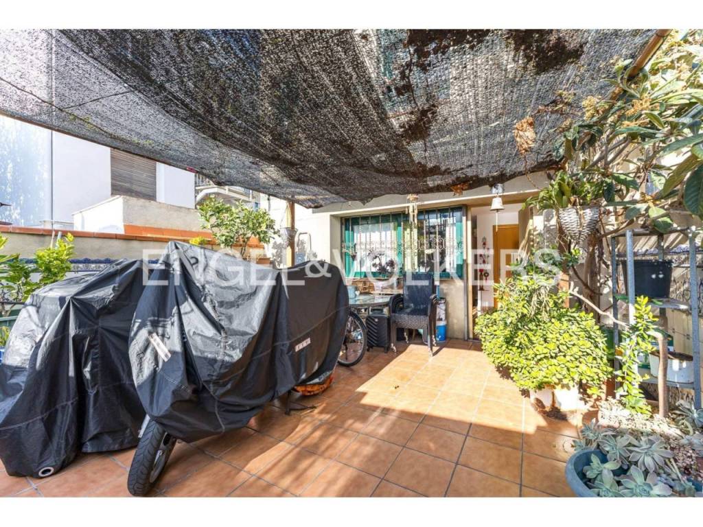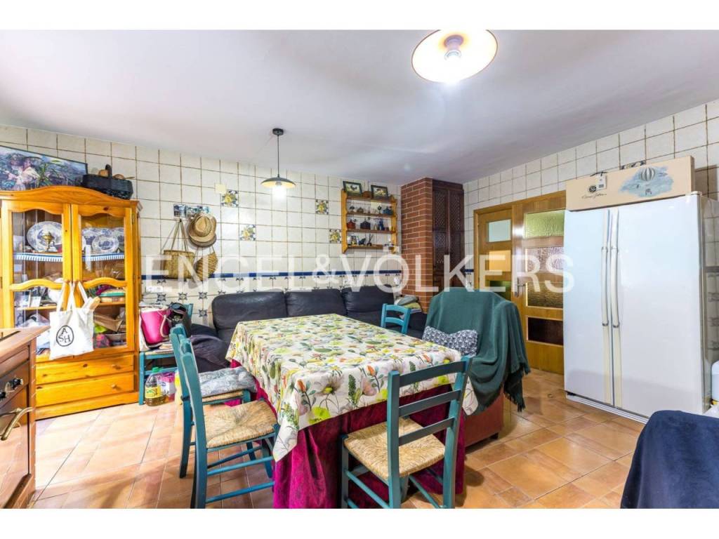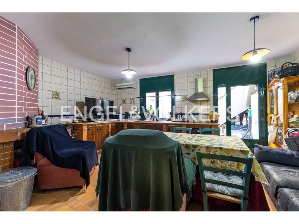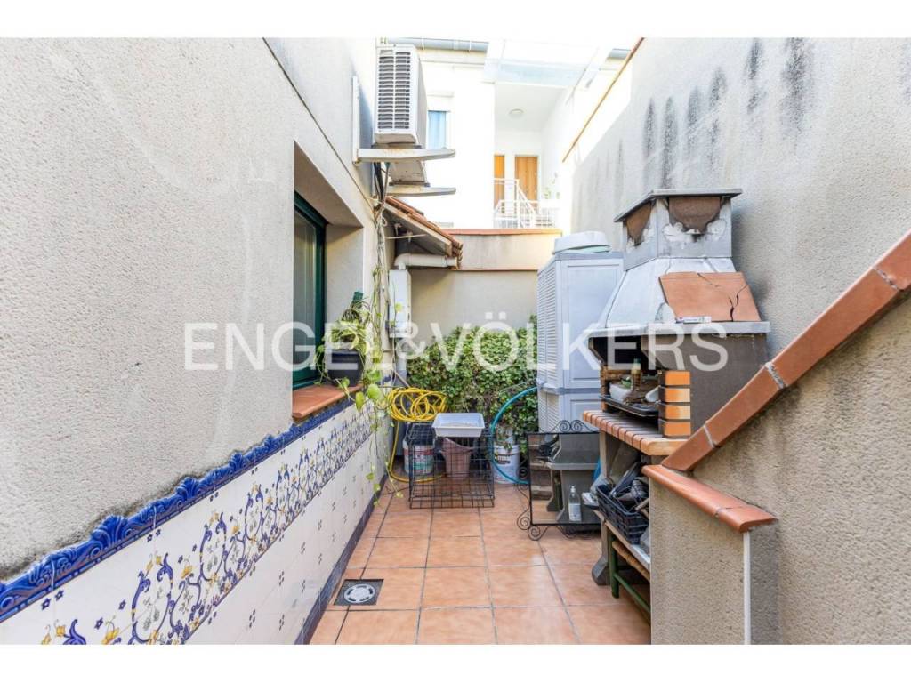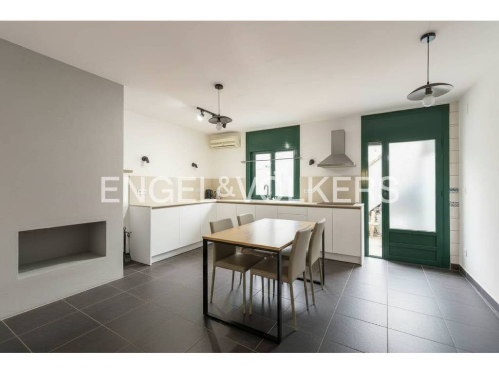 Planta baja: salón de 25 m² con chimenea, cocina grande de 20 m² también con chimenea, patio con barbacoa, baño completo y acceso directo a la terraza a nivel de calle.