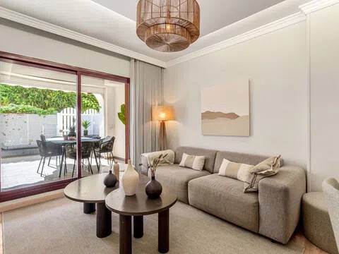 �️ Elegante Planta Baja a 150m de la Playa en Urbanización Noray, San Pedro de Alcántara Elegante apartamento en planta baja ubicado a solo 150 metros de la playa, con orientación oeste para disfrutar de luz natural y espectaculares puestas de sol. Una propiedad que combina comodidad y encanto costero, destacando por su amplia terraza privada con acceso directo al jardín comunitario. La vivienda cuenta con una superficie interior de 86 m² distribuida en cuatro dormitorios y tres baños en suite, todos renovados con una estética limpia de inspiración escandinava. La zona de día se compone de una sala de estar de planta abierta diseñada para maximizar la funcionalidad, conectando a través de grandes puertas correderas con una terraza de 61 m². La cocina está totalmente equipada con electrodomésticos Balay y el apartamento incluye detalles de alta calidad como persianas eléctricas, acabados modernos y una distribución que garantiza el confort diario. Situado en la consolidada Urbanización Noray, este complejo cerrado y seguro ofrece privacidad, jardines paisajísticos impecablemente cuidados y una piscina comunitaria que evoca un ambiente de resort. La propiedad incluye una plaza de aparcamiento cubierta designada. Su ubicación en San Pedro de Alcántara permite acceder a pie a supermercados, cafeterías y servicios médicos, además de estar a pocos minutos de Puerto Banús y de prestigiosos campos como el Real Club de Golf Guadalmina. La zona ofrece una conectividad excelente mediante la N-340 y AP-7, situando el Aeropuerto de Málaga a menos de 45 minutos. Con colegios internacionales de renombre como Laude San Pedro y Aloha College en las cercanías, este apartamento es ideal tanto para residencia permanente como para inversión. Contáctenos hoy mismo para programar una visita y descubrir su próximo hogar junto al mar.