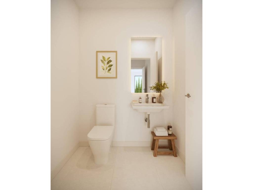 Vivienda con tres dormitorios, dos baños completos y un aseo con acceso a zonas exteriores de jardín y terraza en la planta baja de esta unidad.