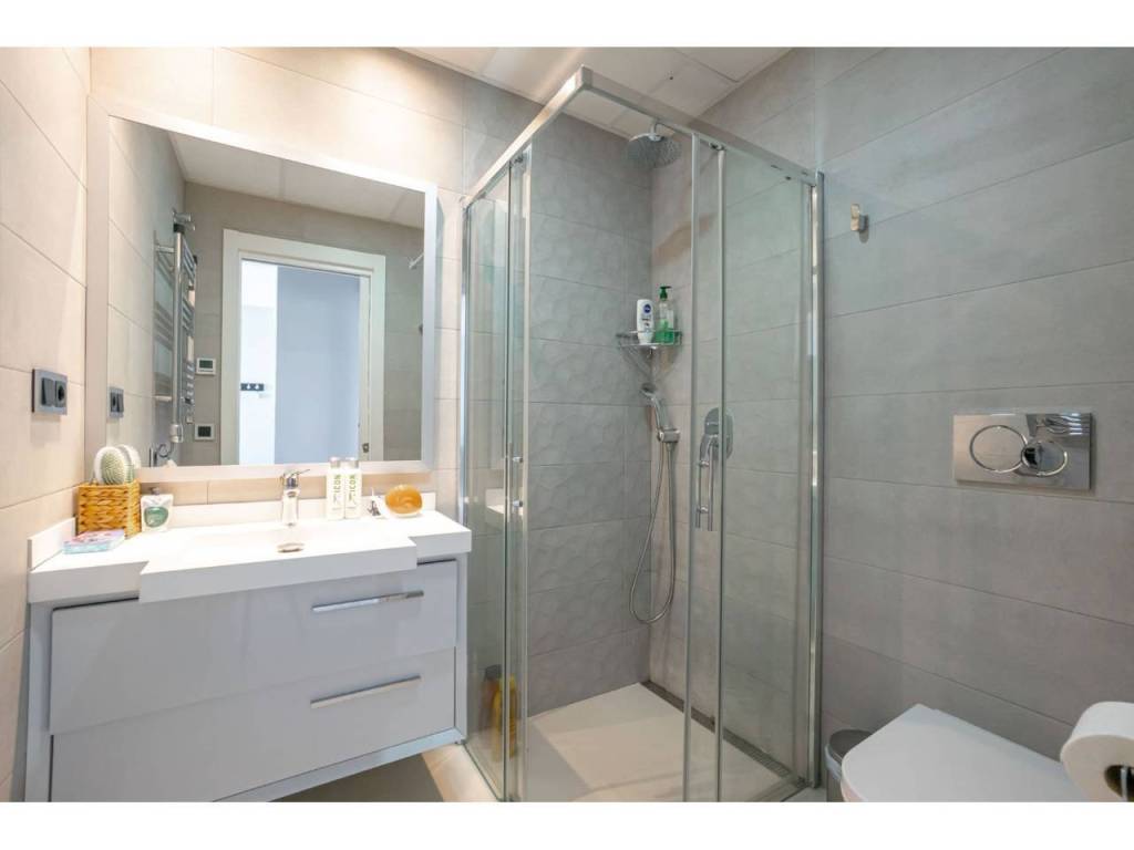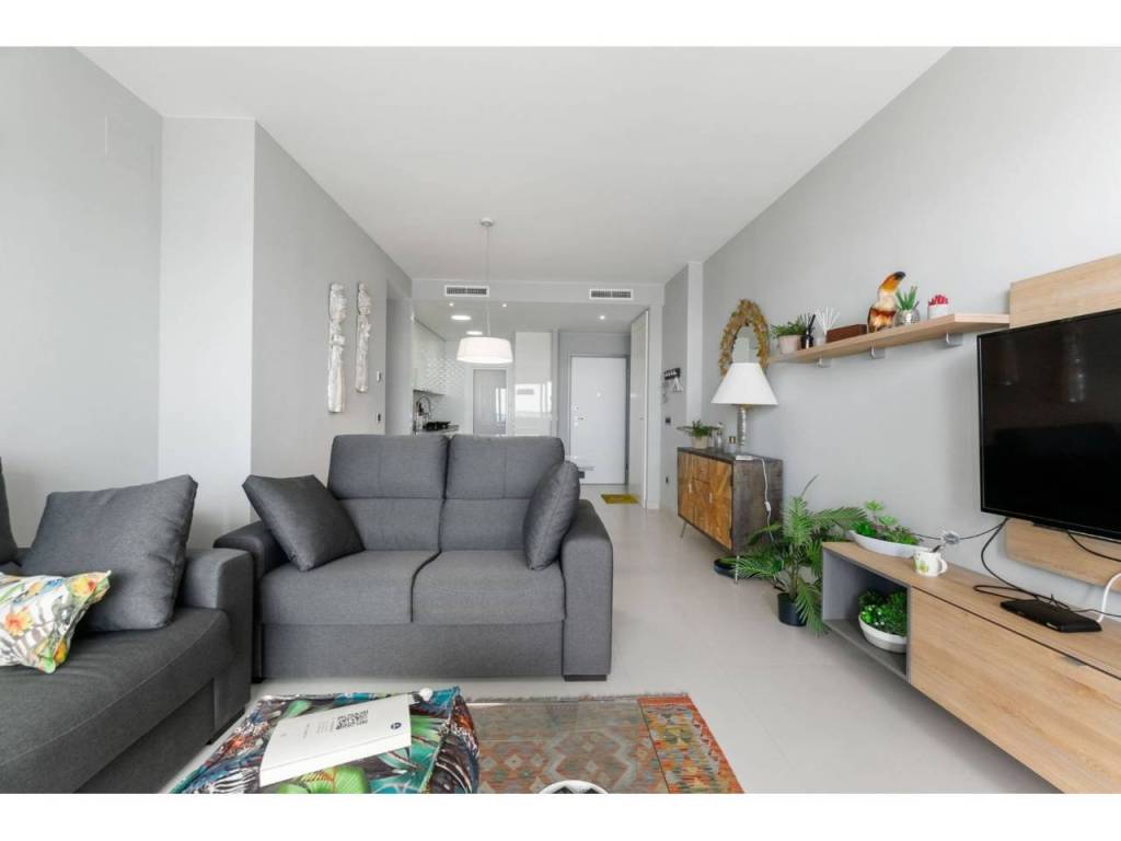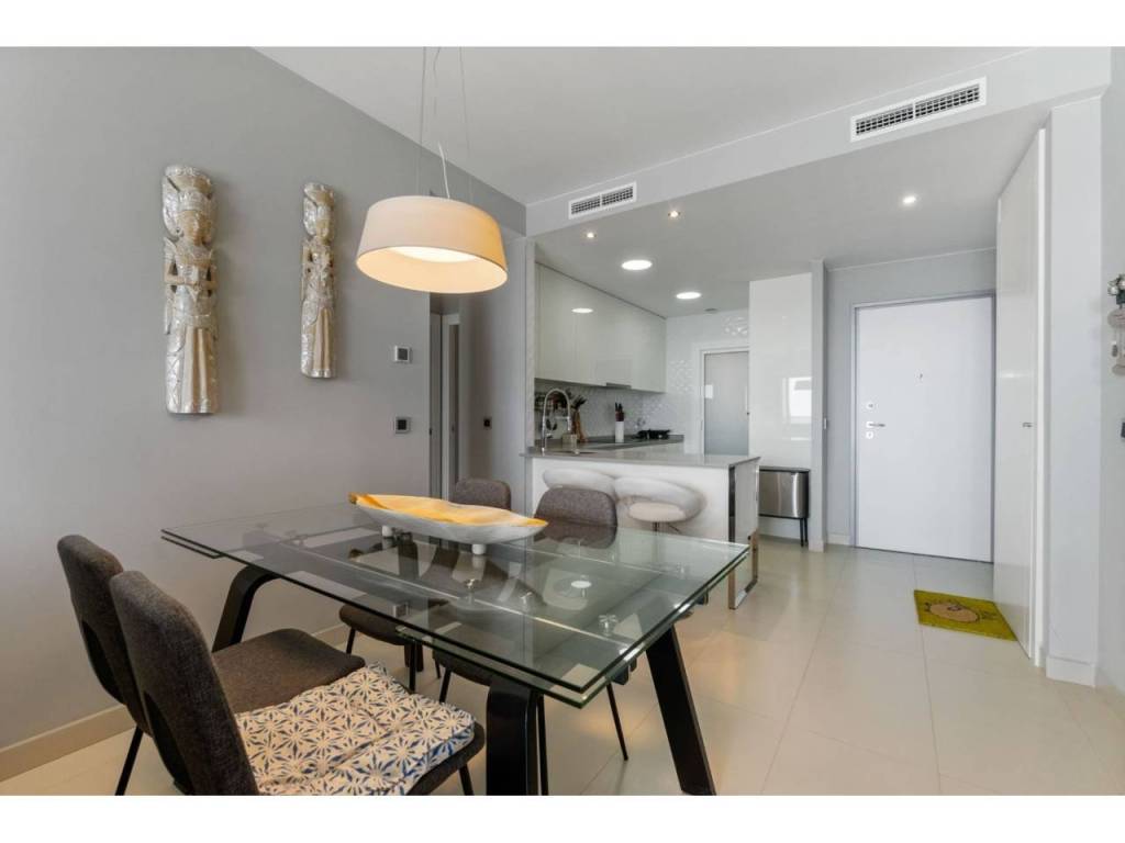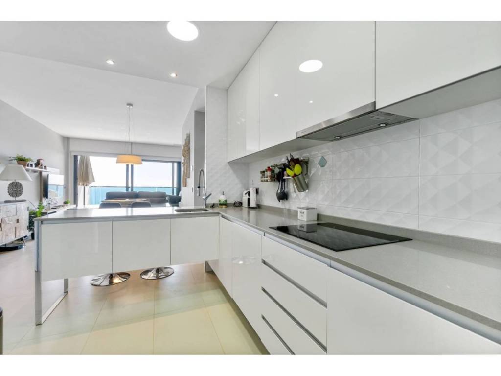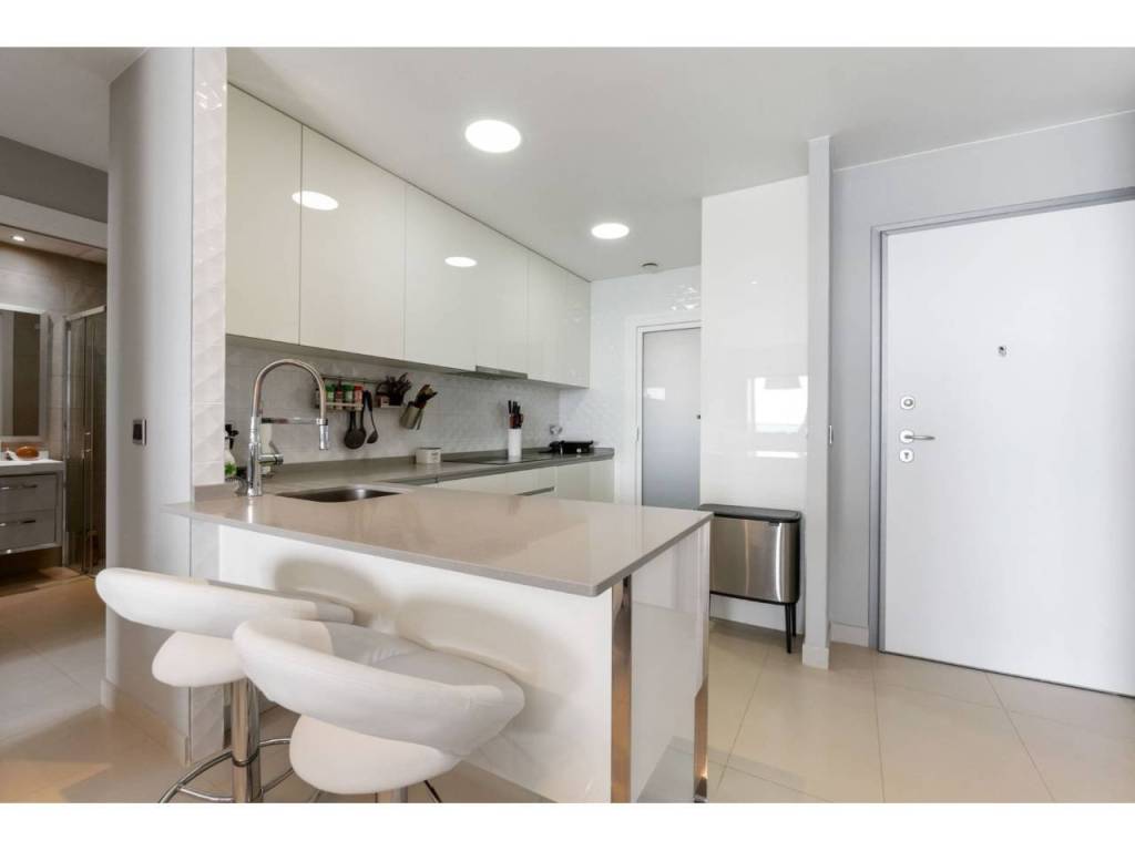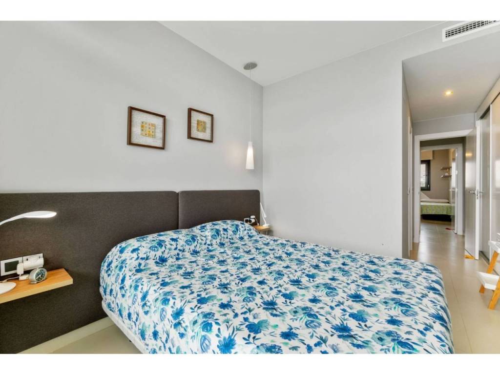 El apartamento totalmente amueblado, equipado y listo para entrar a vivir, consiste en dos dormitorios dobles, dos baños, armarios empotrados, salón comedor con modernos mue-bles. El salón y la habilitación principal tienen salida a la amplia terraza con impresionantes vistas al mar con cómodos muebles, para disfrutar de sus comidas, cenas y aperitivos. Coci-na americana equipada con todos los electrodomésticos de las mejores marcas y una des-pensa.