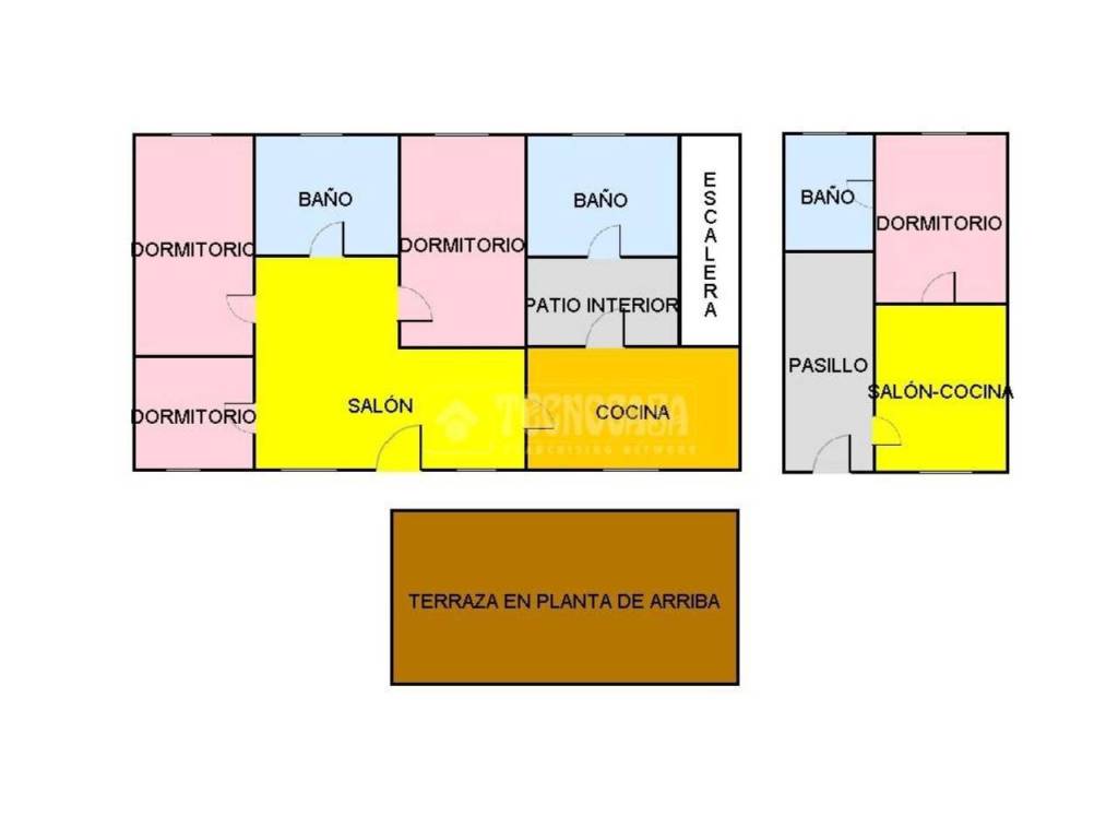 La casa principal se distribuye en un luminoso salón, cocina, baño con plato de ducha y tres dormitorios de buen tamaño. Además, cuenta con una práctica escalera que da acceso a una amplia terraza.