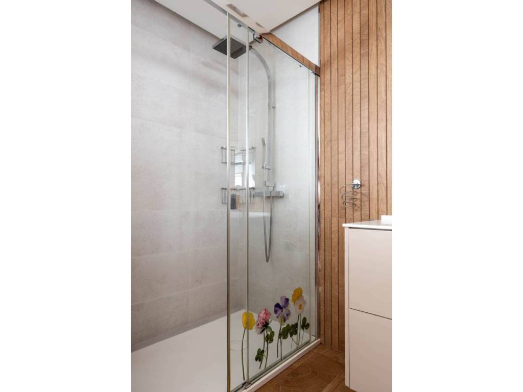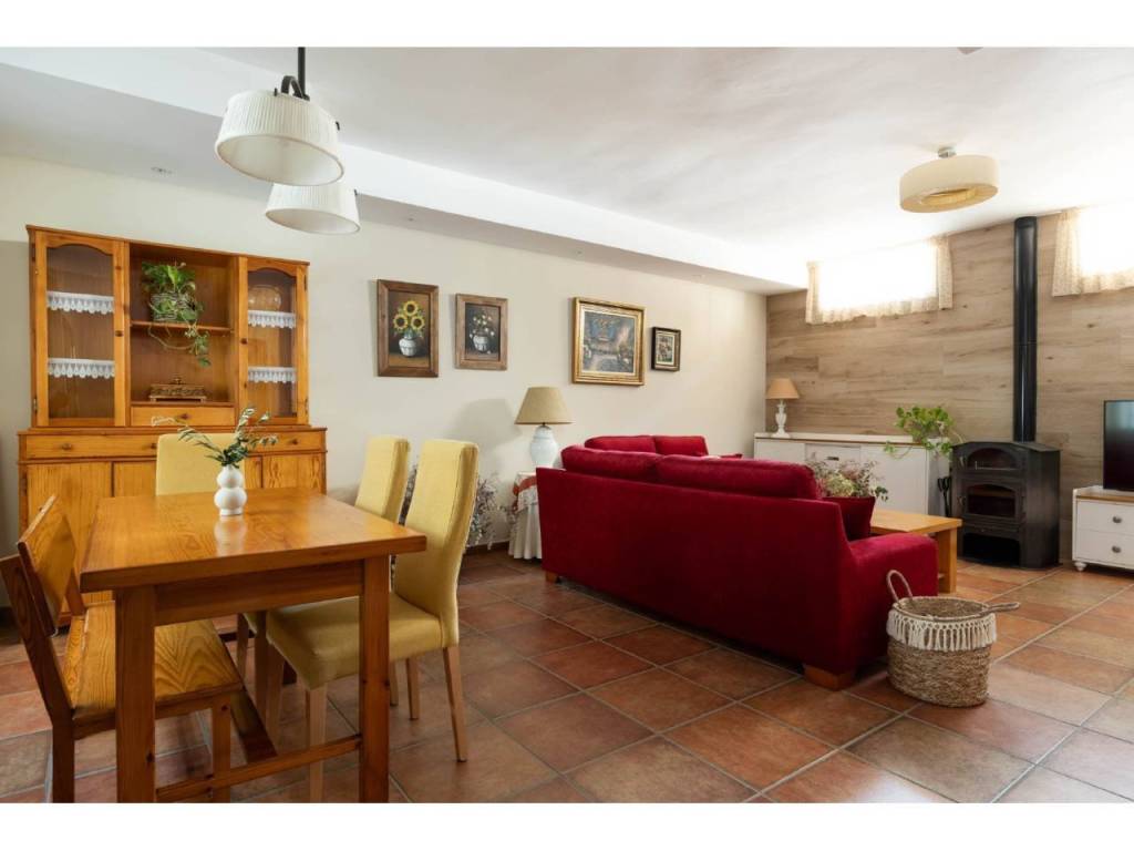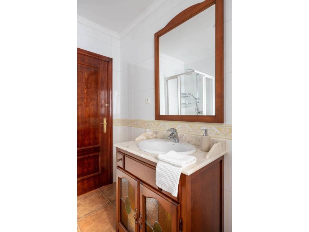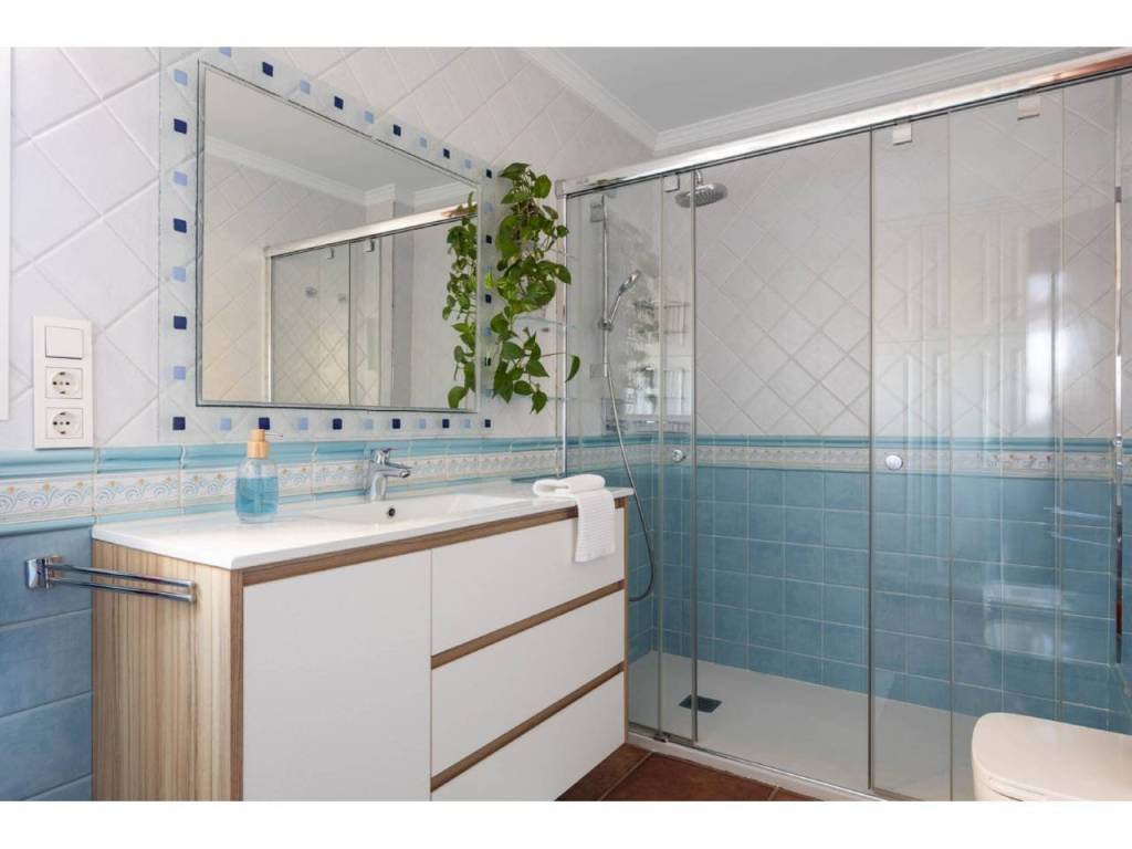 La vivienda se distribuye en dos plantas bien diferenciadas. En la planta principal encontramos una amplia cocina con encimera de mármol, espacio para desayunar y gran capacidad de almacenamiento. El salón, muy luminoso y con chimenea, conecta directamente con el porche, lo que facilita la vida familiar y social al integrar interior y exterior. En esta misma planta se ubican tres dormitorios. Dos de ellos comparten un baño completo en el pasillo, mientras que el dormitorio principal dispone de vestidor y un amplio baño en suite. Tanto desde el salón como desde la cocina y el dormitorio principal se accede directamente al porche y a la piscina, lo que aporta gran comodidad en el día a día.