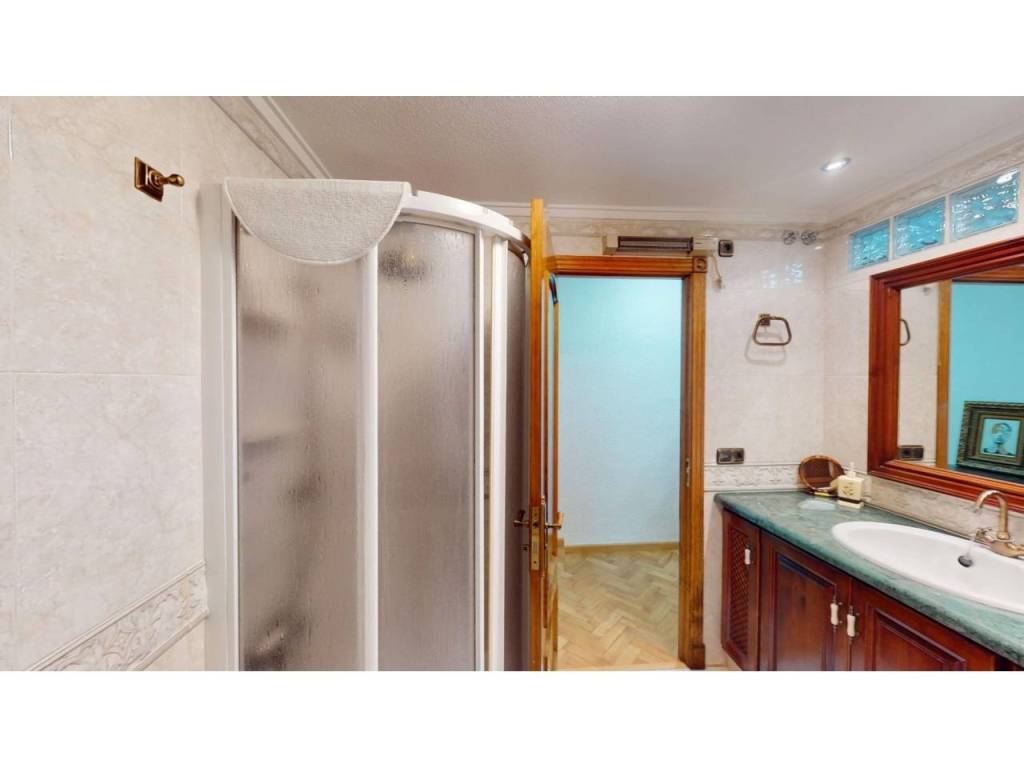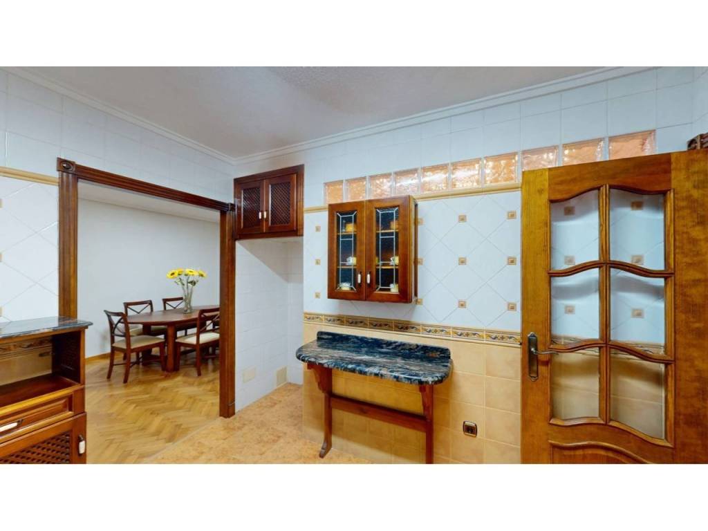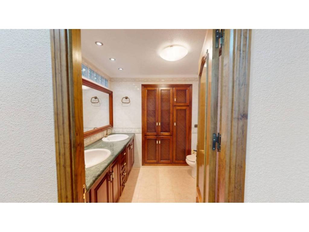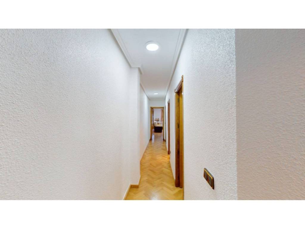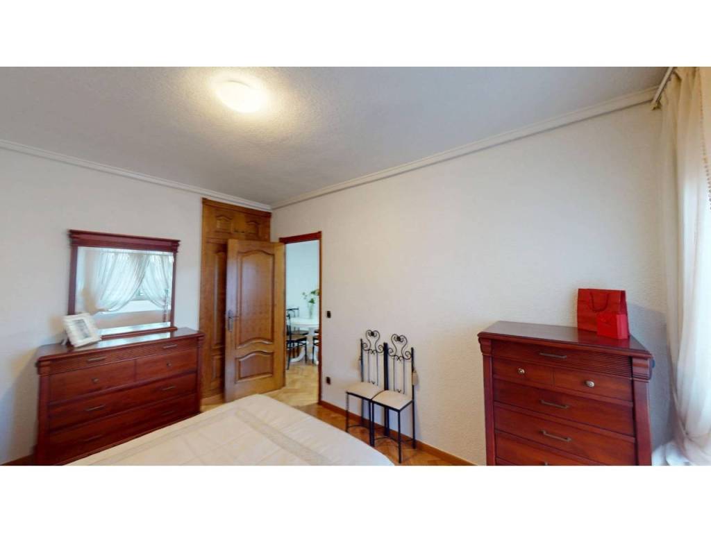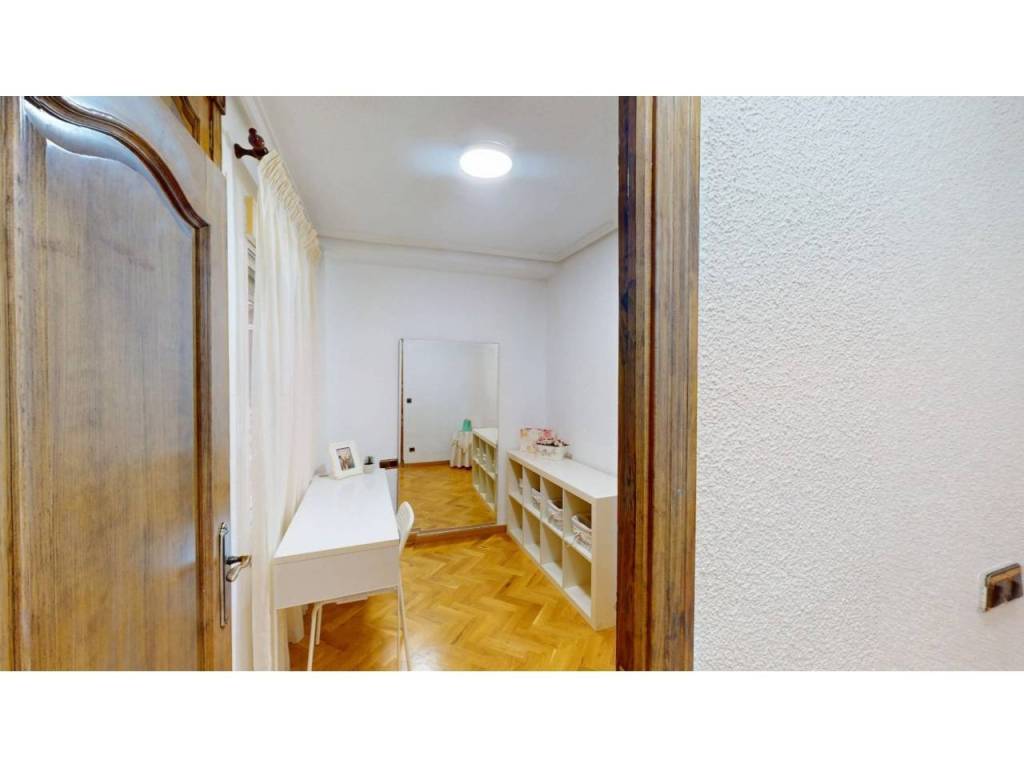 El piso cuenta con cuatro amplias habitaciones, todas ellas equipadas con armarios empotrados de madera maciza, completamente forrados en su interior, reforzando la sensación de calidad y durabilidad. Las puertas de paso, también en madera maciza tintada y con marcos macizos, aportan continuidad y presencia a la vivienda.