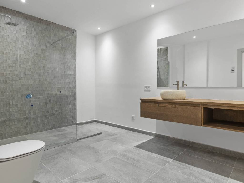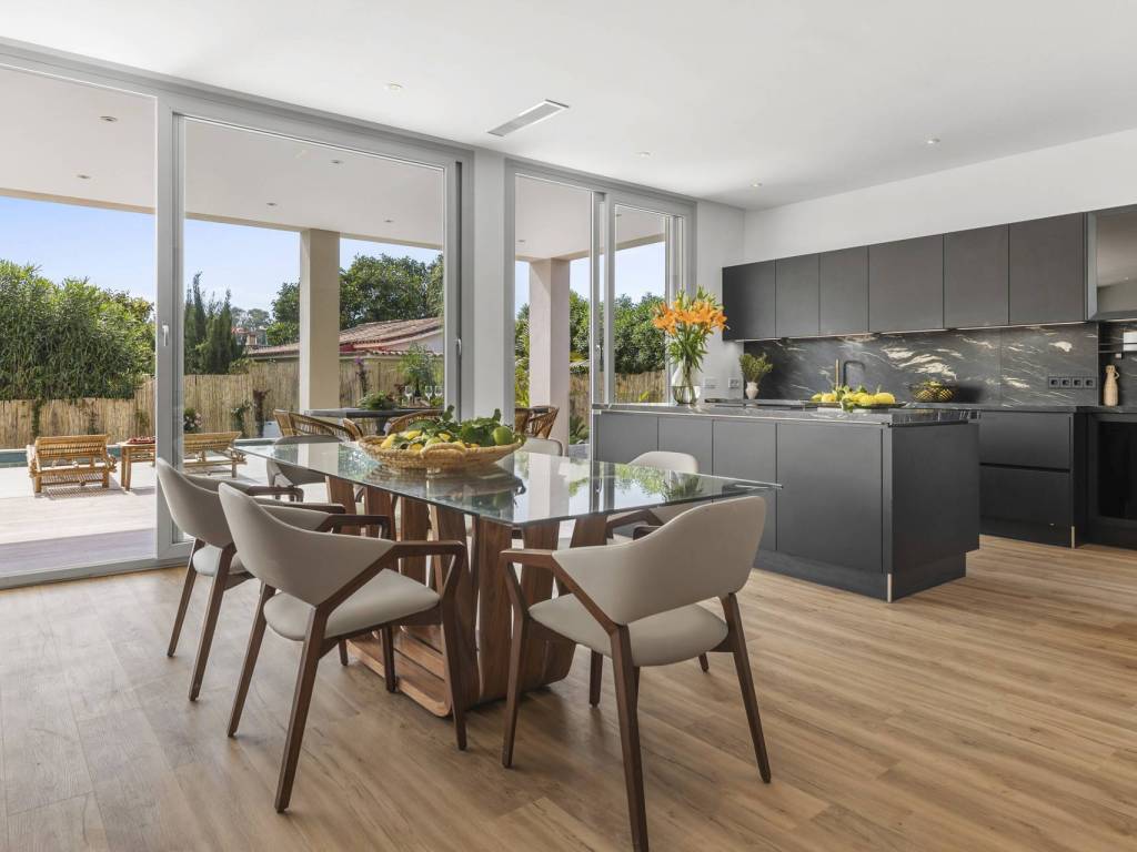 La planta principal dispone de una acogedora zona de salón-comedor de concepto abierto con cocina Bosch totalmente equipada, aseo de invitados y un dormitorio de invitados con baño en suite. Todas las áreas principales se abren directamente a terrazas cubiertas y descubiertas y a la piscina privada, creando un entorno perfecto para el relax o el entretenimiento.