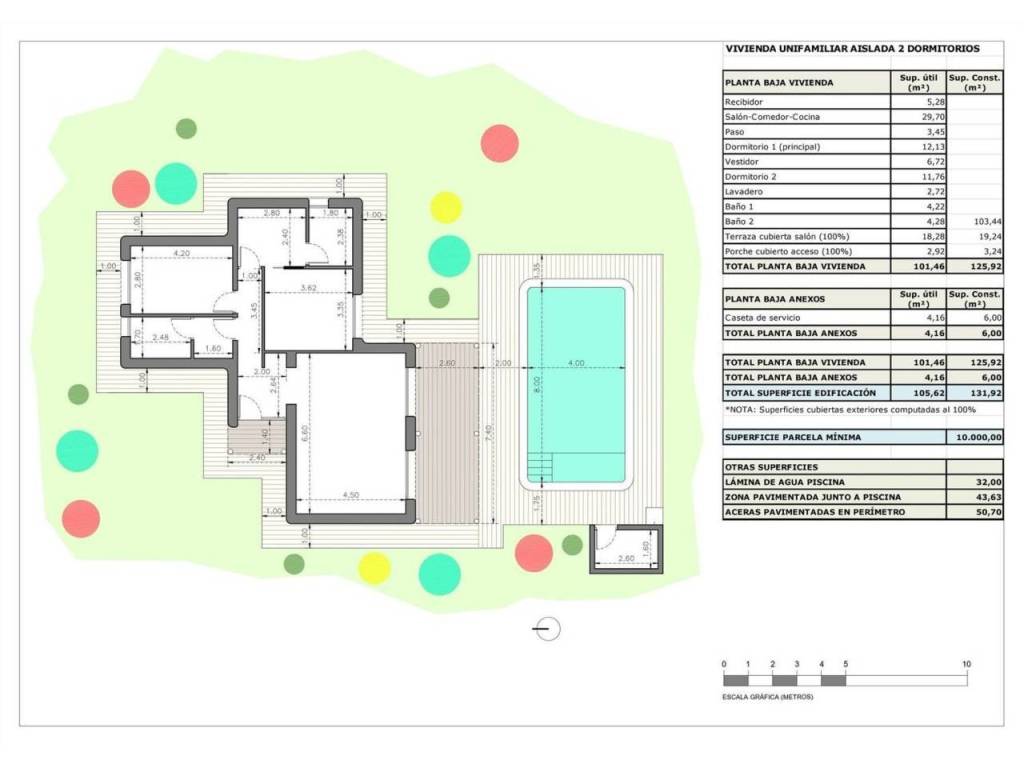 Cada propiedad se encuentra en una zona vallada de aproximadamente 2500 m2 dentro de una parcela rústica de 10 000 m2, lo que garantiza una gran privacidad y espacio. Las villas incluyen una piscina privada de 8 x 4 m, un porche, un trastero y un aparcamiento exterior privado.