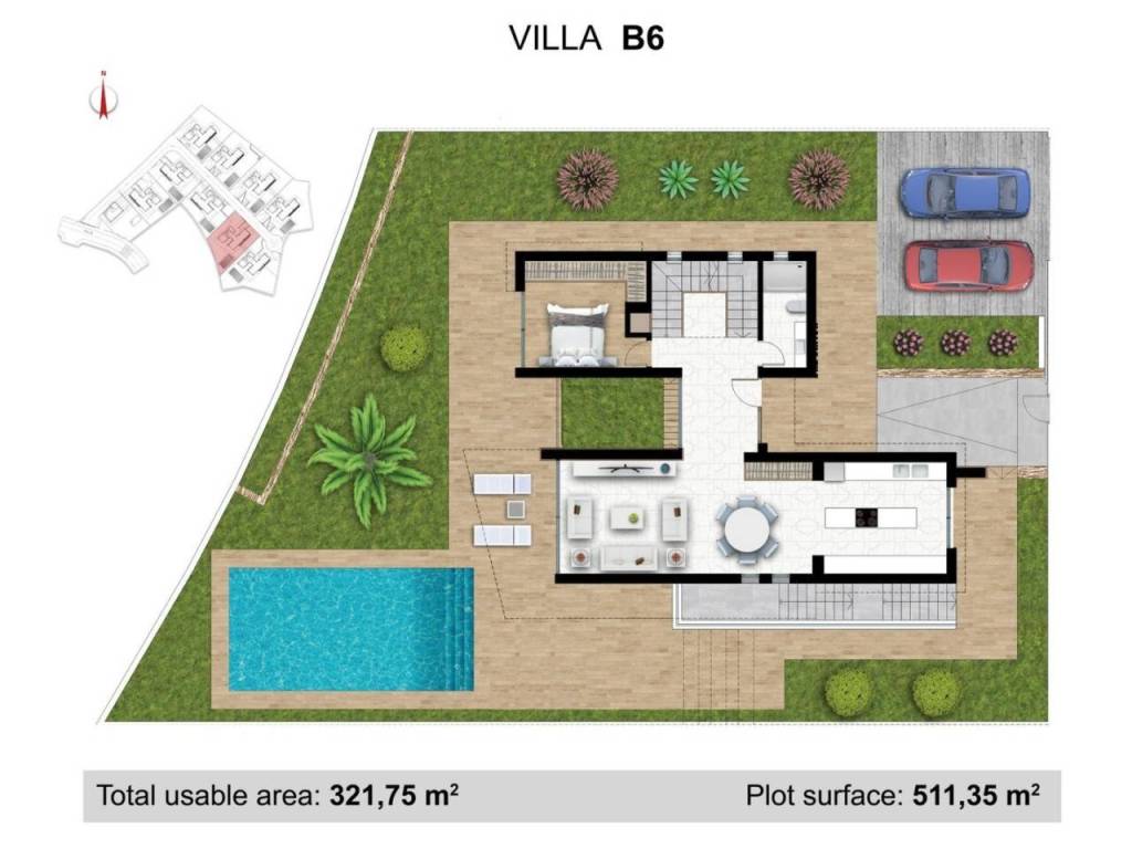 Cada villa cuenta con su propio jardín privado con plantas autóctonas, una piscina privada al aire libre con cascada y un solárium en la azotea con vistas panorámicas de los alrededores y del mar Mediterráneo. La comunidad ofrece un servicio completo de mantenimiento del jardín y la piscina, además de un útil servicio de reparaciones domésticas cotidianas, lo que hace que estas viviendas sean ideales para una vida sin estrés o como refugio vacacional.