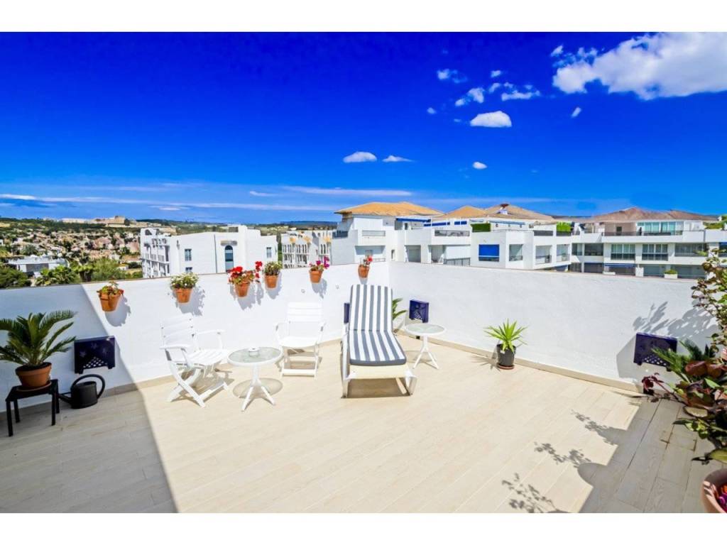The penthouse features a fully fitted kitchen, perfect for culinary enthusiasts, and a stylish living room that opens onto the private terrace. Residents can enjoy breathtaking sea and mountain views, as well as picturesque vistas of the communal gardens and pool. The property is equipped with air conditioning and a guest toilet, ensuring convenience and comfort throughout the year. Fitted wardrobes offer ample storage, while the inclusion of a lift provides easy access to all levels.