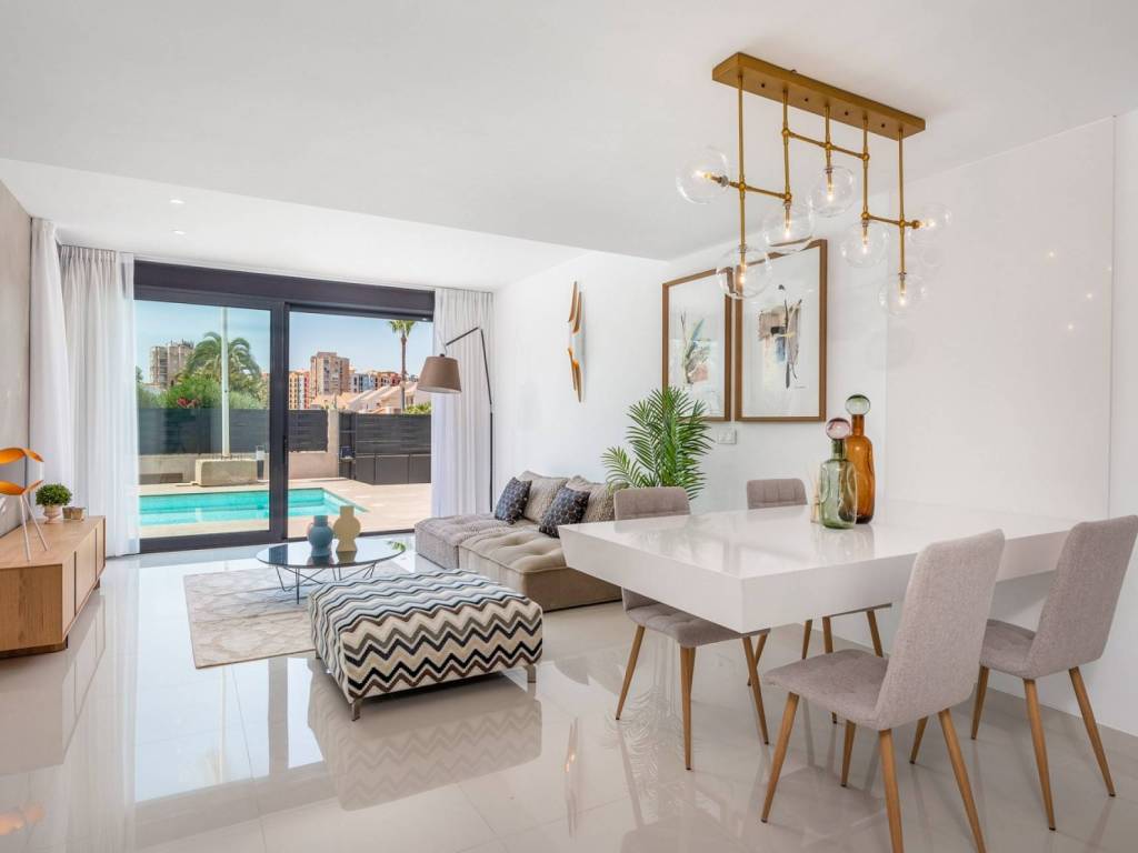 On the ground floor, a bright living-dining room with views of the private pool seamlessly integrates with an open kitchen, ideal for enjoying moments with family and friends. There is also a spacious bedroom and a full bathroom. Upstairs, the master bedroom and a double bedroom provide the perfect retreat, complemented by two full bathrooms. The basement, depending on the model, offers a versatile space that can be adapted to your needs, and the private solarium is perfect for enjoying the sun year-round with panoramic views of the urbanization.
