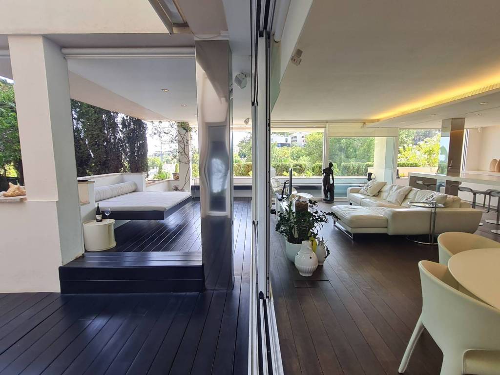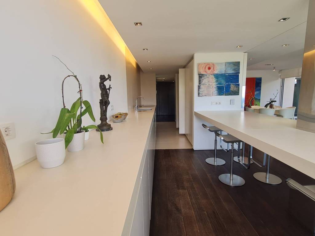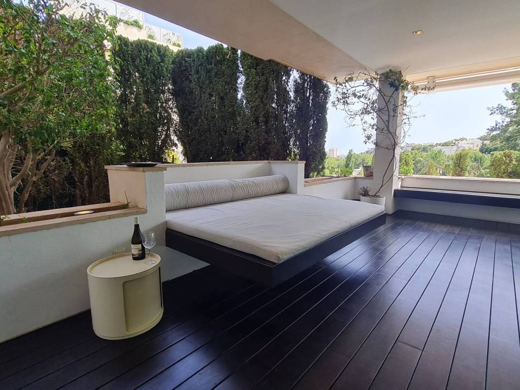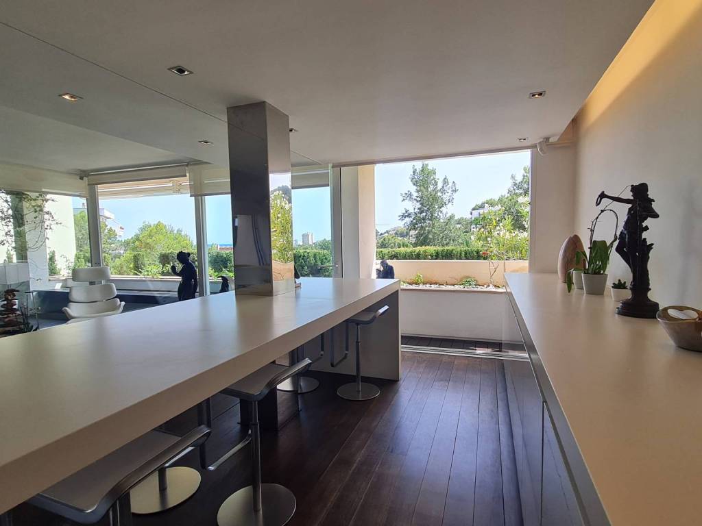 Diese einzigartige Wohnung bietet ein wunderschönes Ambiente und einen teilweisen Meerblick über die grünen Weiten von Cas Catala. Die Designer-Einrichtung lädt zum Entspannen und Erholen in einer privaten Oase in einer sehr kleinen Gemeinschaft mit Schwimmbad und Aufzug zu allen Ebenen ein. Die Immobilie wurde vor einigen Jahren renoviert und befindet sich in einem ausgezeichneten Zustand. Die Aufteilung besteht aus einem hellen Wohnzimmer mit Essbereich und großen Glastüren, die auf die Terrasse führen. Die moderne Küche hat einen angrenzenden Hauswirtschaftsraum mit viel Stauraum und zusätzlich gibt es 2 Schlafzimmer und 2 Bäder, das Hauptschlafzimmer ist ein sehr großzügiges Zimmer mit zwei Ankleidezimmern, einem luxuriösen Badezimmer mit Spa-Feeling, einer türkischen Sauna-Dusche, einer großen Badewanne und Blick auf die Terrasse.