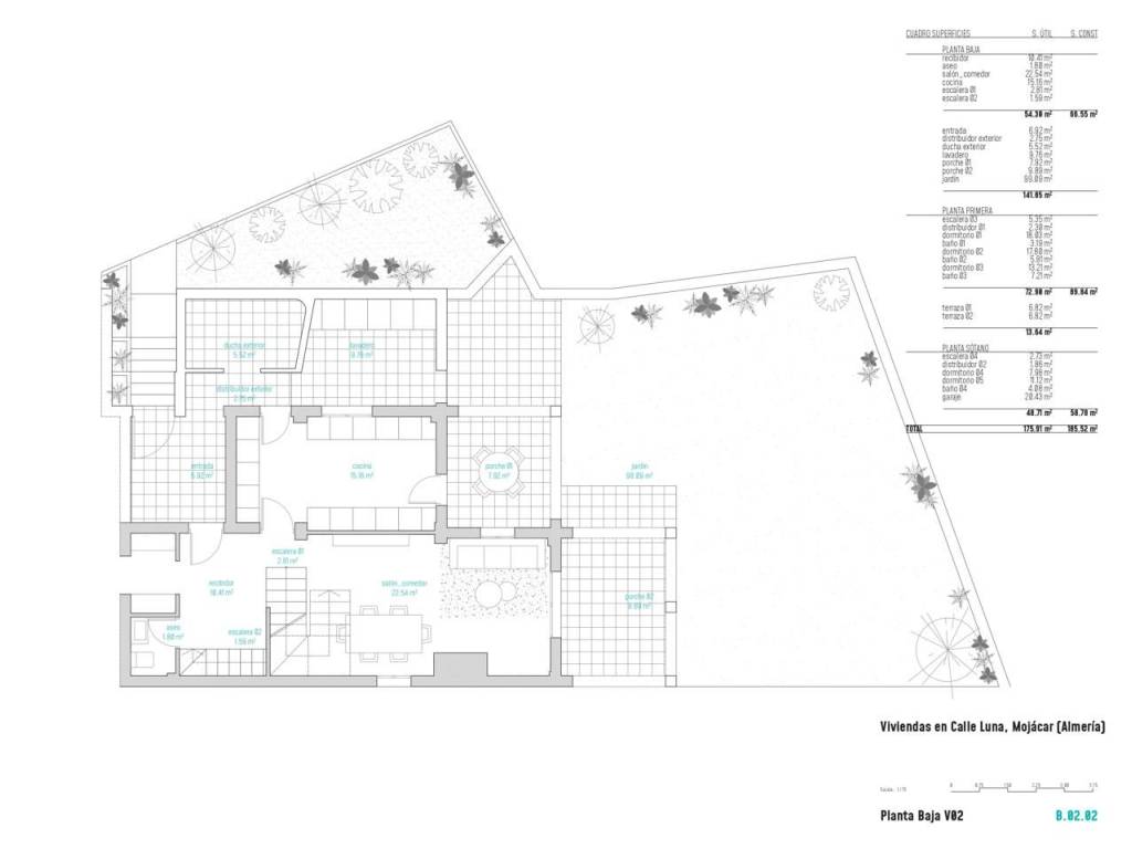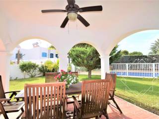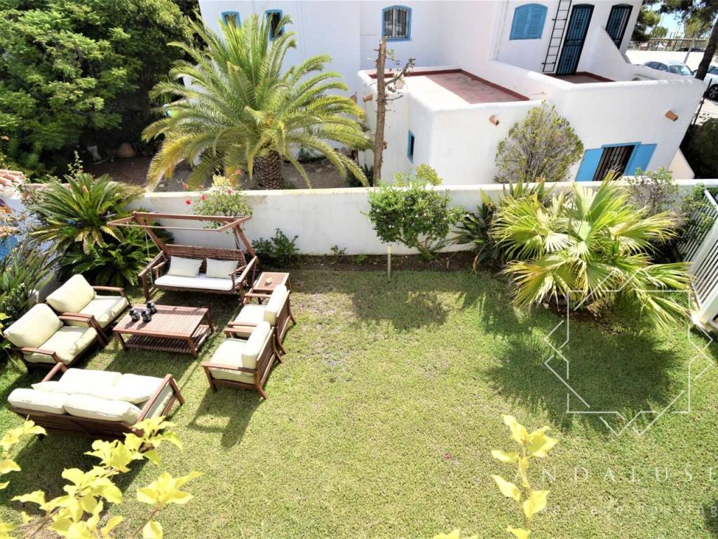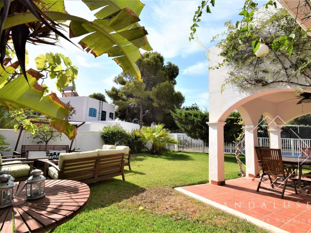 Wenn wir zur Veranda zurückkehren, haben wir direkt gegenüber die Eingangstür zum Inneren des Hauses, wo wir eine elegante Halle finden, von der aus die Räume auf dieser Etage verteilt sind. Auf der linken Seite entdecken wir seine helle und gepflegte separate Küche und das mit Klimaanlage ausgestattete Wohn-Esszimmer mit großen Fenstern, die uns zum spektakulären Außenbereich des Hauses führen, von dem ein Teil überdacht ist genießen Sie das ganze Jahr über das gute Klima unserer Region. Die Veranda ist von einem bezaubernden privaten Garten von ca. 100 m umgeben. Auch auf dieser Etage finden wir eine kleine Toilette.