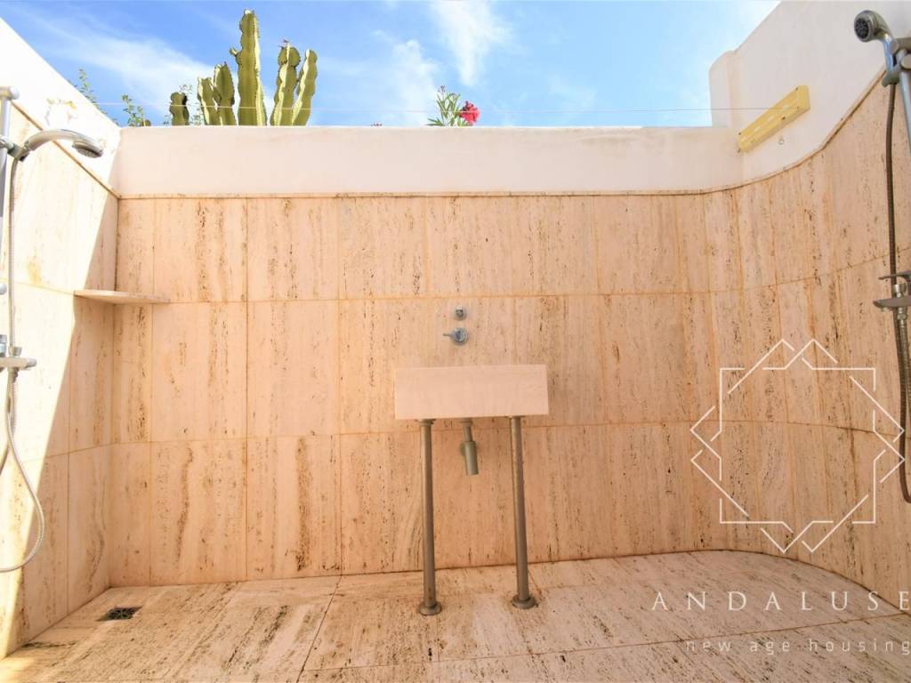 Wir betreten das Haus durch einen angenehmen Spaziergang durch einen Innenkorridor des Wohnkomplexes, der uns zu seinem privaten Eingang führt. Wir steigen eine kleine Treppe hinauf, um die Veranda des Hauses zu erreichen. Auf der linken Seite finden wir eine Tür, die zum Wasch- und Duschbereich führt, ein Bereich, der wiederum mit der Küche und dem Außenbereich verbunden ist, der von seinen derzeitigen Eigentümern gebaut wurde, um den Genuss des Hauses zu optimieren.