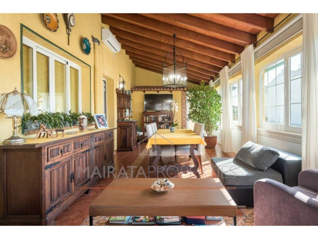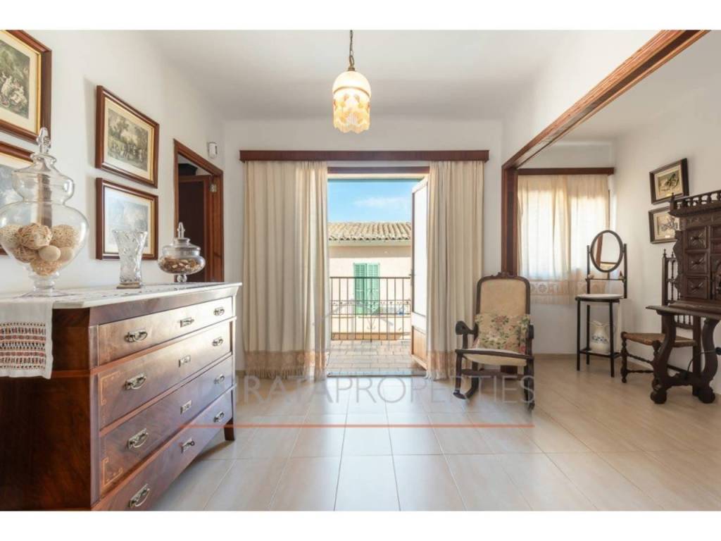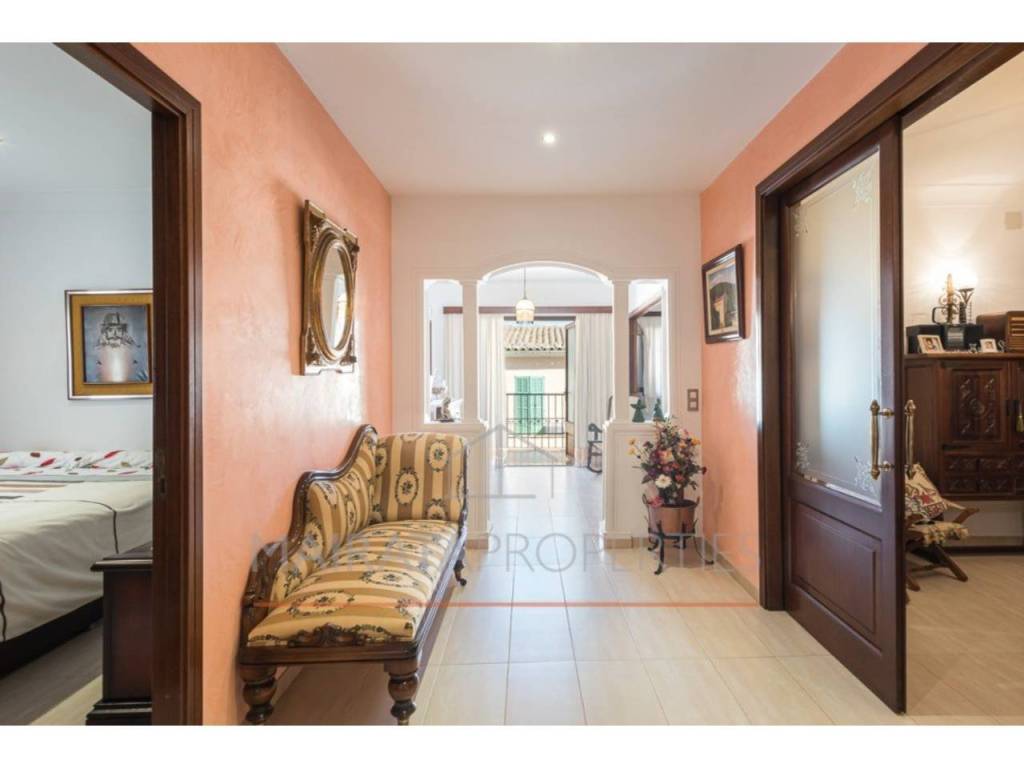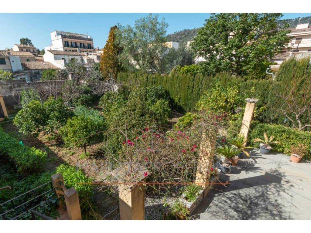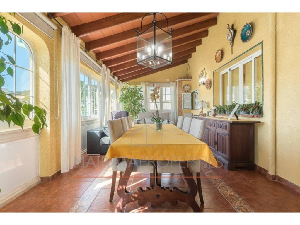 La primera planta, accesible desde la calle y el jardín, cuenta con un distribuidor, dos habitaciones dobles, una individual y un despacho con chimenea, que puede transformarse en una cuarta habitación. La propiedad dispone de dos salones: uno con grandes ventanales y porche acristalado, que ofrece vistas a la Serra de Tramuntana, y otro, más privado, conectado a una cocina totalmente equipada y a un baño completo.