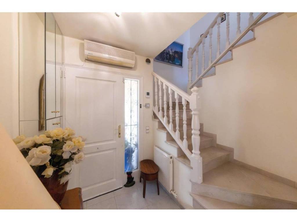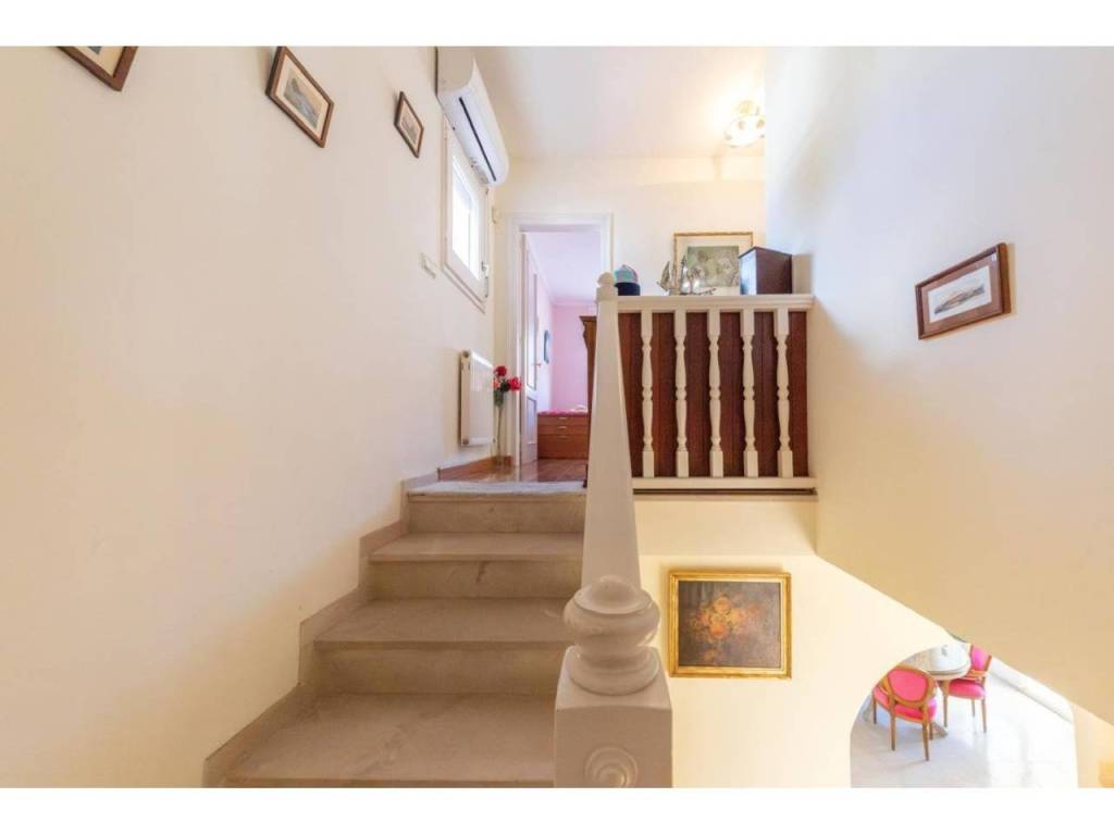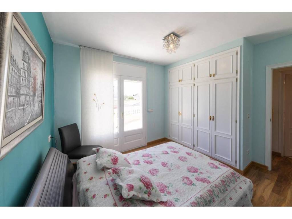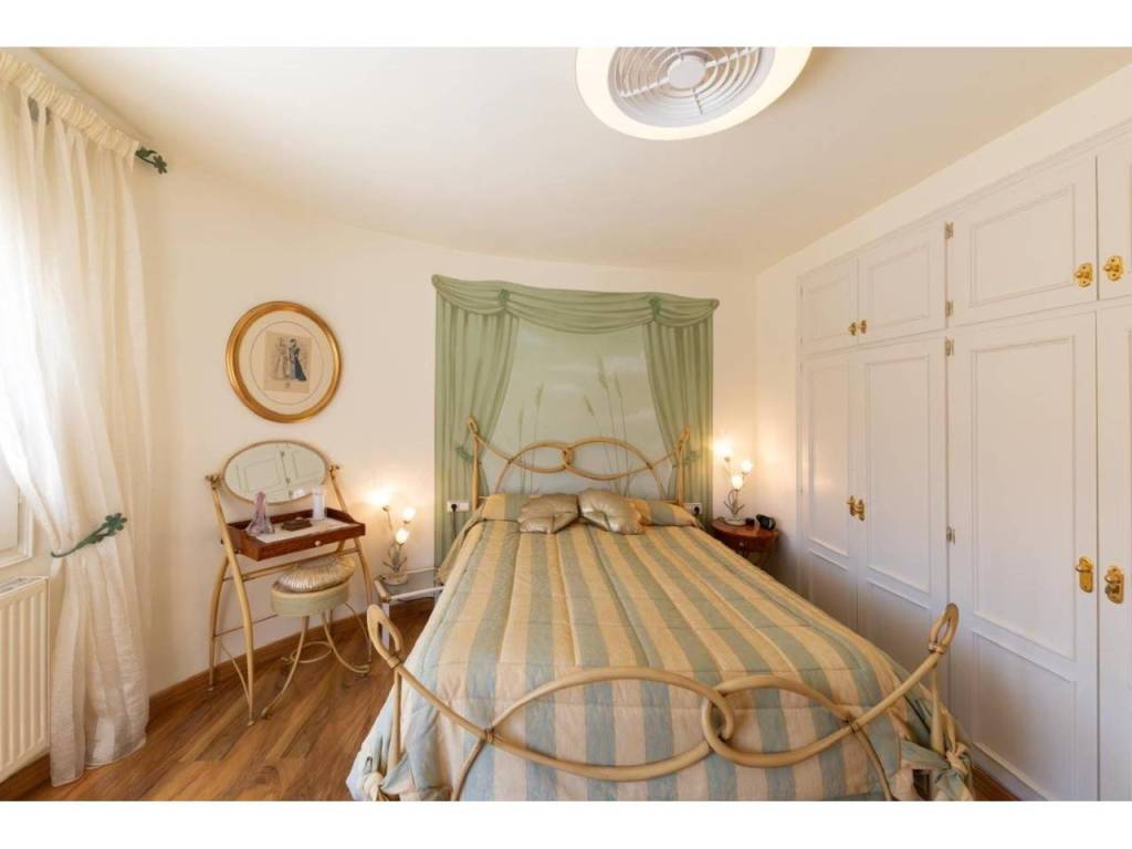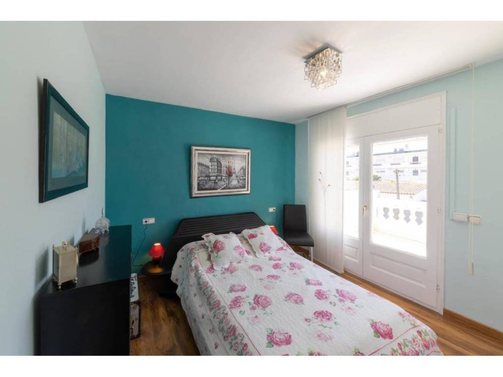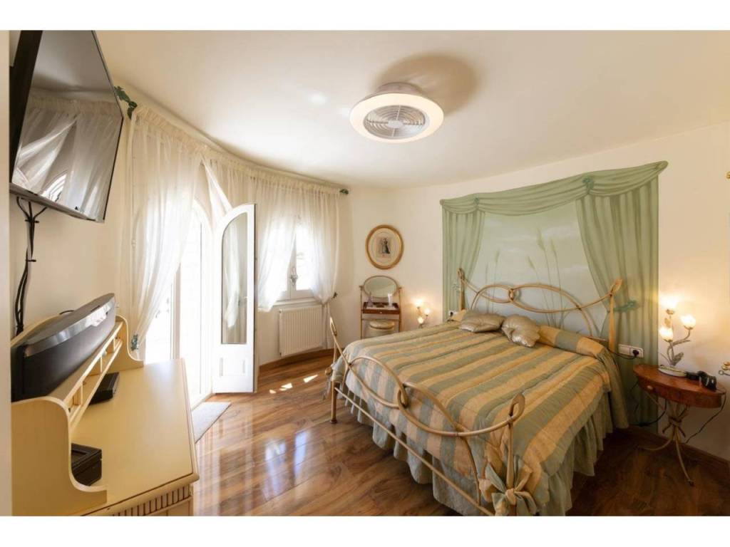 Die voll ausgestattete Küche geht in ein einladendes Ess- und Wohnzimmer über – der ideale Ort für unvergessliche Momente. Im Erdgeschoss befindet sich ein Doppelzimmer mit Einbauschrank und eigenem Badezimmer mit Dusche. Im Obergeschoss erwarten Sie drei weitere Schlafzimmer, alle mit Einbauschränken und Zugang zu einer Terrasse mit Panoramablick auf Garten und Pool.