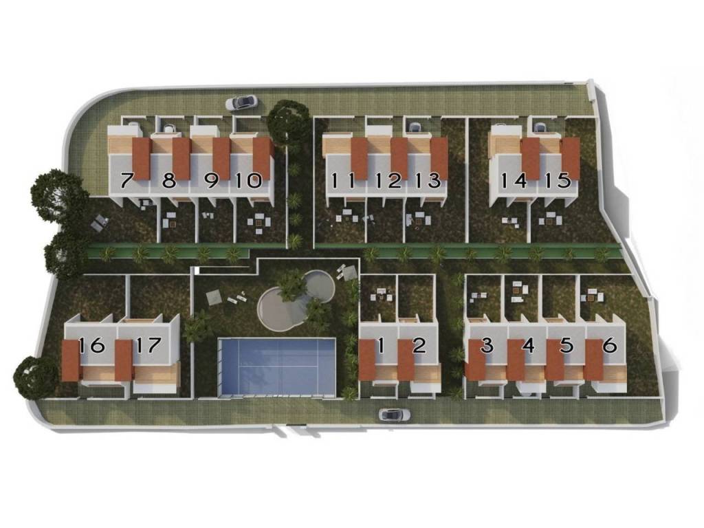 The residential community offers an array of amenities, including communal pools designed for both adults and children, a paddle tennis court, and beautifully landscaped gardens. Each villa is thoughtfully designed across two floors plus a rooftop solarium. They feature three spacious bedrooms, including a master suite with a full bathroom, an additional bathroom, a guest toilet, an open-plan kitchen, a living-dining area, a private garden, and covered parking on the premises.