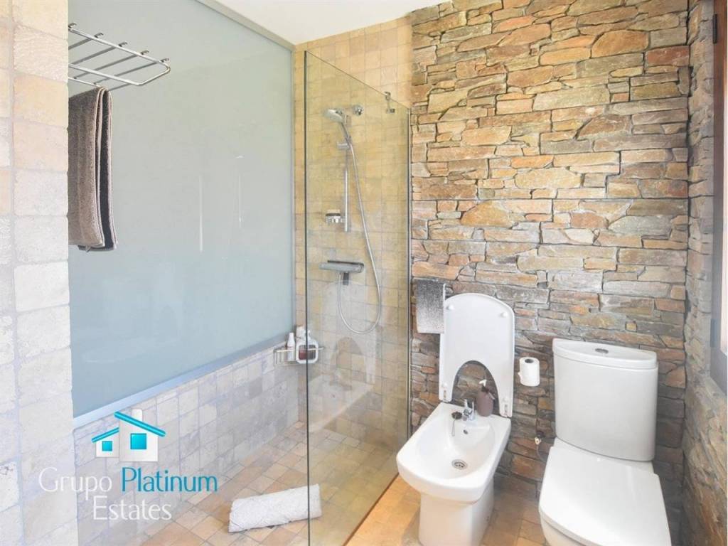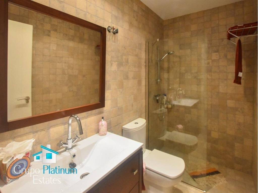 Al volver al salón, subiendo las escaleras modernas, llegamos a la planta superior, donde encontramos dos dormitorios y un baño contemporáneo con acabados de alta calidad que añaden un toque de lujo al espacio. Una de las dos habitaciones ofrece un balcón con vistas.