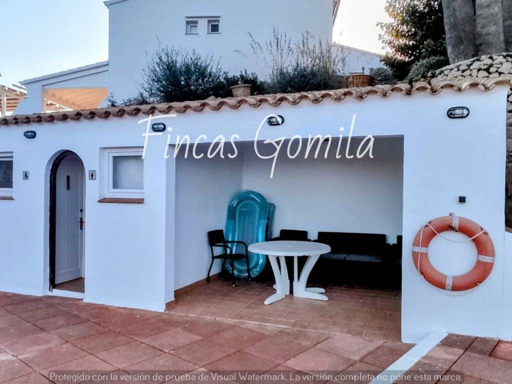 Ein 13 Meter langer Pool im oberen Teil von Addaia mit spektakulärem Blick auf den Hafenausgang. Der Bereich verfügt über einen Kühlschrank, einen Tisch und Umkleidekabinen und eignet sich ideal für Treffen und Feiern.