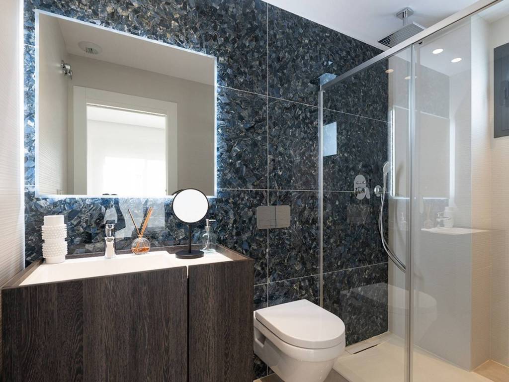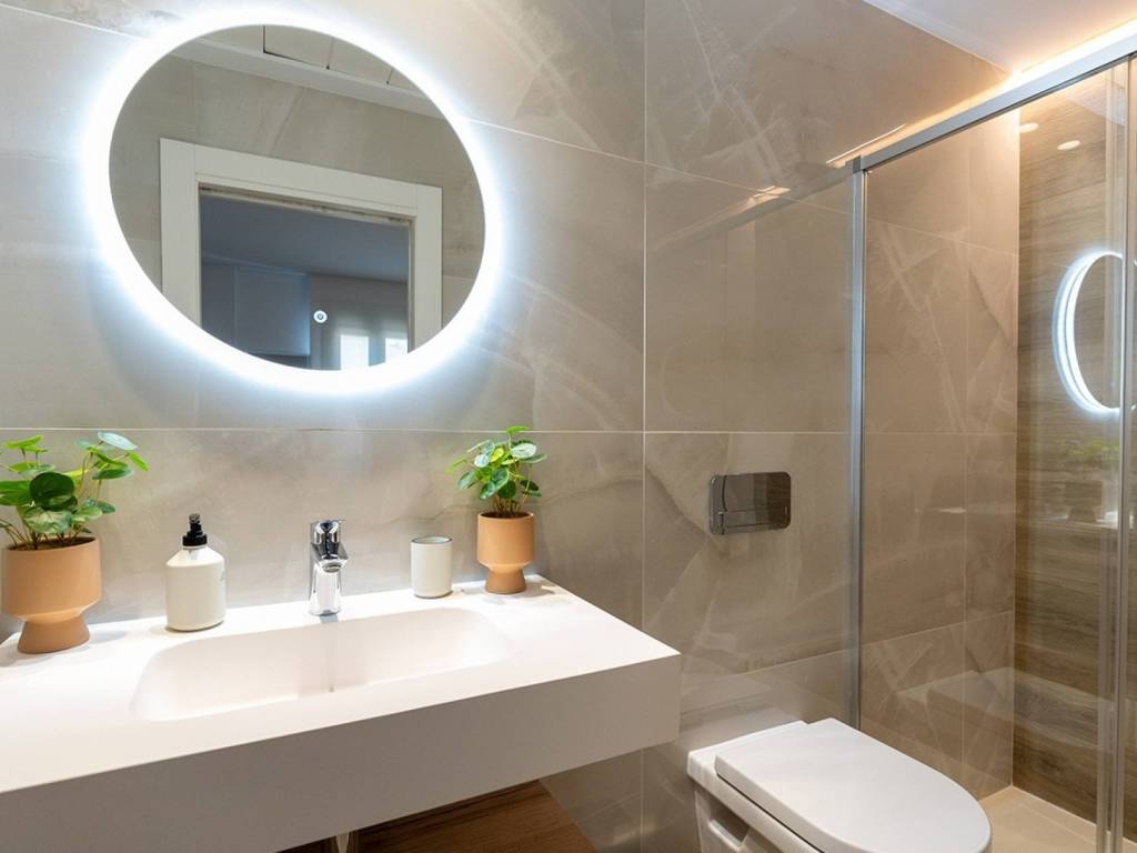 Plumbing and sanitation: High-quality suspended sanitary ware, single-lever faucets, and hot water production via an aerothermal system.