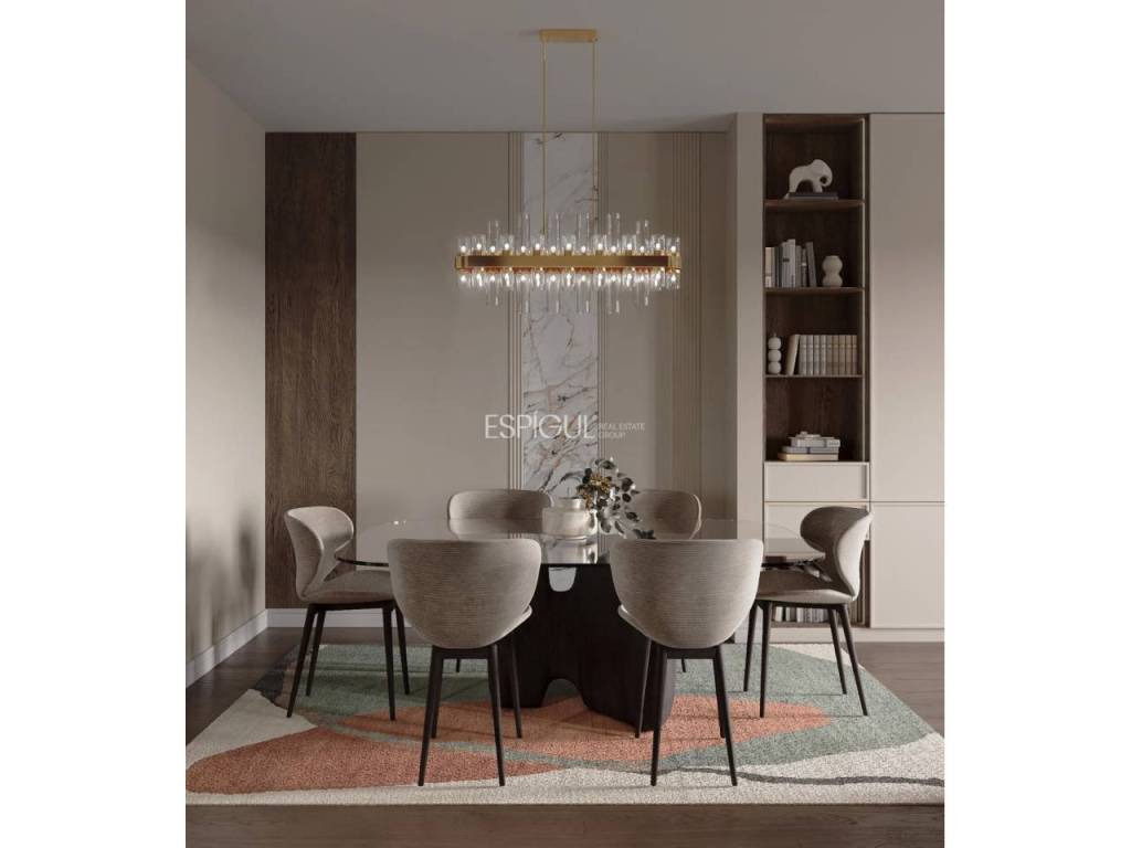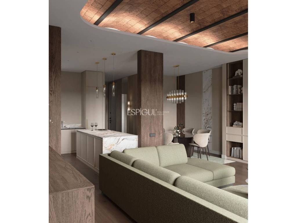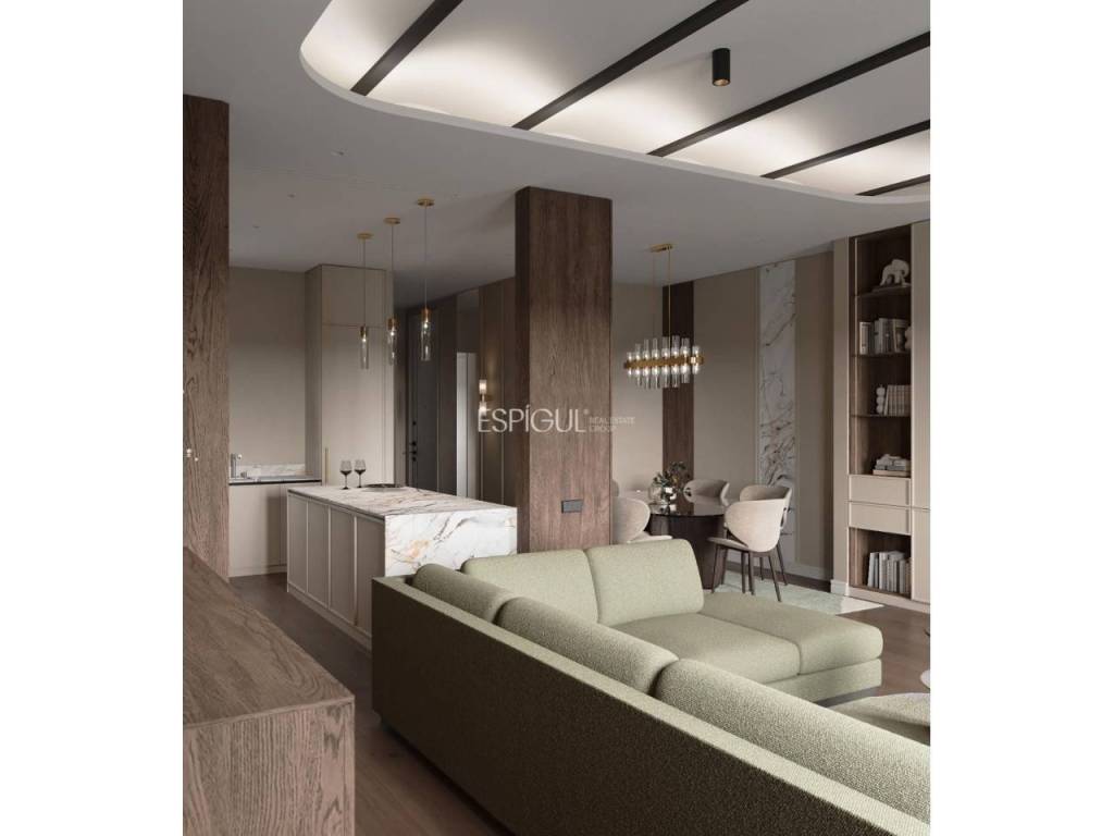 El salón-comedor de 50 m², bañado de luz natural, se conecta con una cocina abierta de diseño con isla central y electrodomésticos de alta gama, y cuenta con salida directa a dos balcones con vistas únicas.