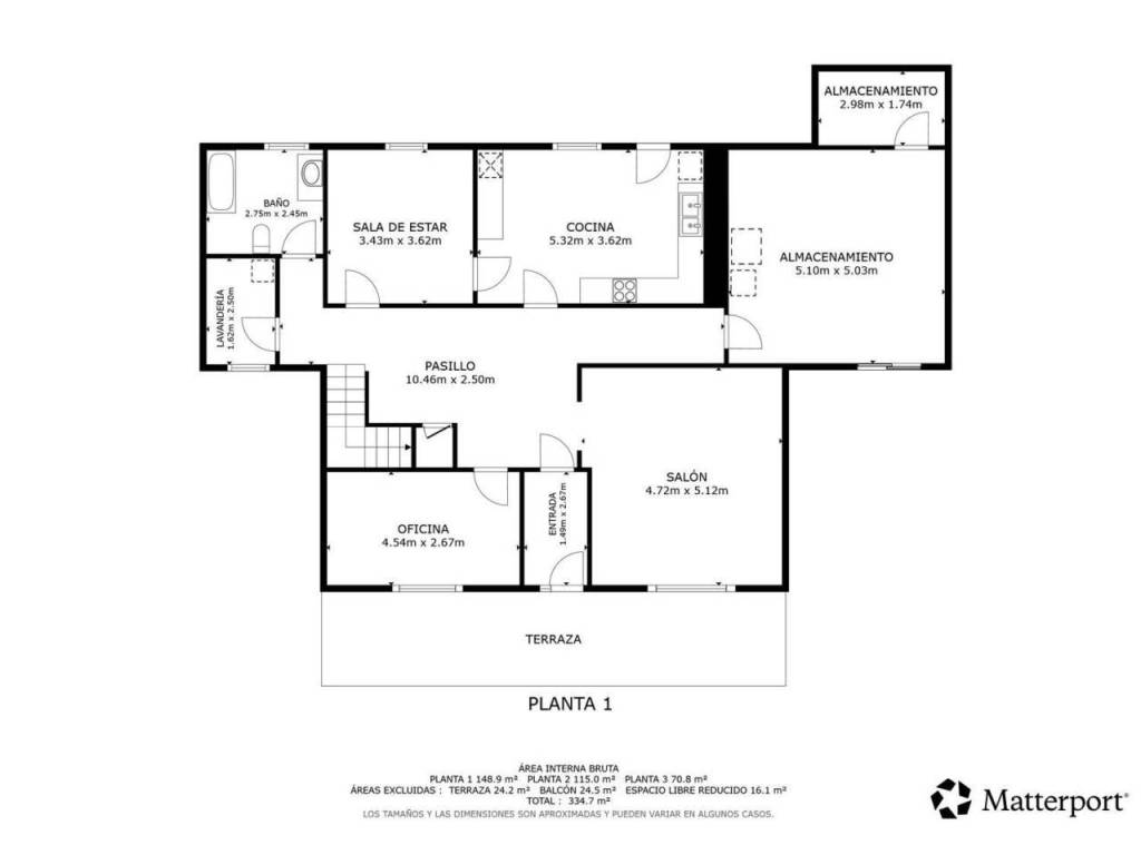 -Ground floor: Living room, kitchen, small living room, 1 bedroom, 1 bathroom, laundry room and large room previously used as a garage (currently used as a warehouse, games room... ).