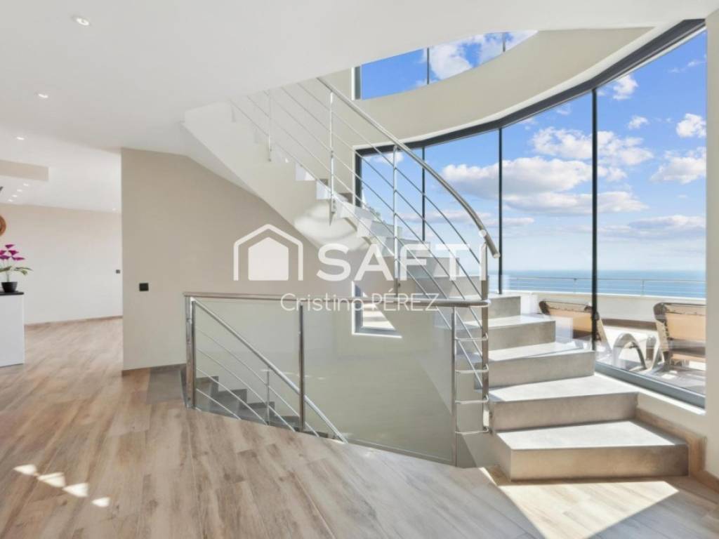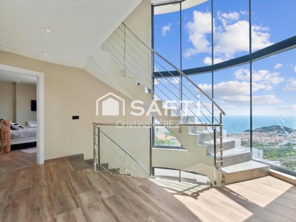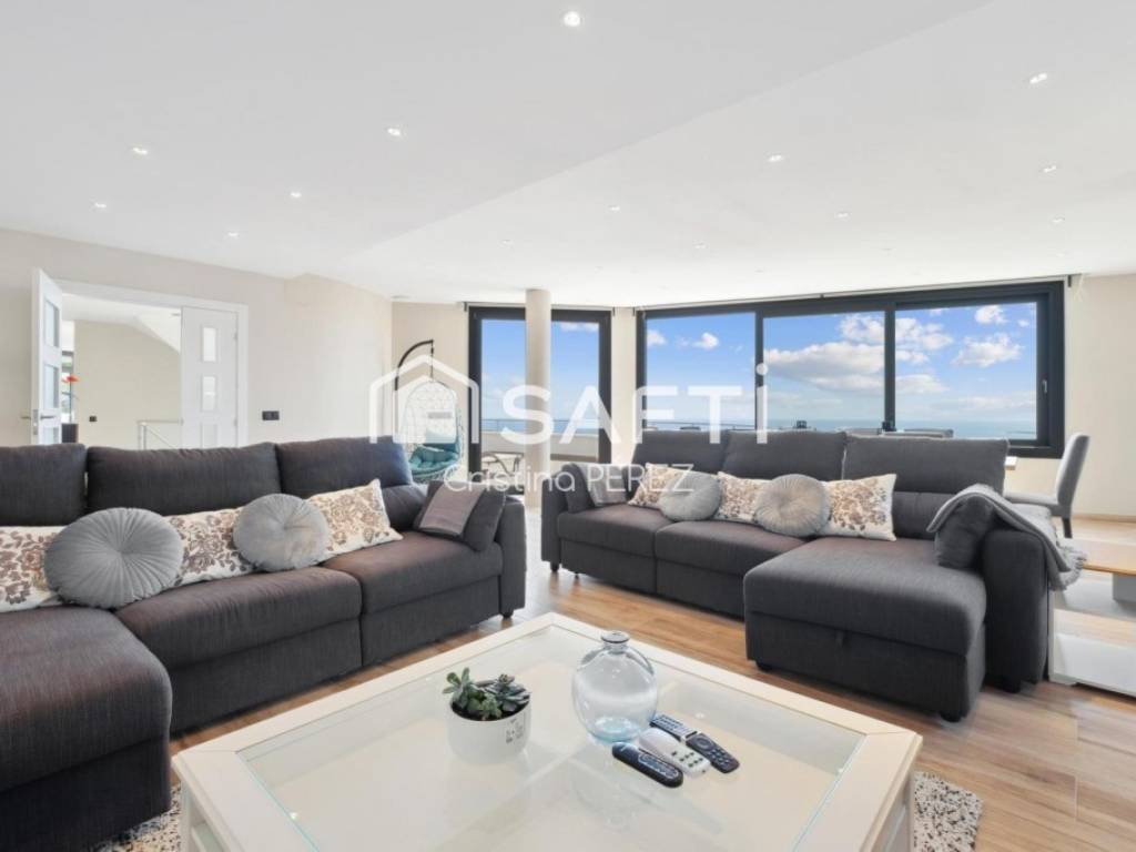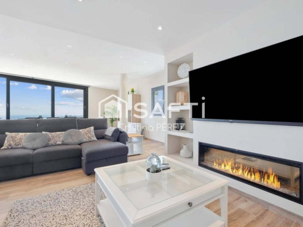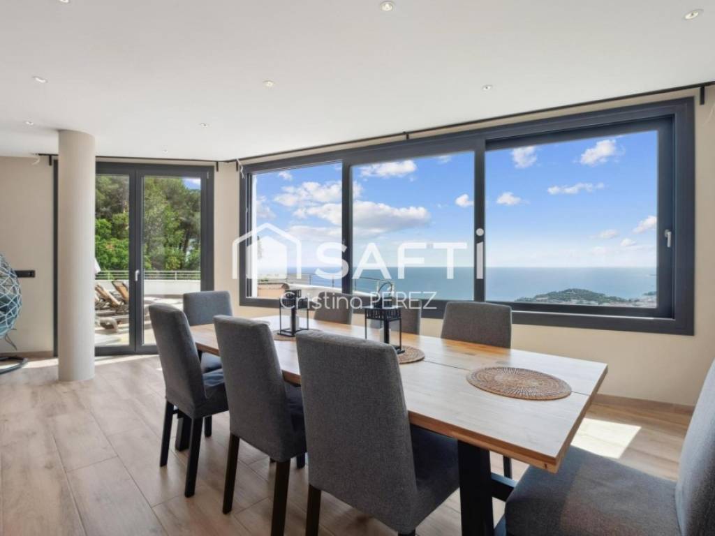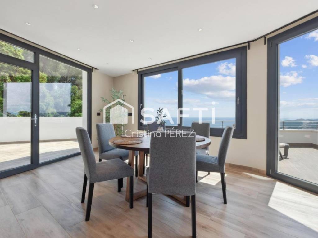 The property is distributed over three comfortable levels, with the possibility of installing an elevator. It features a spacious and bright main living room with a linear fireplace, a modern open-plan kitchen perfectly integrated into the space with access to a sea-view terrace, five spacious bedrooms, and five bathrooms (three of which are en-suite). Large garage and a spacious multi-purpose room.