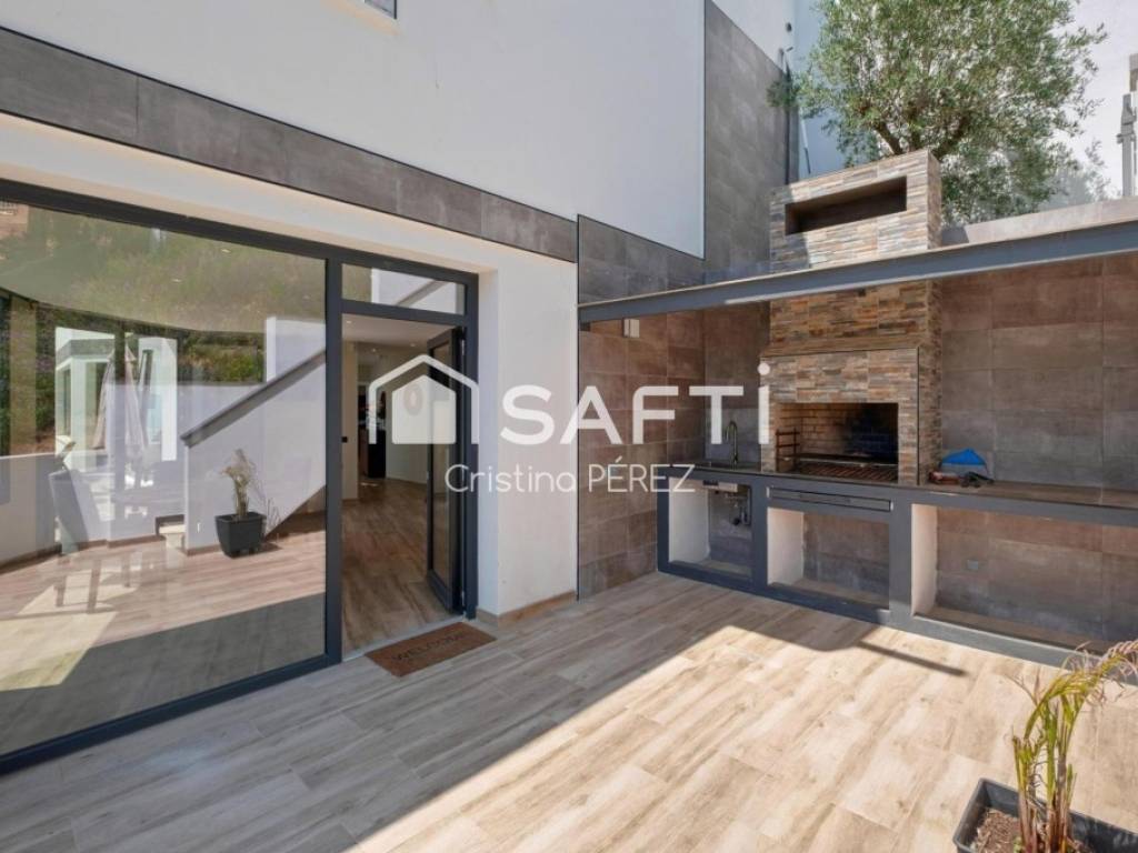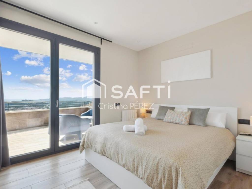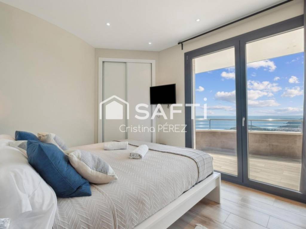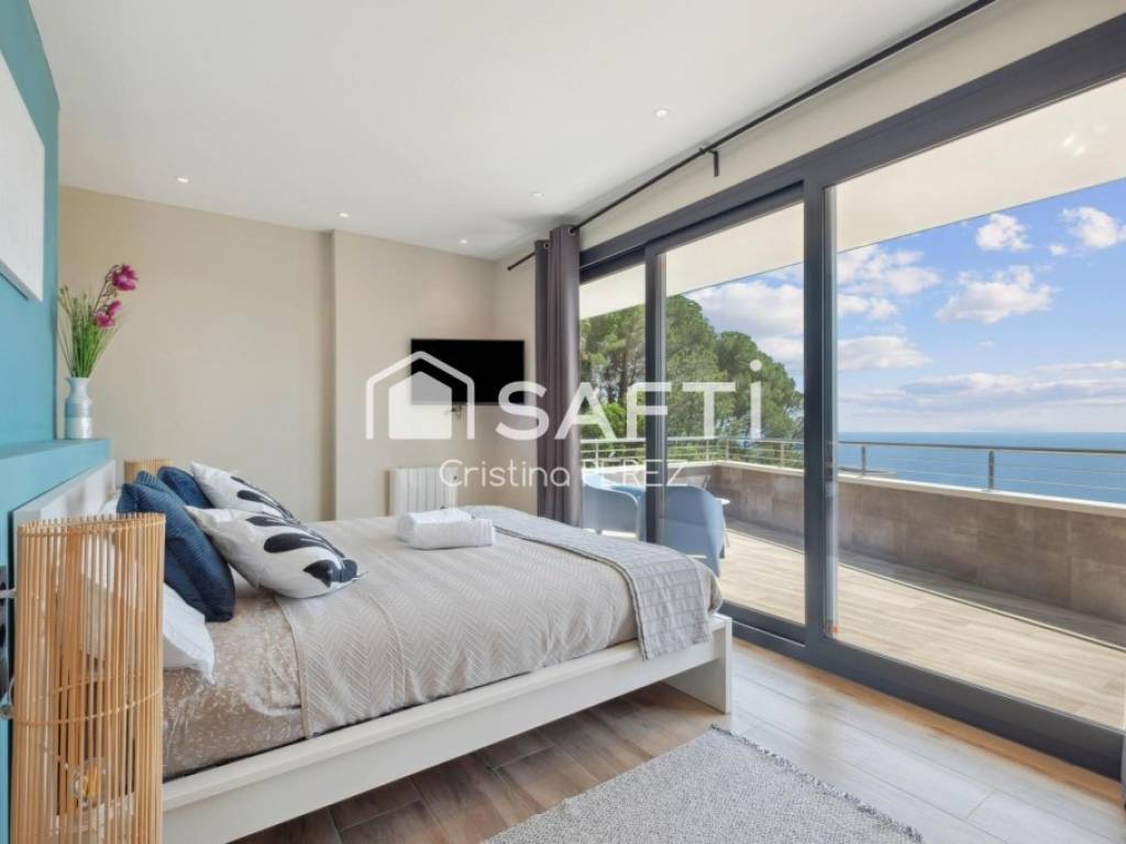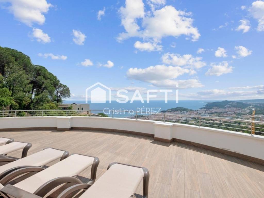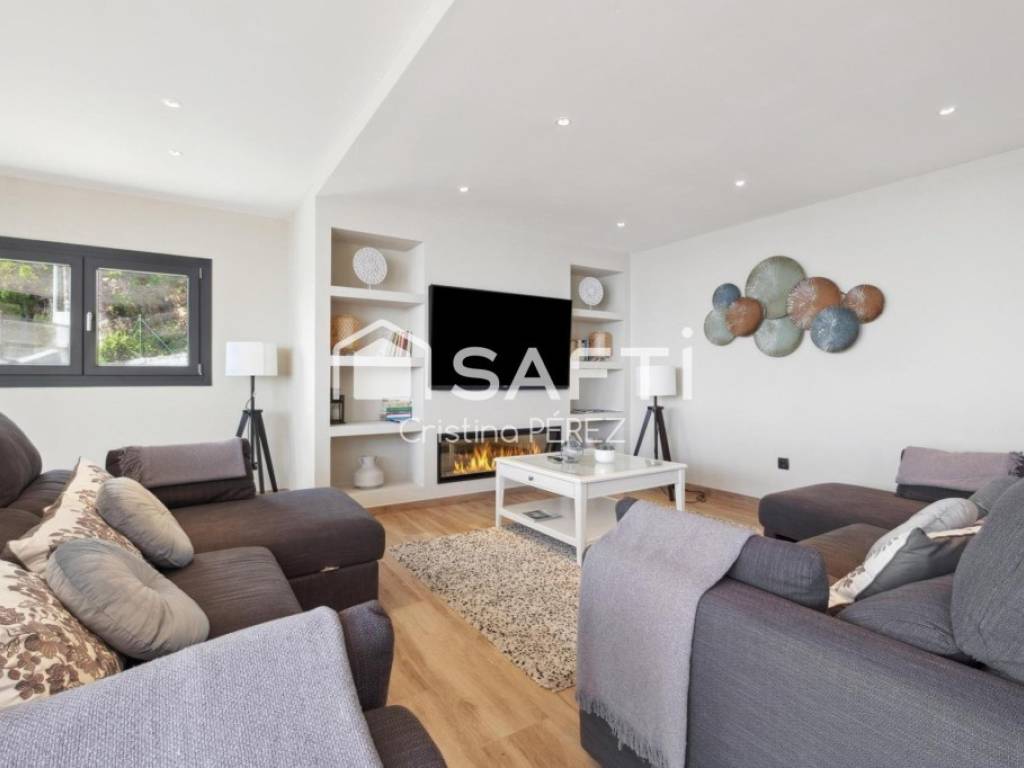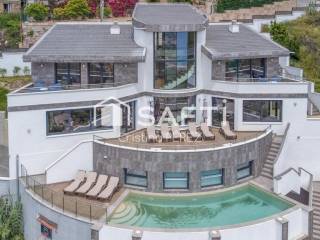 The property is distributed over three comfortable levels, with the possibility of installing an elevator. It features a spacious and bright main living room with a linear fireplace, a modern open-plan kitchen perfectly integrated into the space with access to a sea-view terrace, five spacious bedrooms, and five bathrooms (three of which are en-suite). Large garage and a spacious multi-purpose room.
