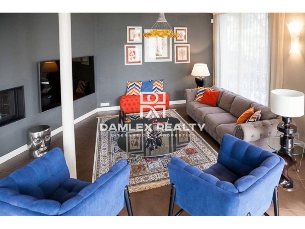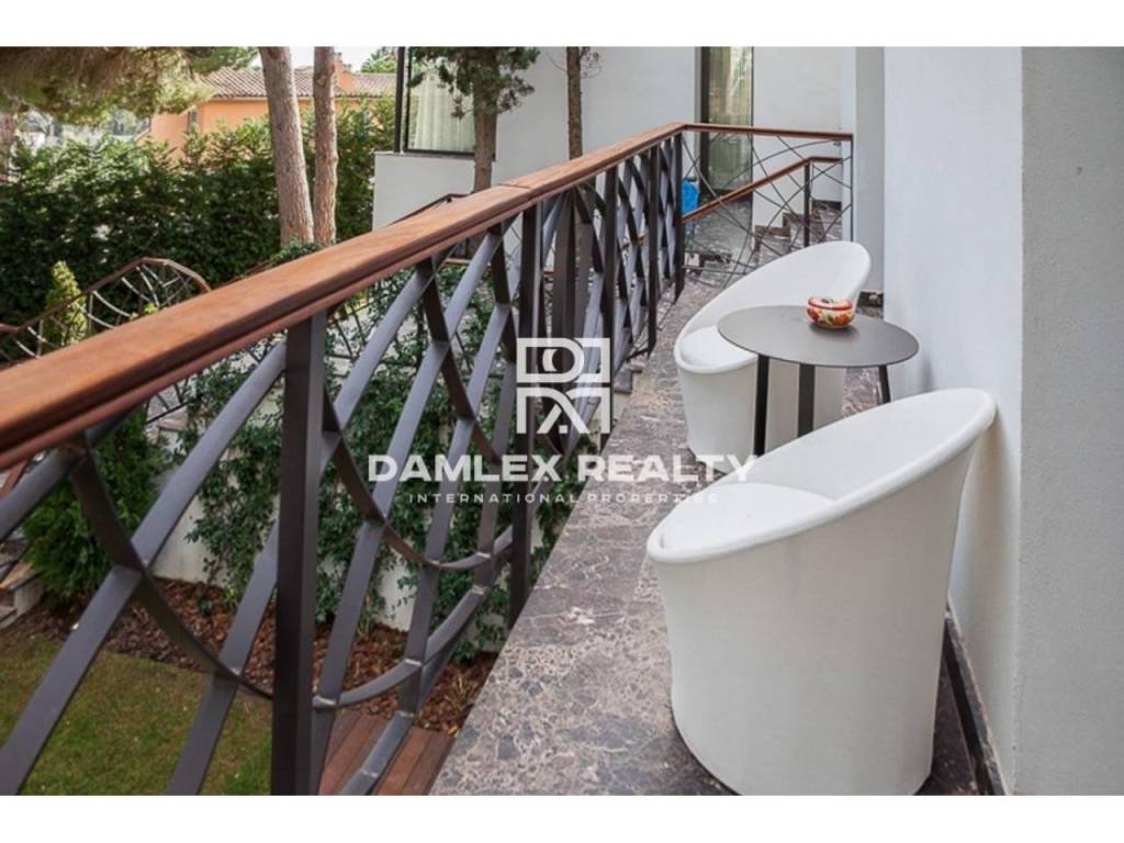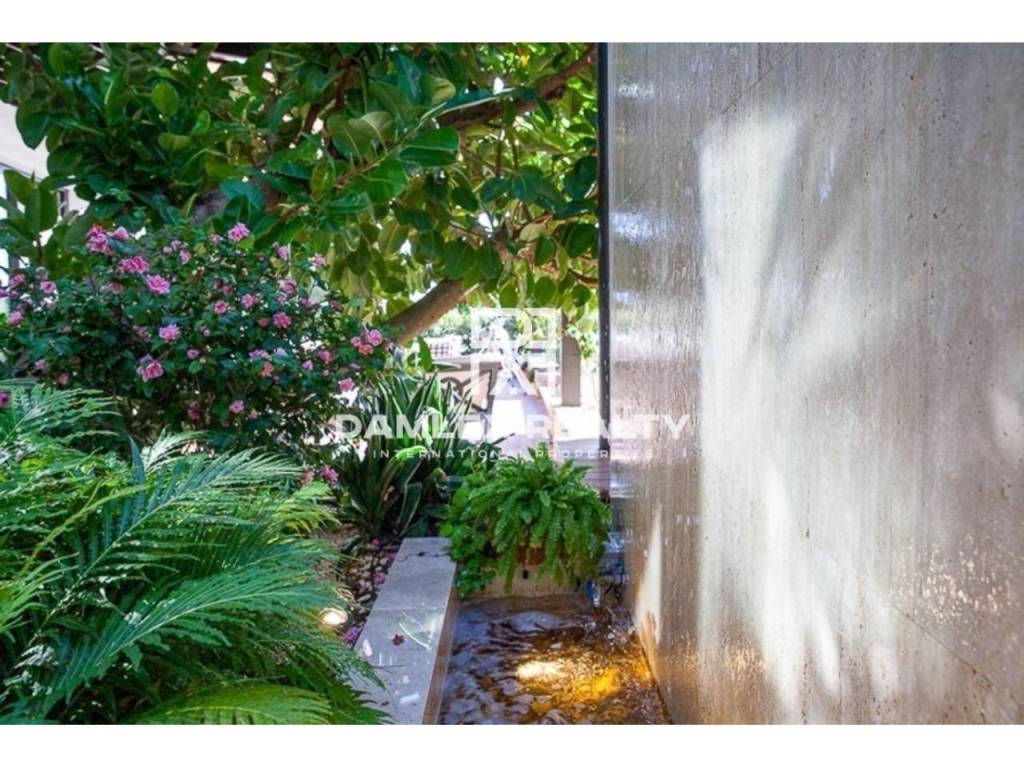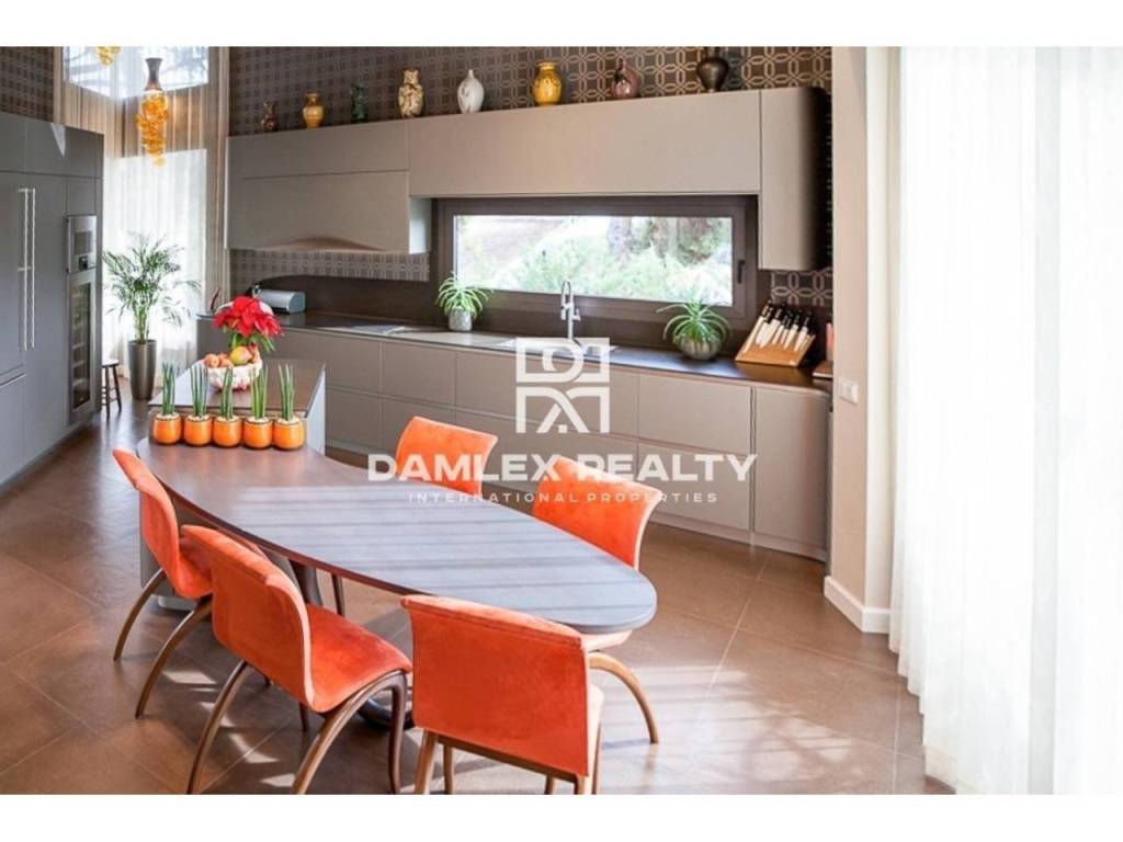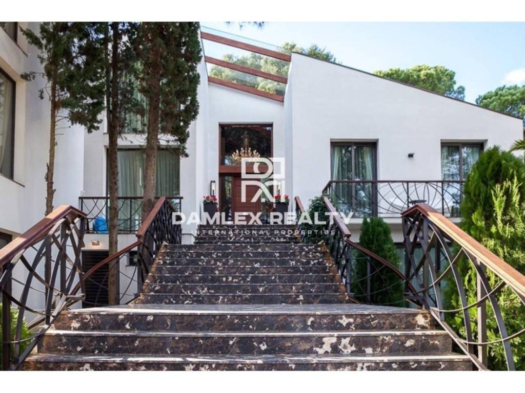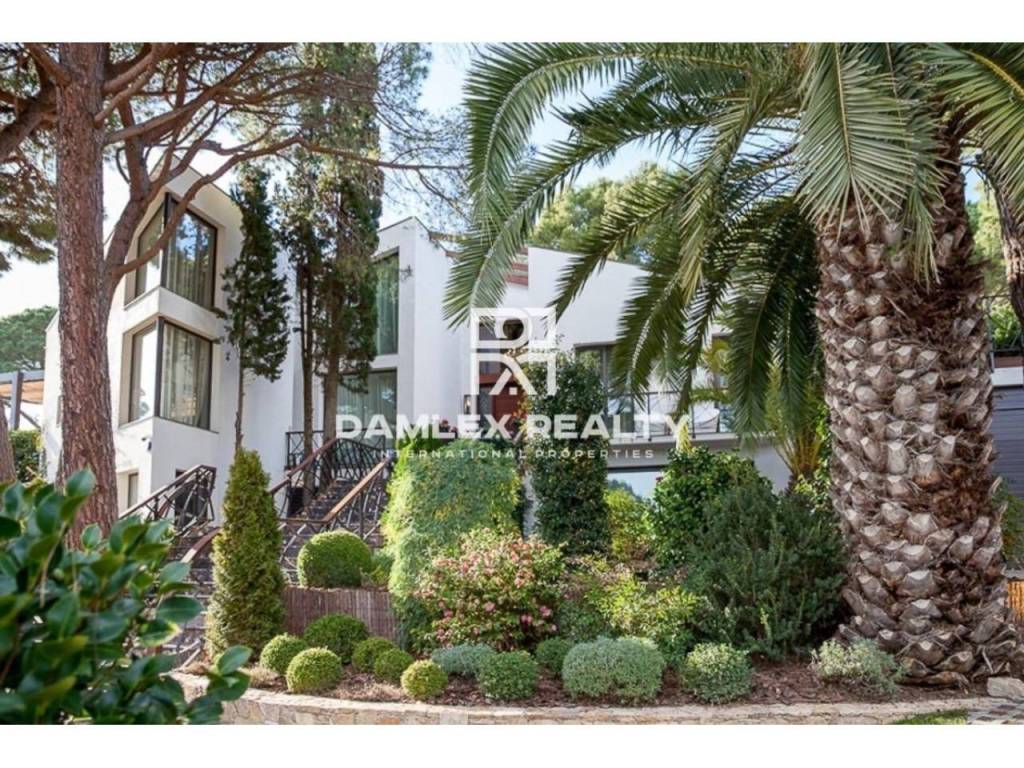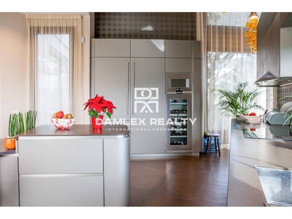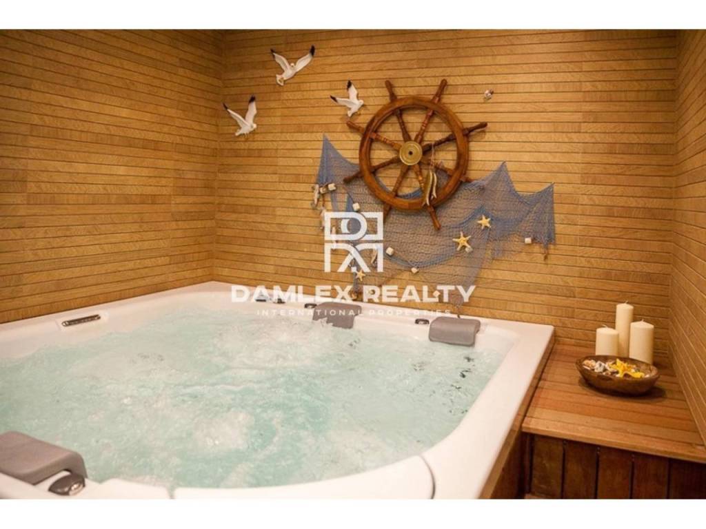 Modern Villa with unique design is located in the town of Calonge. This property for sale in Costa Brava is 500 m2. Large plot of 1600 m2 has a stunning garden and pool.This house in Costa Brava has 2 floors, 6 bedrooms, 4 bathrooms. On the ground floor there is a spacious living room with a two-level ceiling. Large panoramic windows offer magnificent view of the sea. The villa is sold fully furnished. For the interior decoration of the villa used the best materials and installed Italian kitchen furniture by Roche Bobois. Also in the house is installed elite appliances, Italian sanitary engineering, parquet flooring and outdoor staircase of marble. The house has a home cinema, SPA Zone with sauna and jacuzzi with stunning relaxation area.The villa has video surveillance, internet, heating and air conditioning. This house for sale in Costa Brava is located just 500 meters from the sea.