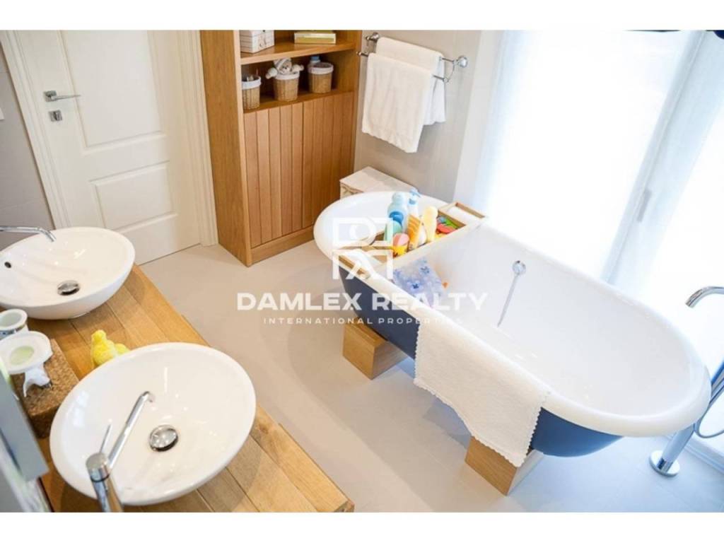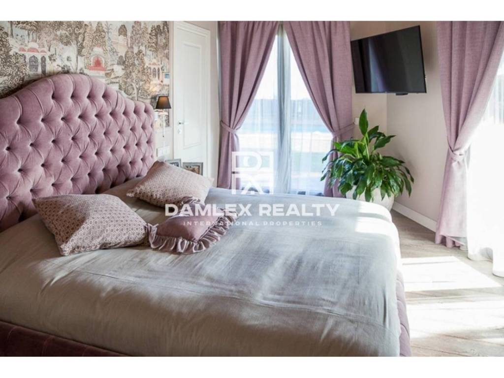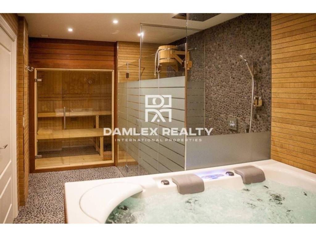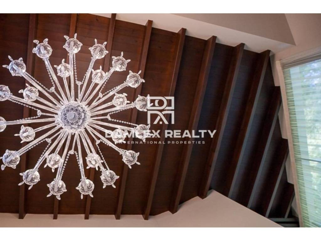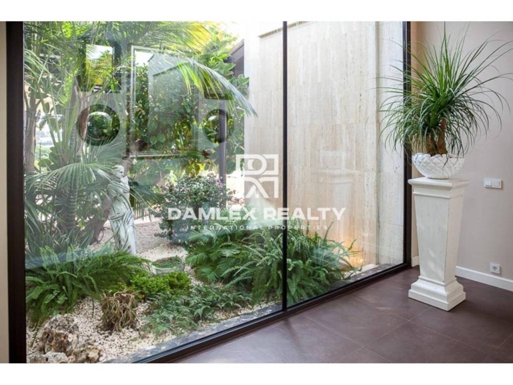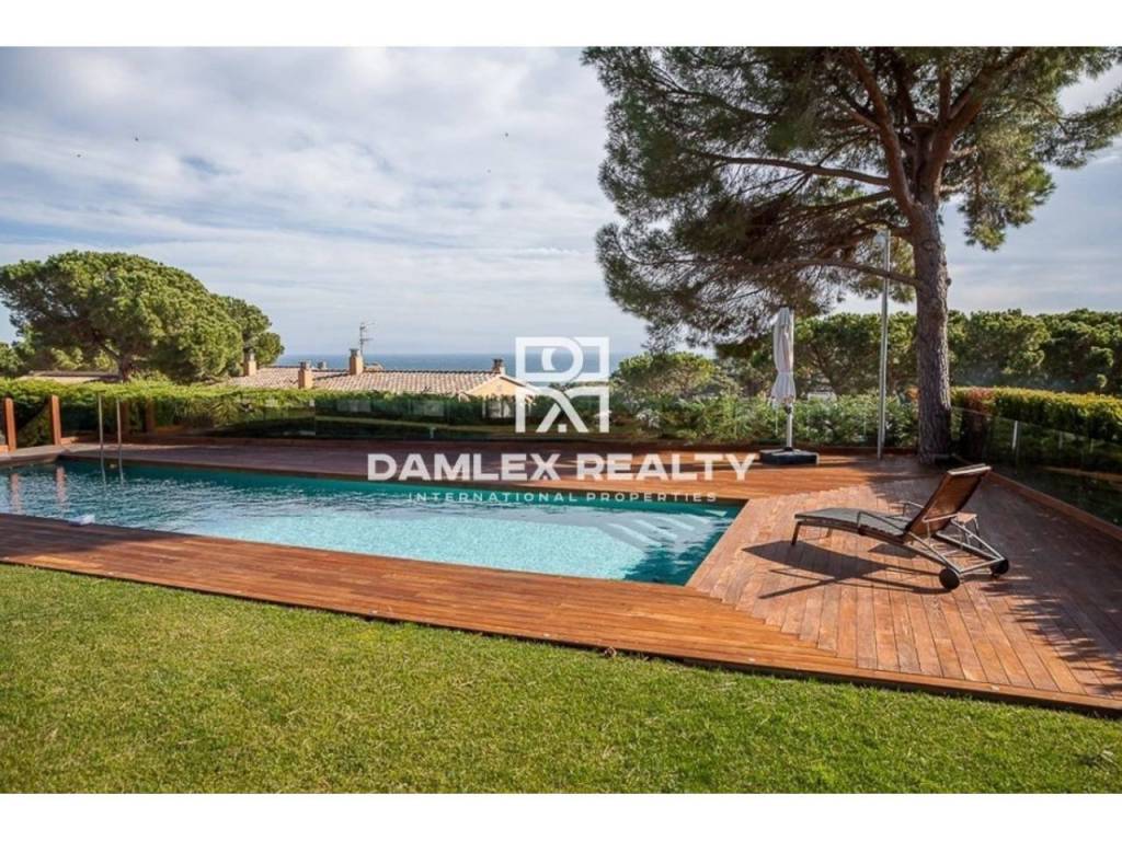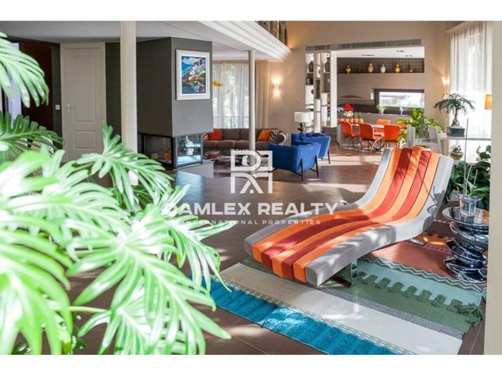 Modern Villa with unique design is located in the town of Calonge. This property for sale in Costa Brava is 500 m2. Large plot of 1600 m2 has a stunning garden and pool.This house in Costa Brava has 2 floors, 6 bedrooms, 4 bathrooms. On the ground floor there is a spacious living room with a two-level ceiling. Large panoramic windows offer magnificent view of the sea. The villa is sold fully furnished. For the interior decoration of the villa used the best materials and installed Italian kitchen furniture by Roche Bobois. Also in the house is installed elite appliances, Italian sanitary engineering, parquet flooring and outdoor staircase of marble. The house has a home cinema, SPA Zone with sauna and jacuzzi with stunning relaxation area.The villa has video surveillance, internet, heating and air conditioning. This house for sale in Costa Brava is located just 500 meters from the sea.
