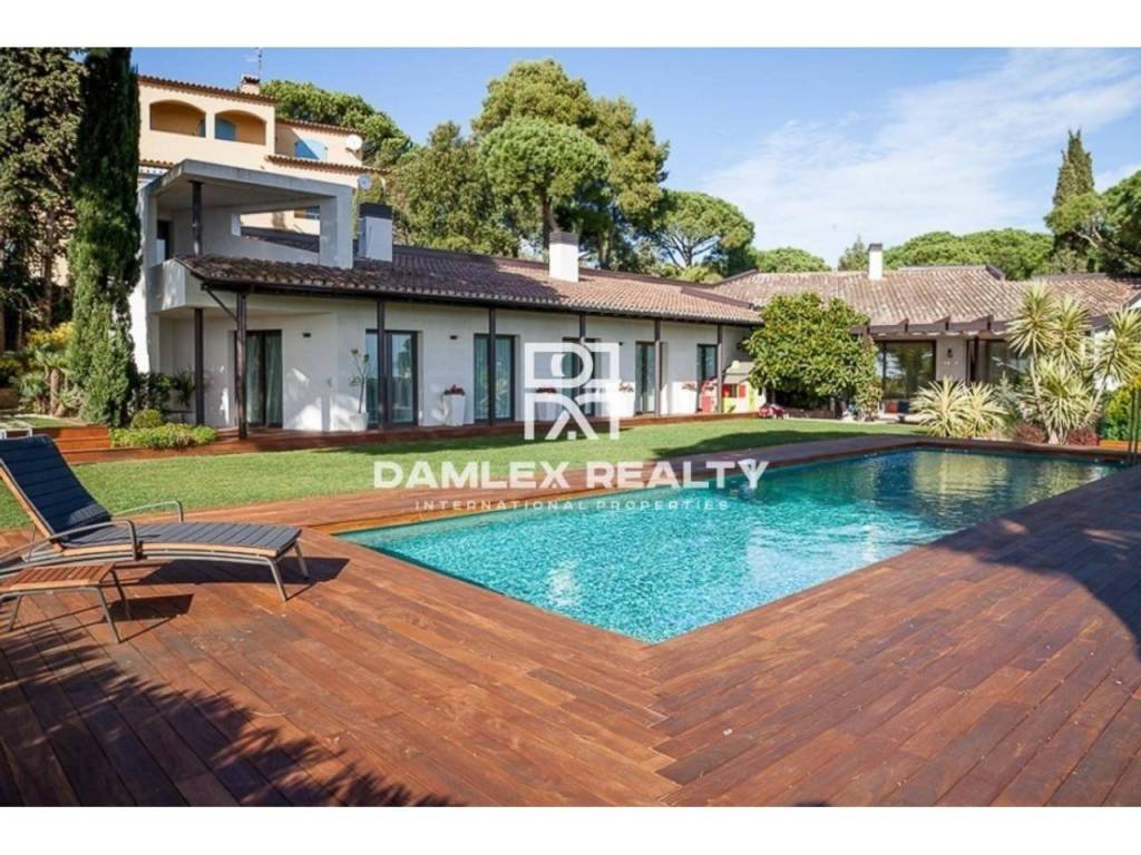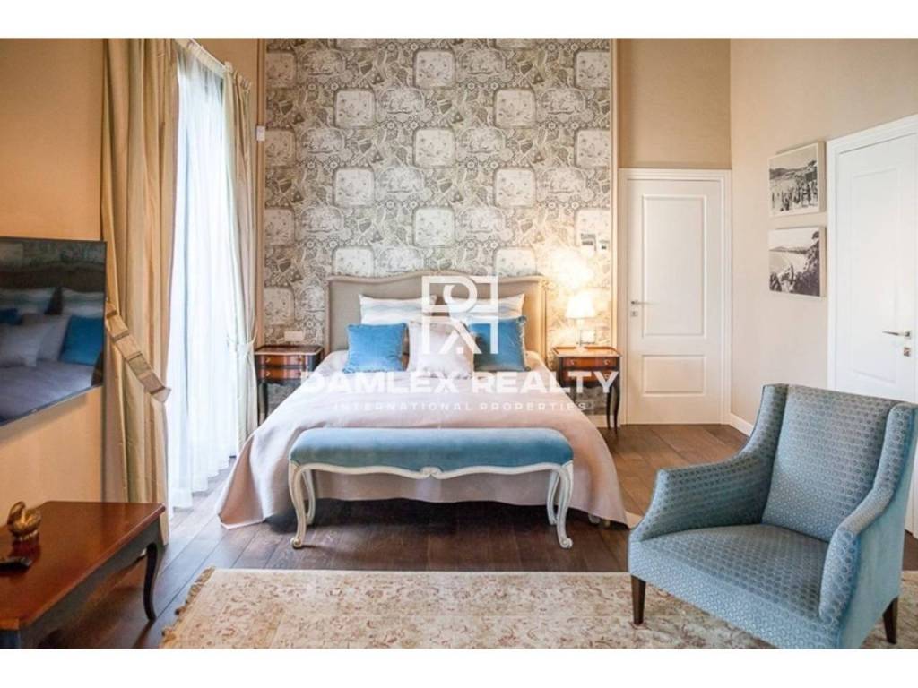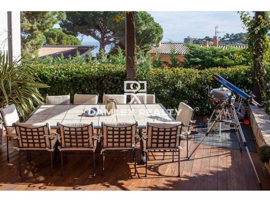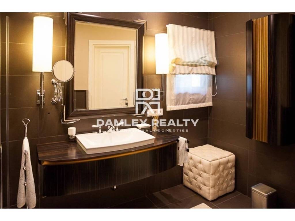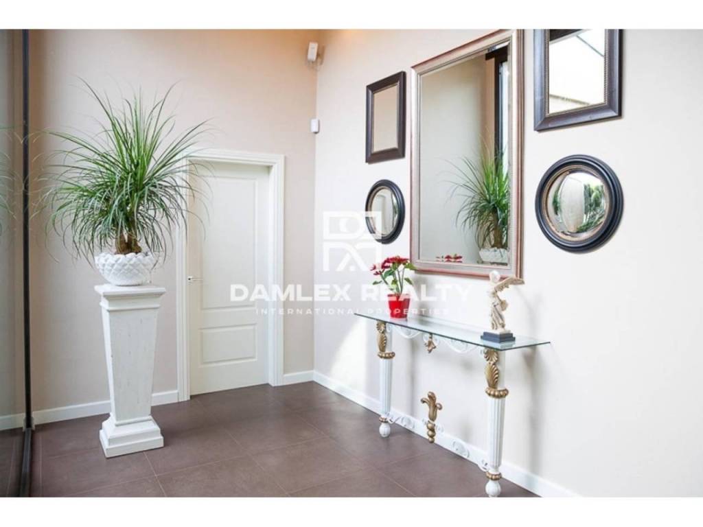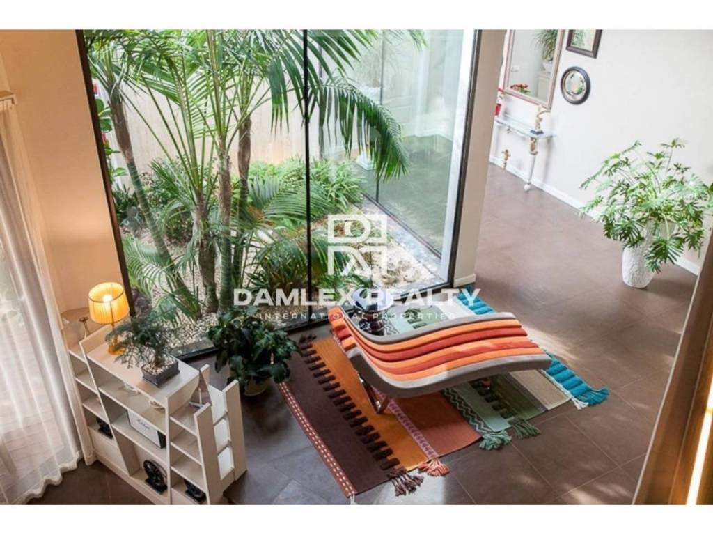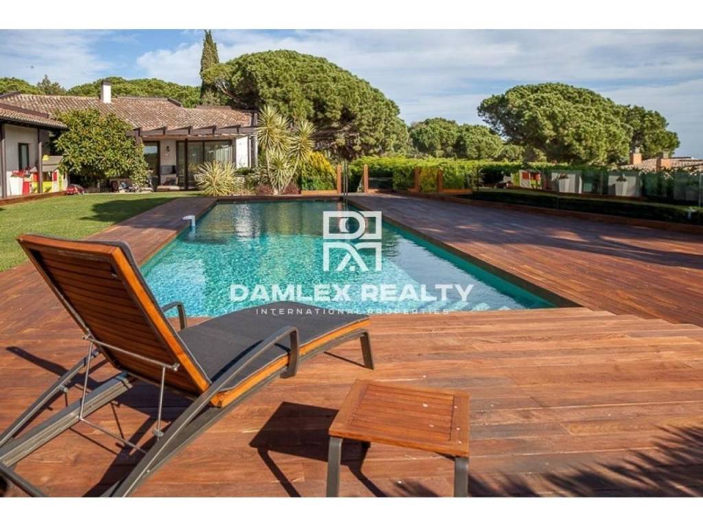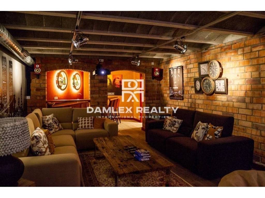 Modern Villa with unique design is located in the town of Calonge. This property for sale in Costa Brava is 500 m2. Large plot of 1600 m2 has a stunning garden and pool.This house in Costa Brava has 2 floors, 6 bedrooms, 4 bathrooms. On the ground floor there is a spacious living room with a two-level ceiling. Large panoramic windows offer magnificent view of the sea. The villa is sold fully furnished. For the interior decoration of the villa used the best materials and installed Italian kitchen furniture by Roche Bobois. Also in the house is installed elite appliances, Italian sanitary engineering, parquet flooring and outdoor staircase of marble. The house has a home cinema, SPA Zone with sauna and jacuzzi with stunning relaxation area.The villa has video surveillance, internet, heating and air conditioning. This house for sale in Costa Brava is located just 500 meters from the sea.
