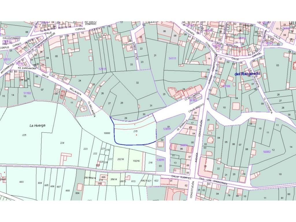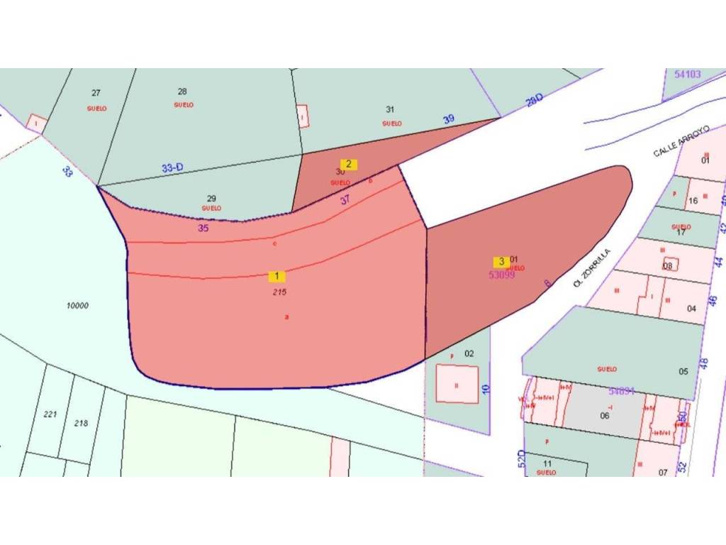 - 1.640 m² de SUC (Suelo urbano consolidado) - Parte de la parcela catastral 5309901TN8250N0001JM. Ordenanza de aplicación: RC-C2 Residencial colectivo en manzana cerrada sin patio. - 1.084 m² de SUNC 05 (Suelo urbano no consolidado) - Parte de la 24145A019002150000JA (601 m²), delimitada al sur por el arroyo y la totalidad de la 5211130TN8251S0001UW (483 m²). Para la que se ha creado la dep. 1002. - 4.128 m² de SUZ 15 (Suelo urbanizable) - Parte de la 24145A019002150000JA (4.005 m²) y parte de la 5309901TN8250N0001JM (123 m²)