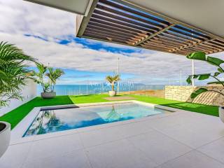 Luxury bungalow in a spectacular beachfront location in Costa Adeje! The bungalow is designed to maximize sunshine from the terrace throughout the day, offering stunning views of the beach and sea. It features three bedrooms, four bathrooms, a living-dining room, a fully equipped kitchen with an island, and a front terrace with a private pool. High-quality, contemporary materials are used throughout.