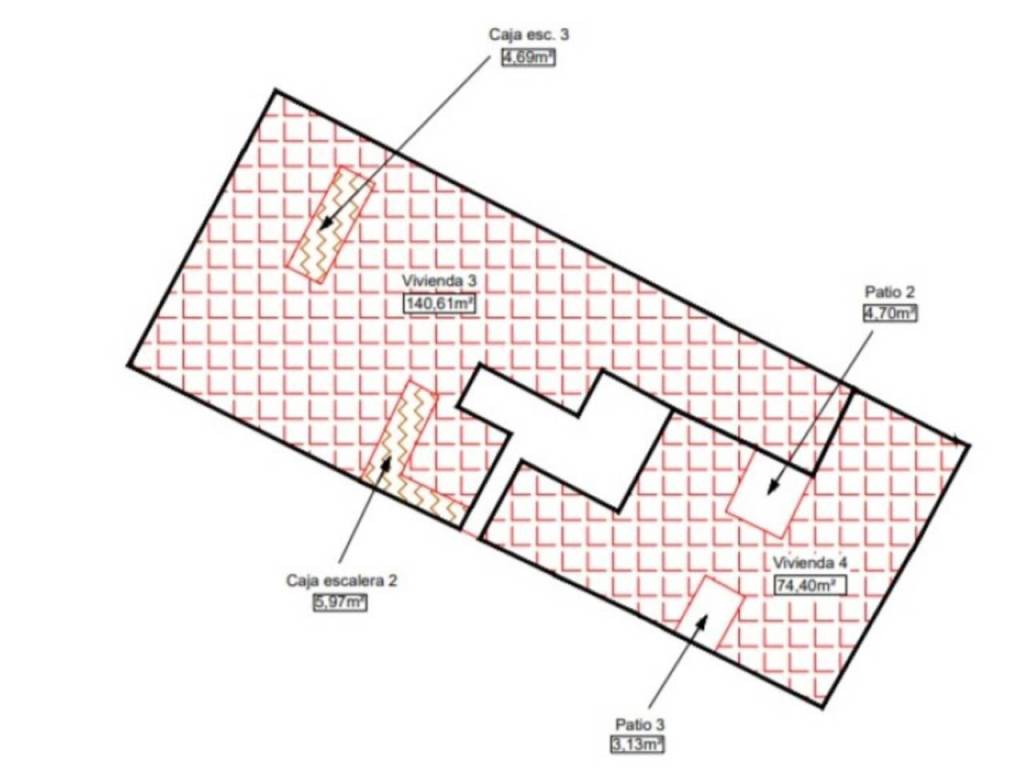 • Planta Primera 01, con una superficie construida de 225,67 m², destinados en su mayoría a dos viviendas (Vivienda 3 y Vivienda 4). La Vivienda 3 tiene una superficie de 140,61 m² y la Vivienda 4 de 74,40 m². En esta planta también existe una caja escalera situada al oeste de edificación (Caja escalera 3) con una superficie de 4,69 m² y otra caja escalera situada al sur de la edificación (Caja escalera 2) con una superficie de 5,97 m². Ambas cajas de escalera sirven para acceder a la Vivienda 3, aunque la Caja escalera 2 también sirve para acceder a la planta 2ª. En esta planta existen dos patios (Patio 2 y Patio 3) situados al este de la edificación, afectando a la Vivienda 4, con unas superficies de 4,70 m² y 3,13 m² respectivamente. La vivienda 4 tiene su acceso a través de la galería y el patio central (Patio 1) a través de unas escaleras exteriores (Escalera exterior 1). Puedes ver el PLANO SUPERFICIES PLANTA PRIMERA 01 en la sección de imágenes.