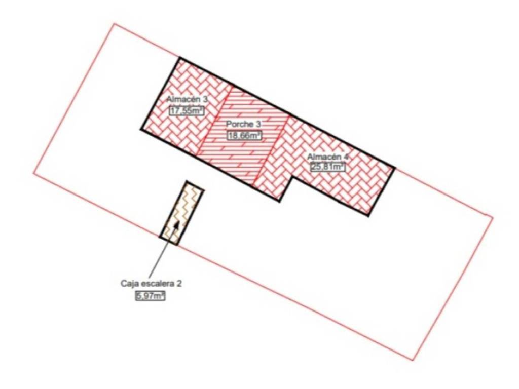 • Planta Segunda 02, con una superficie construida de 49,33 m², destinados a almacenes o trasteros (Almacén 3 y Almacén 4), de 17,55 m² y 25,81 m² respectivamente, y a caja escalera (Caja escalera 2) de 5,97 m². En esta planta también existe un porche (Porche 3) situado entre ambos almacenes con una superficie de 18,66 m². Puedes ver el PLANO SUPERFICIES PLANTA SEGUNDA 02 en la sección de imágenes.