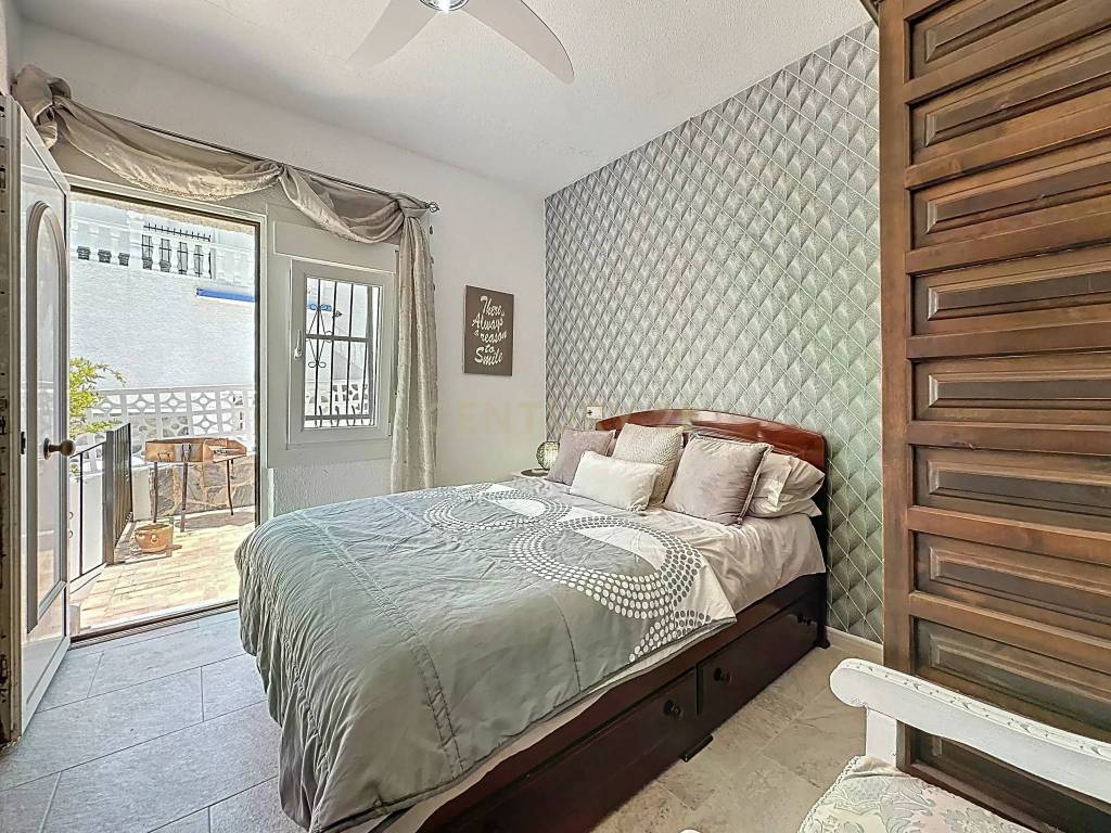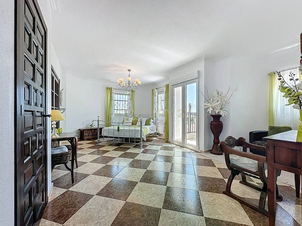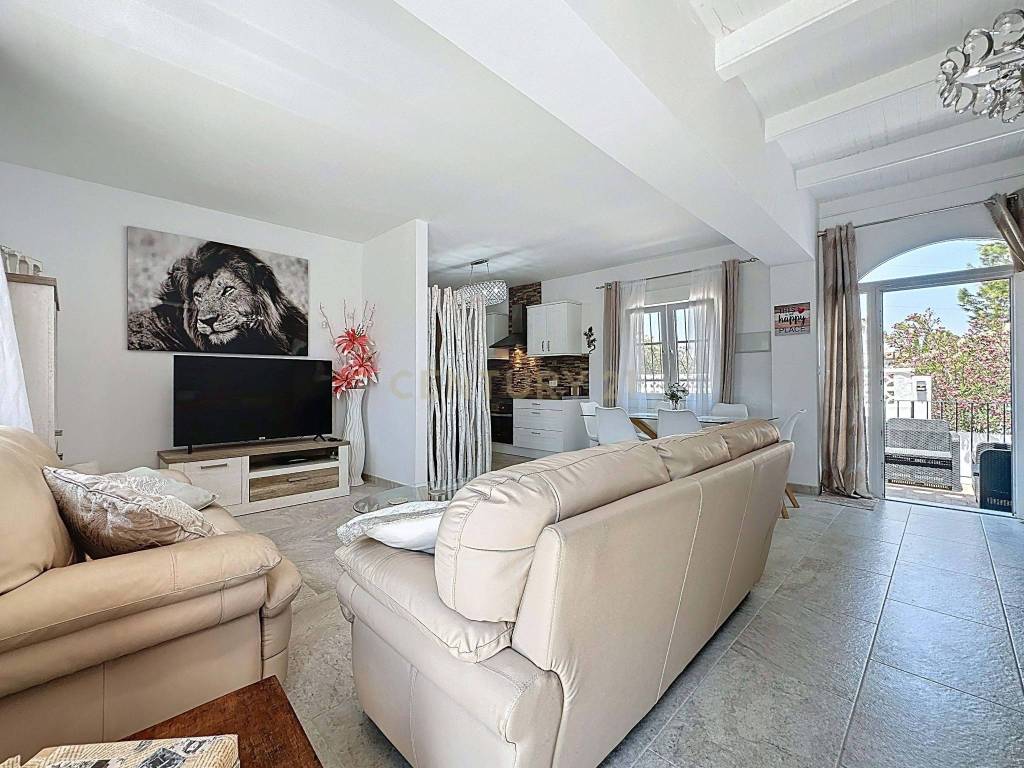 The home is distributed over two floors. The main floor features a spacious and bright living-dining room with an integrated kitchen, a large master bedroom with a walk-in wardrobe and en-suite bathroom, two double bedrooms, and a full bathroom with both shower and bathtub. From this level, there is direct access to an outdoor terrace that connects to a large solarium with storage roomideal for enjoying the sun, sea breeze, and sea views.