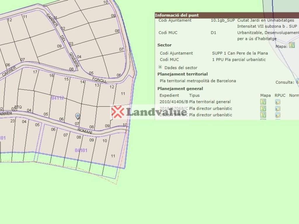 Ordenanza: 10.1gb_SUP Ciutat Jardí. Parcela mínima: 800 m2s. Ocupación: 15 %. Coef. Edif: 0,45 m2e/m2s. Longitud mínima de fachada: 20 m. Altura: 11 m. Retranqueos: 10 m a viario y 5 m en el resto de linderos