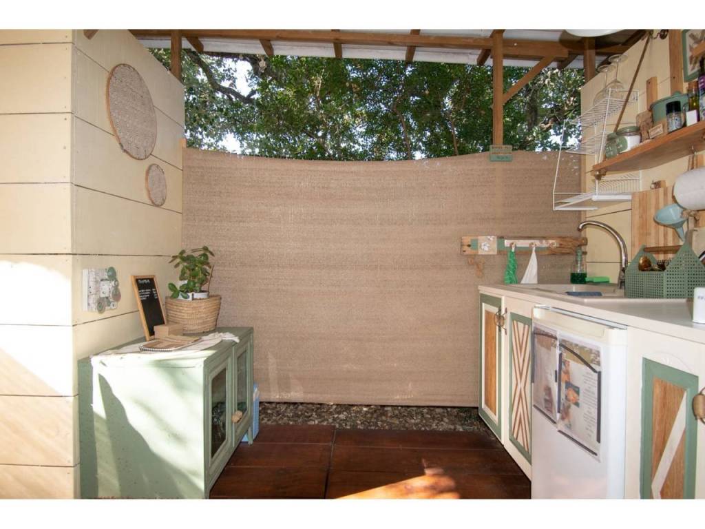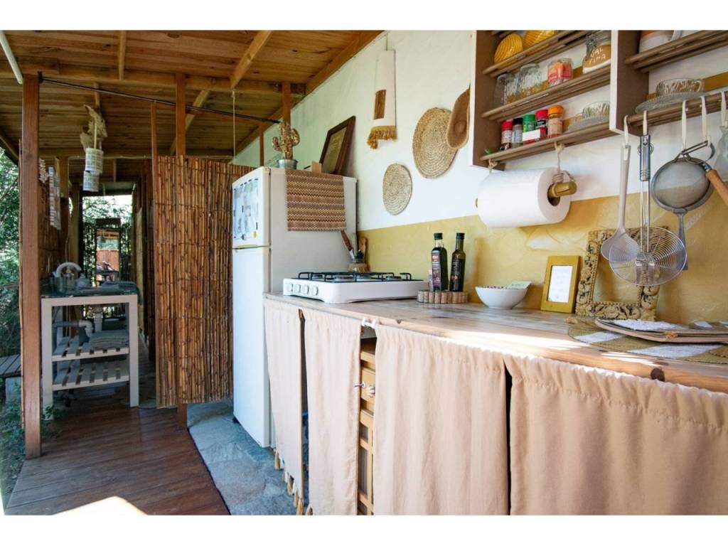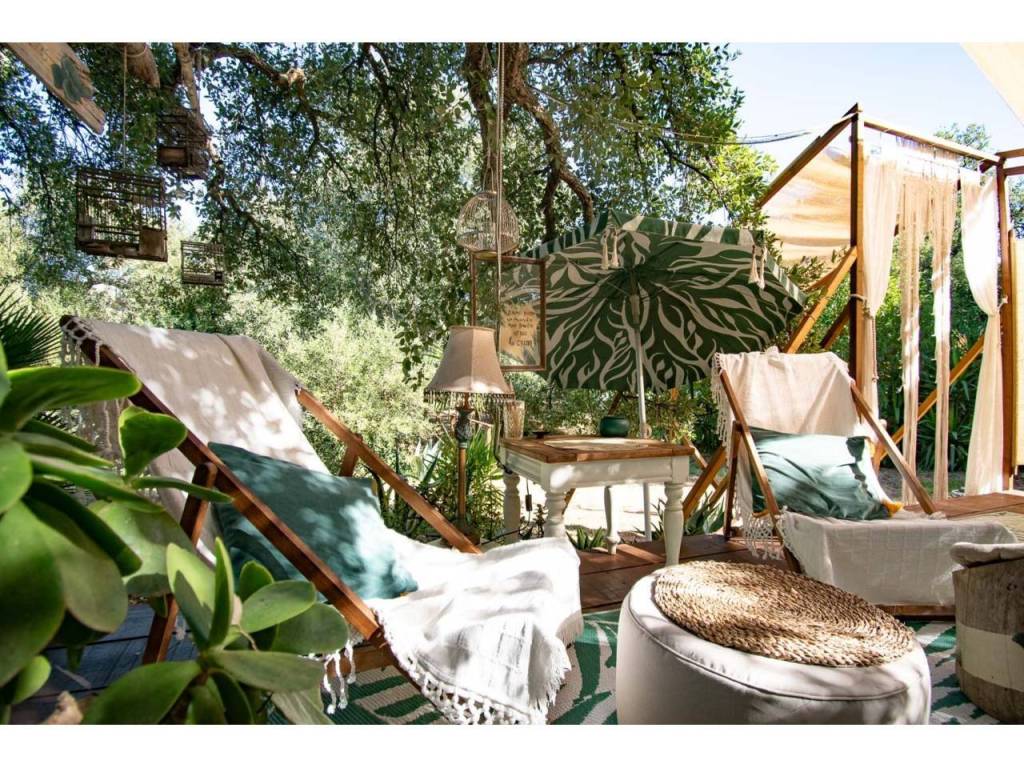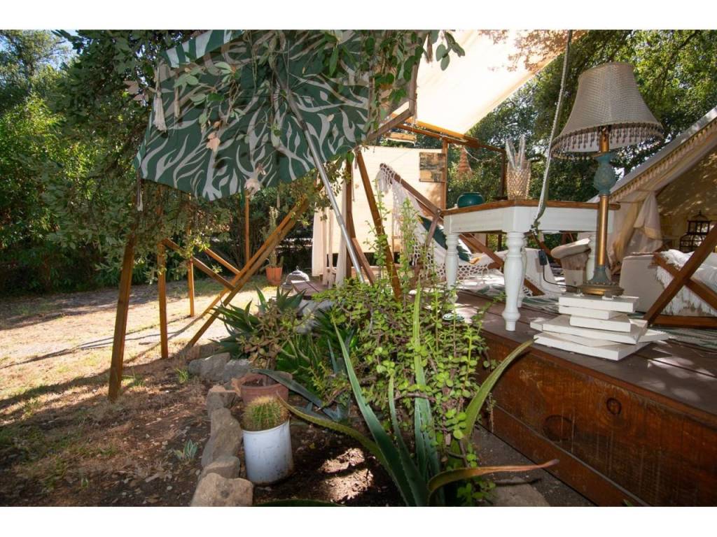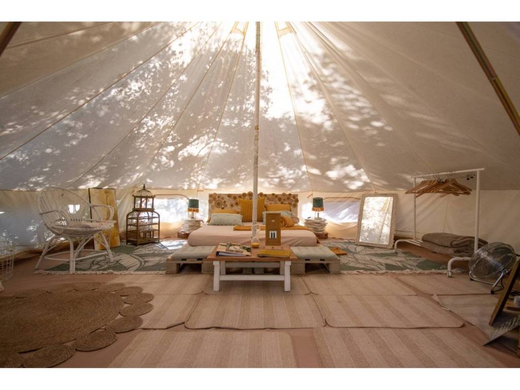 The grounds have been thoughtfully designed to host two spacious glamping tents, each privately positioned and equipped with their own kitchens, bathrooms, and lounge areas. Elegantly decorated to harmonize with the natural setting, they offer guests (or visitors) the ideal place to unwind and immerse themselves in the surrounding peace and greenery.