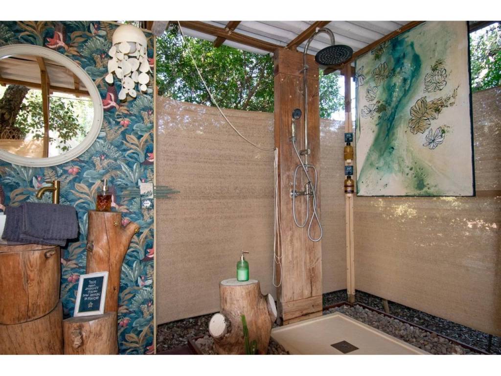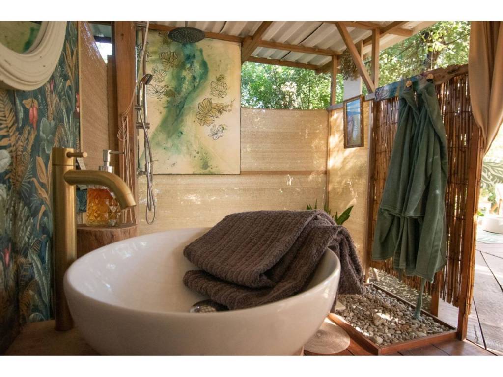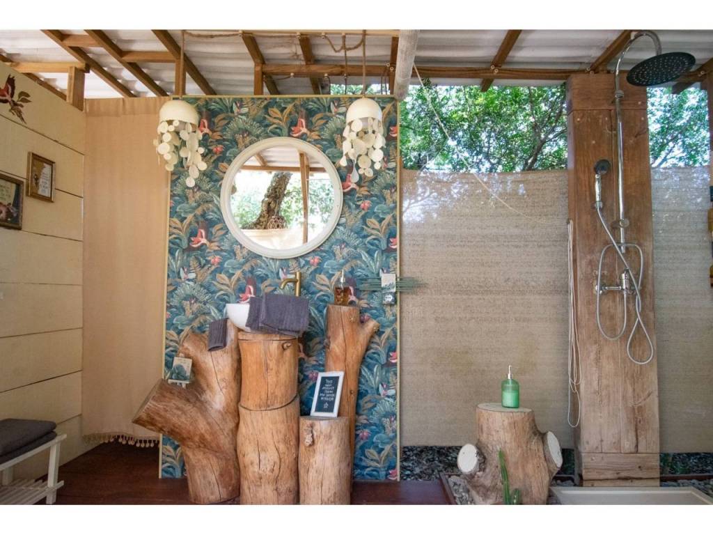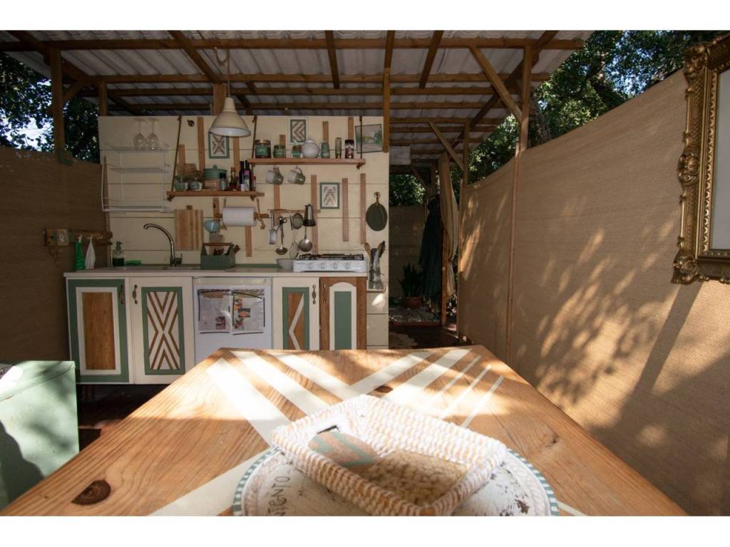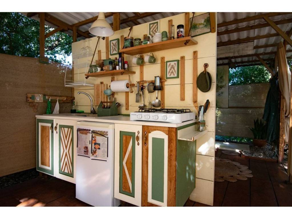 The grounds have been thoughtfully designed to host two spacious glamping tents, each privately positioned and equipped with their own kitchens, bathrooms, and lounge areas. Elegantly decorated to harmonize with the natural setting, they offer guests (or visitors) the ideal place to unwind and immerse themselves in the surrounding peace and greenery.