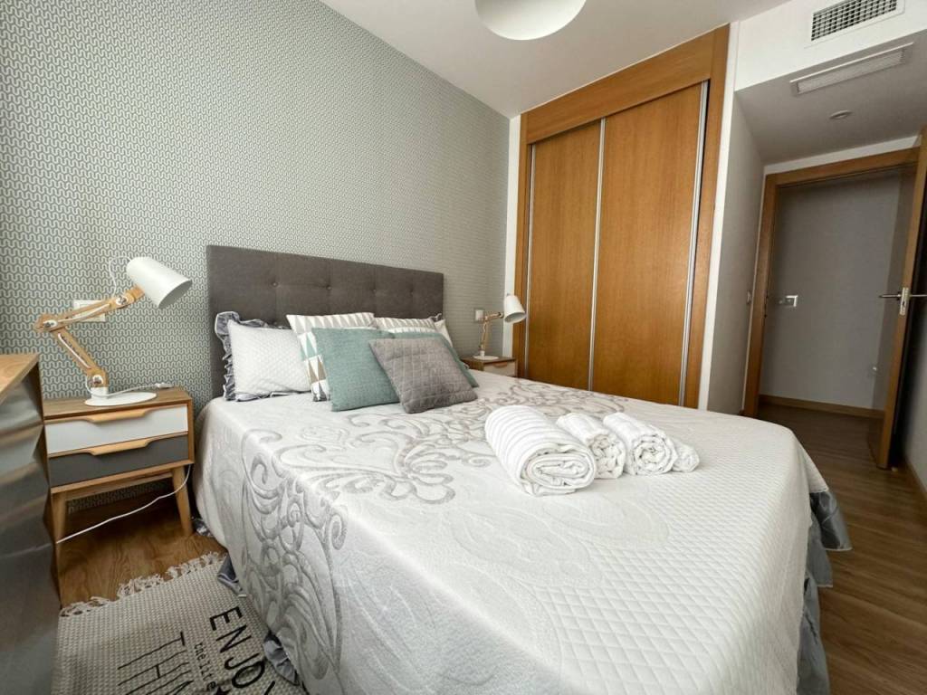 Habitación 2: Acogedor dormitorio con cama doble (canapé abatible), ropa de cama, mesitas de noche, lámparas, silla, armario empotrado, buena ventilación y excelente iluminación natural.
