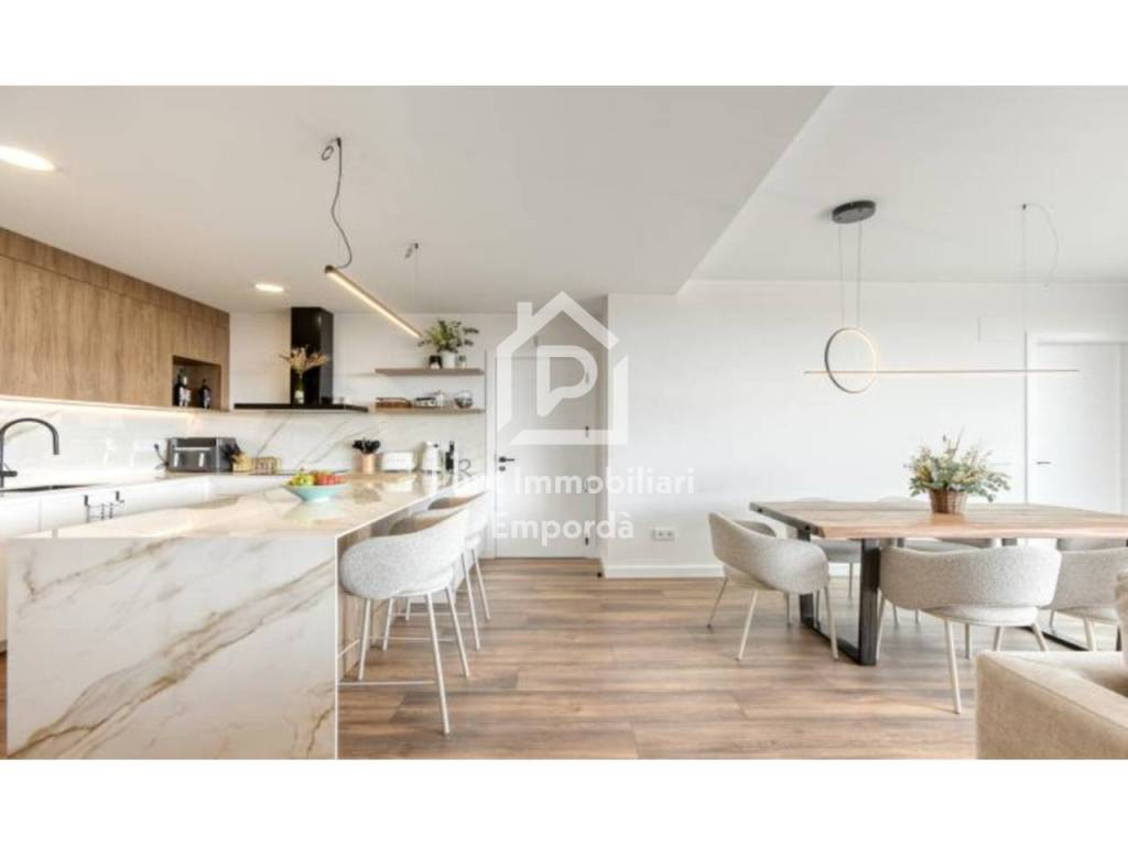 The open kitchen, fully equipped with high-end appliances, integrates perfectly with the living room and dining room. The vinyl floor imitation oak adds a rustic and elegant character to the space. The central ceramic island with wood-effect veins is a true luxury that combines functionality and design.