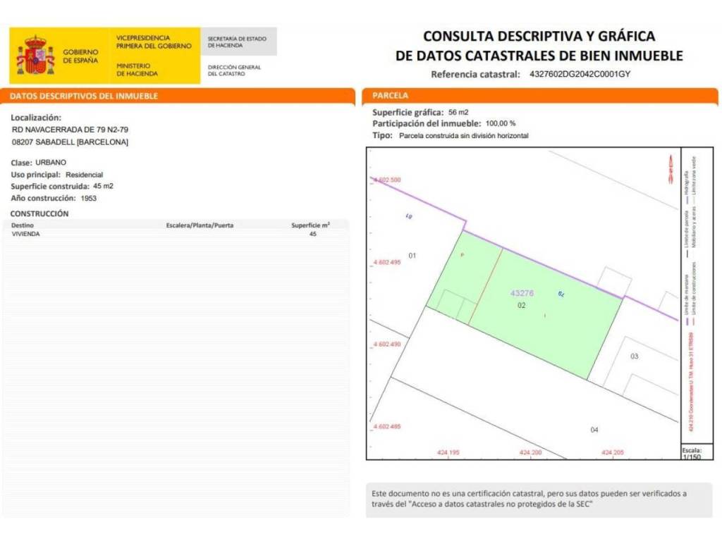 El inmueble ha sido adquirido a través de un procedimiento judicial (concursal o hipotecario) por el vendedor, el cual no ha tomado todavía posesión del mismo. El Inmueble se transmite sin conocerse por parte del Vendedor el estado de conservación actual, ni su situación ocupacional, arrendaticia, de servicios y de suministros. El Inmueble se transmitirá: (i) como cuerpo cierto y a tanto alzado (ii) como un todo, inseparable (iii) en el estado registral y catastral en el que se encuentre (iv) en el estado físico, calidades, jurídico, urbanístico, administrativo, de licencias, de protección, de conservación y limpieza en el que se encuentre (v) al corriente de gastos e impuestos que por Ley corresponda al Vendedor y (vi) sin dotación de servicios y suministros. El Adquirente asumirá: (i) la situación física y estado de conservación (ii) la situación urbanística (iii) las discrepancias entre la realidad física y la realidad registral y catastral o en la cabida del Inmueble (iv) la adecuación registral y catastral del Inmueble y (v) los tramites que conlleven la obtención de la Posesión Judicial del Inmueble. La Propiedad no responderá de/l: (i) estado de conservación (ii) los vicios vistos y aparentes (iii) la regularización registral o catastral (iv) las discrepancias de cabida, que pudieran existir (v) responsabilidad alguna en la obtención de la cédula de habitabilidad del Inmueble, salvo que en la Comunidad Autónoma donde se ubique el Inmueble sea obligatoria su entrega y (vi) cualesquiera costes, gastos, honorarios, aranceles o tributos que se deriven de lo anterior. El estado de ocupación y/o los impedimentos para que el inmueble pueda ser visitado libremente por los técnicos impedirían: i) su tasación oficial conforme exige la Orden ECO/805/2003, de 27 de marzo, por lo que el inmueble, mientras perdure la situación ocupacional, no podría ser hipotecado, en consecuencia, no podría constituirse financiación hipotecaria sobre este tipo de fincas, cuya adquisición requerirá el otorgamiento de otro tipo de garantías en caso de solicitarse financiación y ii) la obtención por parte de la propiedad del certificado de eficiencia energética. El precio de venta de este Inmueble se ha determinado en base a las anteriores circunstancias, que han supuesto un menor valor del mismo, y que deberán ser expresamente aceptadas por el adquirente en la formalización de la transmisión del Inmueble. Se recomienda que el comprador obtenga asesoramiento profesional y legal antes de adoptar la decisión de compra. , El inmueble ha sido adquirido a través de un procedimiento judicial (concursal o hipotecario) por el vendedor, el cual no ha tomado todavía posesión del mismo. El Inmueble se transmite sin conocerse por parte del Vendedor el estado de conservación actual, ni su situación ocupacional, arrendaticia, de servicios y de suministros. El Inmueble se transmitirá: (i) como cuerpo cierto y a tanto alzado (ii) como un todo, inseparable (iii) en el estado registral y catastral en el que se encuentre (iv) en el estado físico, calidades, jurídico, urbanístico, administrativo, de licencias, de protección, de conservación y limpieza en el que se encuentre (v) al corriente de gastos e impuestos que por Ley corresponda al Vendedor y (vi) sin dotación de servicios y suministros. El Adquirente asumirá: (i) la situación física y estado de conservación (ii) la situación urbanística (iii) las discrepancias entre la realidad física y la realidad registral y catastral o en la cabida del Inmueble (iv) la adecuación registral y catastral del Inmueble y (v) los tramites que conlleven la obtención de la Posesión Judicial del Inmueble. La Propiedad no responderá de/l: (i) estado de conservación (ii) los vicios vistos y aparentes (iii) la regularización registral o catastral (iv) las discrepancias de cabida, que pudieran existir (v) responsabilidad alguna en la obtención de la cédula de habitabilidad del Inmueble, salvo que en la Comunidad Autónoma donde se ubique el Inmueble sea obligatoria su entrega y (vi) cualesquiera costes, gastos, honorarios, aranceles o tributos que se deriven de lo anterior. El estado de ocupación y/o los impedimentos para que el inmueble pueda ser visitado libremente por los técnicos impedirían: i) su tasación oficial conforme exige la Orden ECO/805/2003, de 27 de marzo, por lo que el inmueble, mientras perdure la situación ocupacional, no podría ser hipotecado, en consecuencia, no podría constituirse financiación hipotecaria sobre este tipo de fincas, cuya adquisición requerirá el otorgamiento de otro tipo de garantías en caso de solicitarse financiación y ii) la obtención por parte de la propiedad del certificado de eficiencia energética. El precio de venta de este Inmueble se ha determinado en base a las anteriores circunstancias, que han supuesto un menor valor del mismo, y que deberán ser expresamente aceptadas por el adquirente en la formalización de la transmisión del Inmueble. Se recomienda que el comprador obtenga asesoramiento profesional y legal antes de adoptar la decisión de compra. ,