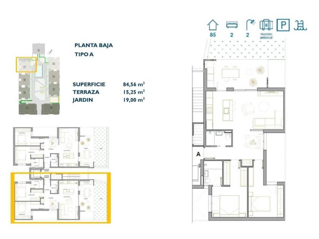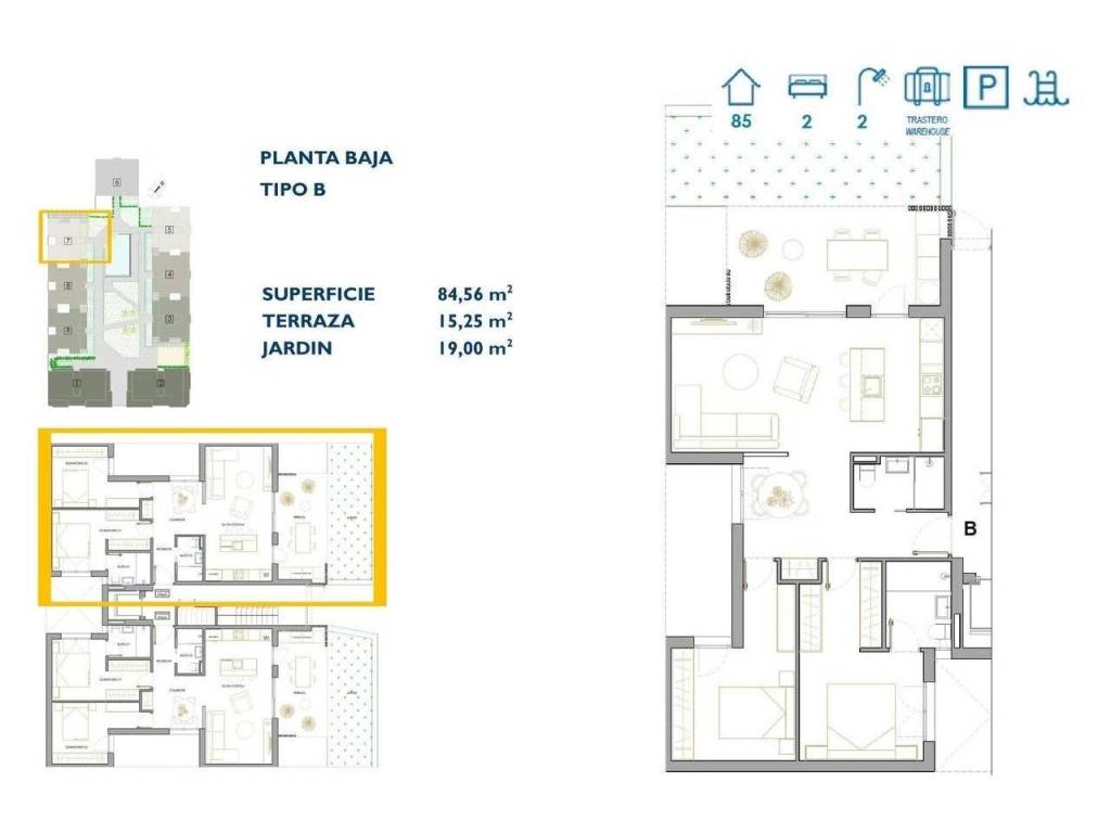 Apartments and penthouses with 2 and 3 bedrooms, 2 bathrooms, with open plan kitchen with living area, large terraces, fitted wardrobes, fully equipped bathrooms, terraces.