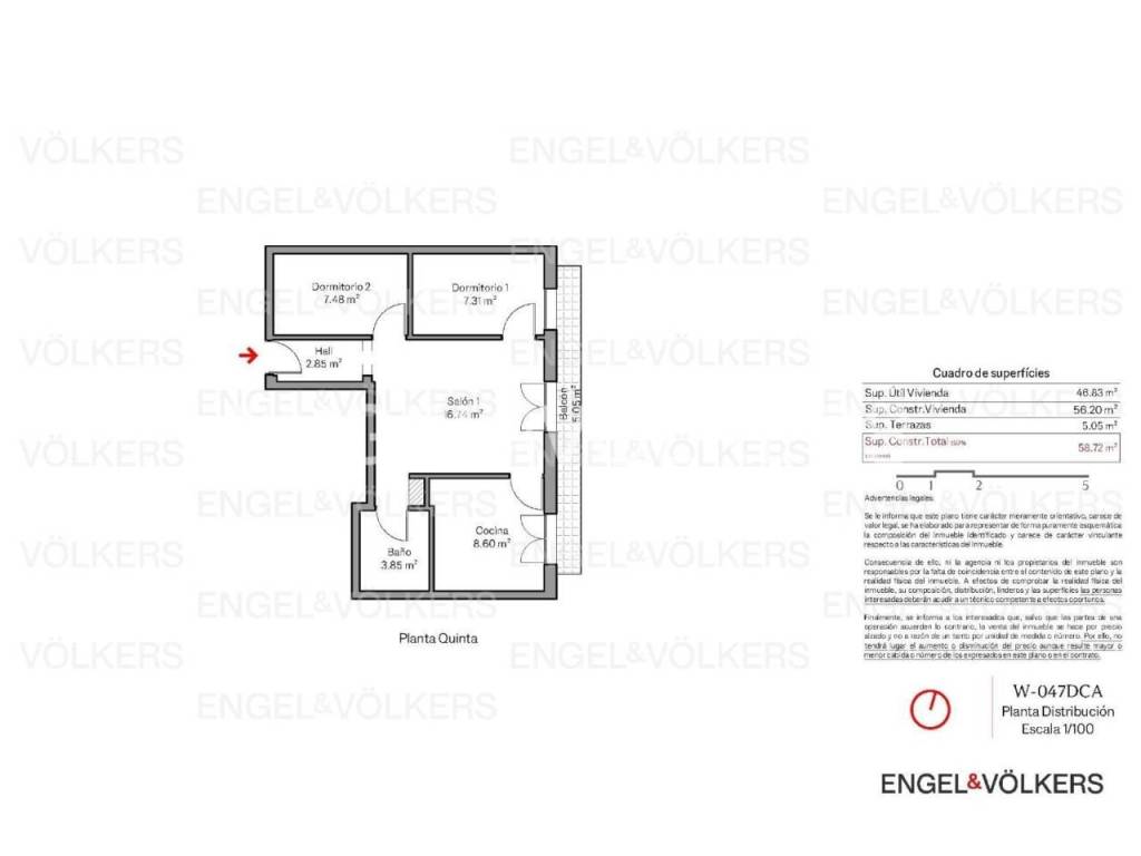 La vivienda, con 59 m² construidos y 56m2 útiles, se sitúa en un 5º piso con tres huecos a un gran patio de manzana con orientación al Este, lo que garantiza una agradable luminosidad natural durante gran parte del día. Su distribución ha sido pensada para aprovechar al máximo cada metro, ofreciendo una sensación de amplitud y comodidad. El apartamento cuenta con dos dormitorios, así como un baño completo de diseño funcional y actual.
